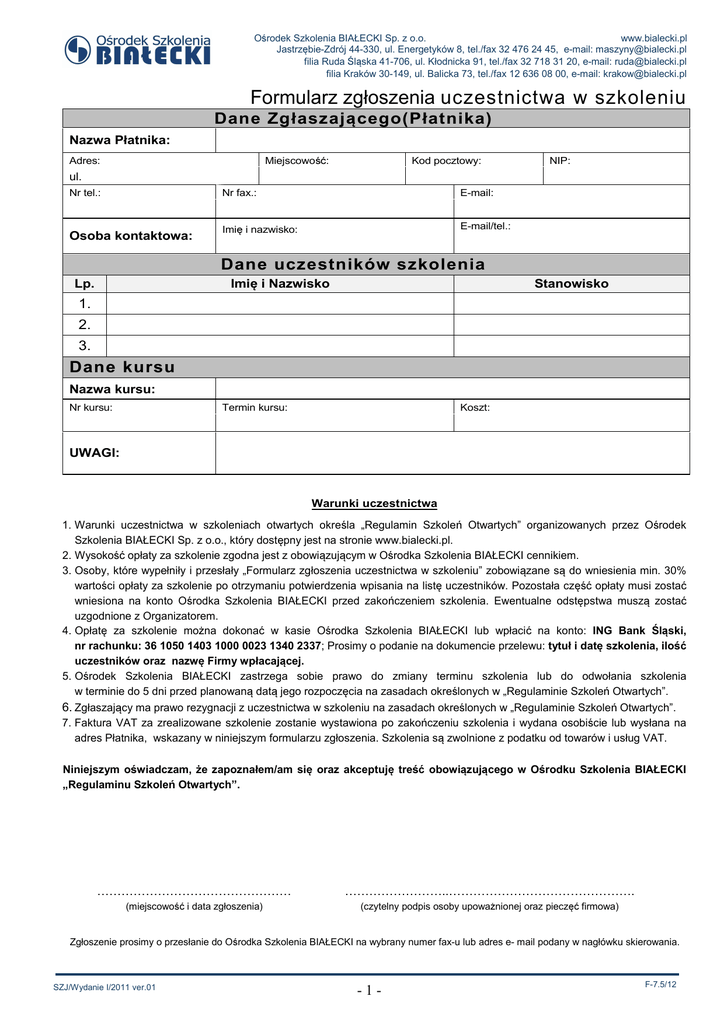 Ośrodek Szkolenia BIAŁECKI Sp. z o.o. www.bialecki.pl Jastrzębie-Zdrój 44-330, ul. Energetyków 8, tel./fax 32 476 24 45, e-mail: [email protected] filia Ruda Śląska 41-706, ul. Kłodnicka 91, tel./fax 32 718 31 20, e-mail: [email protected] filia Kraków 30-149, ul. Balicka 73, tel./fax 12 636 08 00, e-mail: [email protected] Formularz zgłoszenia uczestnictwa w szkoleniu Dane Zgłaszającego(Płatnika) Nazwa Płatnika: Adres: Miejscowość: Kod pocztowy: NIP: ul. Nr tel.: Osoba kontaktowa: Nr fax.: E-mail: Imię i nazwisko: E-mail/tel.: Dane uczestników szkolenia Lp. Imię i Nazwisko Stanowisko 1. 2. 3. Dane kursu Nazwa kursu: Nr kursu: Termin kursu: Koszt: UWAGI: Warunki uczestnictwa 1. Warunki uczestnictwa w szkoleniach otwartych określa „Regulamin Szkoleń Otwartych” organizowanych przez Ośrodek Szkolenia BIAŁECKI Sp. z o.o., który dostępny jest na stronie www.bialecki.pl. 2. Wysokość opłaty za szkolenie zgodna jest z obowiązującym w Ośrodka Szkolenia BIAŁECKI cennikiem. 3. Osoby, które wypełniły i przesłały „Formularz zgłoszenia uczestnictwa w szkoleniu” zobowiązane są do wniesienia min. 30% wartości opłaty za szkolenie po otrzymaniu potwierdzenia wpisania na listę uczestników. Pozostała część opłaty musi zostać wniesiona na konto Ośrodka Szkolenia BIAŁECKI przed zakończeniem szkolenia. Ewentualne odstępstwa muszą zostać uzgodnione z Organizatorem. 4. Opłatę za szkolenie można dokonać w kasie Ośrodka Szkolenia BIAŁECKI lub wpłacić na konto: ING Bank Śląski, nr rachunku: 36 1050 1403 1000 0023 1340 2337; Prosimy o podanie na dokumencie przelewu: tytuł i datę szkolenia, ilość uczestników oraz nazwę Firmy wpłacającej. 5. Ośrodek Szkolenia BIAŁECKI zastrzega sobie prawo do zmiany terminu szkolenia lub do odwołania szkolenia w terminie do 5 dni przed planowaną datą jego rozpoczęcia na zasadach określonych w „Regulaminie Szkoleń Otwartych”. 6. Zgłaszający ma prawo rezygnacji z uczestnictwa w szkoleniu na zasadach określonych w „Regulaminie Szkoleń Otwartych”. 7. Faktura VAT za zrealizowane szkolenie zostanie wystawiona po zakończeniu szkolenia i wydana osobiście lub wysłana na adres Płatnika, wskazany w niniejszym formularzu zgłoszenia. Szkolenia są zwolnione z podatku od towarów i usług VAT. Niniejszym oświadczam, że zapoznałem/am się oraz akceptuję treść obowiązującego w Ośrodku Szkolenia BIAŁECKI „Regulaminu Szkoleń Otwartych”. ………………………………………… ……………………..………………………………………. (miejscowość i data zgłoszenia) (czytelny podpis osoby upoważnionej oraz pieczęć firmowa) Zgłoszenie prosimy o przesłanie do Ośrodka Szkolenia BIAŁECKI na wybrany numer fax-u lub adres e- mail podany w nagłówku skierowania. SZJ/Wydanie I/2011 ver.01 -1- F-7.5/12 Ośrodek Szkolenia BIAŁECKI Sp. z o.o. www.bialecki.pl Jastrzębie-Zdrój 44-330, ul. Energetyków 8, tel./fax 32 476 24 45, e-mail: [email protected] filia Ruda Śląska 41-706, ul. Kłodnicka 91, tel./fax 32 718 31 20, e-mail: [email protected] filia Kraków 30-149, ul. Balicka 73, tel./fax 12 636 08 00, e-mail: [email protected] REGULAMIN SZKOLEŃ OTWARTYCH organizowanych przez Ośrodek Szkolenia BIAŁECKI Sp. z o.o. §1 Informacje ogólne 1. Niniejszy regulamin określa zasady udziału w szkoleniach otwartych organizowanych przez Ośrodek Szkolenia BIAŁECKI Sp. z o.o. z siedzibą w Jastrzębiu-Zdroju, ul. Energetyków 8. 2. Niniejszy regulamin obowiązuje od dnia 02.05.2011r. do odwołania. §2 Definicje 1. Szkolenie otwarte - szkolenie, na które może się zapisać każda osoba zainteresowana tematem szkolenia. 2. Organizator - Ośrodek Szkolenia BIAŁECKI Sp. z o.o. z siedzibą w Jastrzębiu-Zdroju, ul. Energetyków 8 oraz wszystkie filie i placówki. 3. Zgłaszający - osoba fizyczna lub prawna zgłaszająca uczestnika/ów na szkolenie, zobowiązana do uiszczenia należności za szkolenie. Zgłaszający nie musi być jednocześnie Uczestnikiem szkolenia. 4. Uczestnik - osoba, która wyraża chęć uczestnictwa w szkoleniu poprzez przesłanie wypełnionego „Formularza zgłoszenia uczestnictwa w szkoleniu” lub „Skierowania na kurs”. 5. Formularz zgłoszeniowy - „Formularz zgłoszenia uczestnictwa w szkoleniu” lub „Skierowanie na kurs” zamieszczony na stronie www.bialecki.pl, za pomocą którego Zgłaszający określa zapotrzebowanie na szkolenie. 6. Zgłoszenie - wypełniony przez Zgłaszającego „Formularz zgłoszenia uczestnictwa w szkoleniu” lub „Skierowanie na kurs”. 7. Potwierdzenie - e-mail, fax lub wiadomość telefoniczna przekazana do Zgłaszającego, potwierdzająca wpisanie na listę uczestników. 8. Rezygnacja ze szkolenia – pisemna lub telefoniczna rezygnacja Zgłaszającego o wycofaniu Uczestnika/ów z udziału w szkoleniu. 9. Opłata – kwota, równoważna cenie wybranego szkolenia, którą zobowiązany jest wnieść Zamawiający. §3 Warunki uczestnictwa w szkoleniu 1. Warunkiem uczestnictwa w szkoleniu jest przesłanie wypełnionego Formularza zgłoszeniowego na adres e-mail, fax-em lub poprzez osobiste dostarczenie do Organizatora. 2. Po otrzymaniu wypełnionego formularza zgłoszeniowego Organizator potwierdza przyjęcie formularza zgłoszeniowego Zgłaszającego na miejscu lub w przypadku zgłoszeń e-mail lub fax-em w terminie 2 dni roboczych e-mailem lub fax-em. 3. Liczba uczestników na szkolenia jest ograniczona. O wpisie na listę uczestników decyduje kolejność zgłoszeń, potwierdzonych wpłatą zaliczki na poczet uczestnictwa w szkoleniu. 4. W przypadku braku miejsc na danym kursie, Organizator powiadamia Zgłaszającego o terminach następnych szkoleń i wpisuje go na listę oczekujących. §4 Warunki płatności 1. Wysokość opłaty za szkolenie jest zgodna z obowiązującym cennikiem dla Ośrodka Szkolenia BIAŁECKI Sp. z o.o. Informację o cenie szkolenia Organizator przekazuje Zamawiającemu