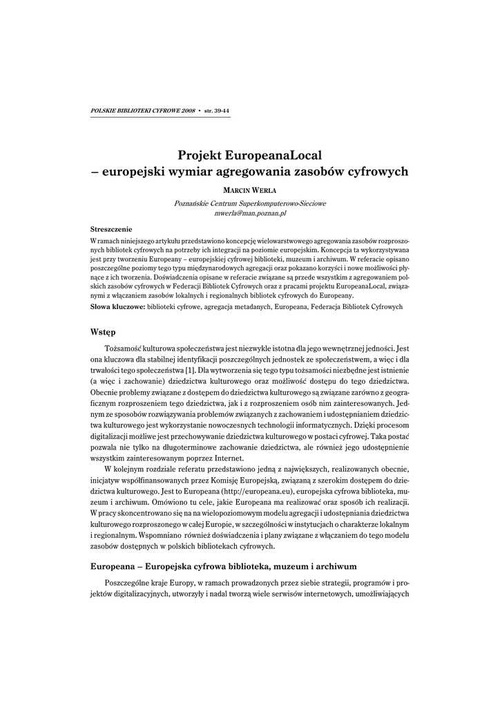 POLSKIE BIBLIOTEKI CYFROWE 2008 • str. 39-44 Projekt EuropeanaLocal – europejski wymiar agregowania zasobów cyfrowych MARCIN WERLA Poznańskie Centrum Superkomputerowo-Sieciowe [email protected] Streszczenie W ramach niniejszego artykułu przedstawiono koncepcję wielowarstwowego agregowania zasobów rozproszonych bibliotek cyfrowych na potrzeby ich integracji na poziomie europejskim. Koncepcja ta wykorzystywana jest przy tworzeniu Europeany – europejskiej cyfrowej biblioteki, muzeum i archiwum. W referacie opisano poszczególne poziomy tego typu międzynarodowych agregacji oraz pokazano korzyści i nowe możliwości płynące z ich tworzenia. Doświadczenia opisane w referacie związane są przede wszystkim z agregowaniem polskich zasobów cyfrowych w Federacji Bibliotek Cyfrowych oraz z pracami projektu EuropeanaLocal, związanymi z włączaniem zasobów lokalnych i regionalnych bibliotek cyfrowych do Europeany. Słowa kluczowe: biblioteki cyfrowe, agregacja metadanych, Europeana, Federacja Bibliotek Cyfrowych Wstęp Tożsamość kulturowa społeczeństwa jest niezwykle istotna dla jego wewnętrznej jedności. Jest ona kluczowa dla stabilnej identyfikacji poszczególnych jednostek ze społeczeństwem, a więc i dla trwałości tego społeczeństwa [1]. Dla wytworzenia się tego typu tożsamości niezbędne jest istnienie (a więc i zachowanie) dziedzictwa kulturowego oraz możliwość dostępu do tego dziedzictwa. Obecnie problemy związane z dostępem do dziedzictwa kulturowego są związane zarówno z geograficznym rozproszeniem tego dziedzictwa, jak i z rozproszeniem osób nim zainteresowanych. Jednym ze sposobów rozwiązywania problemów związanych z zachowaniem i udostępnianiem dziedzictwa kulturowego jest wykorzystanie nowoczesnych technologii informatycznych. Dzięki procesom digitalizacji możliwe jest przechowywanie dziedzictwa kulturowego w postaci cyfrowej. Taka postać pozwala nie tylko na długoterminowe zachowanie dziedzictwa, ale również jego udostępnienie wszystkim zainteresowanym poprzez Internet. W kolejnym rozdziale referatu przedstawiono jedną z największych, realizowanych obecnie, inicjatyw współfinansowanych przez Komisję Europejską, związaną z szerokim dostępem do dziedzictwa kulturowego. Jest to Europeana (http://europeana.eu), europejska cyfrowa biblioteka, muzeum i archiwum. Omówiono tu cele, jakie Europeana ma realizować oraz sposób ich realizacji. W pracy skoncentrowano się na na wielopoziomowym modelu agregacji i udostępniania dziedzictwa kulturowego rozproszonego w całej Europie, w szczególności w instytucjach o charakterze lokalnym i regionalnym. Wspomniano również doświadczenia i plany związane z włączaniem do tego modelu zasobów dostępnych w polskich bibliotekach cyfrowych. Europeana – Europejska cyfrowa biblioteka, muzeum i archiwum Poszczególne kraje Europy, w ramach prowadzonych przez siebie strategii, programów i projektów digitalizacyjnych, utworzyły i nadal tworzą wiele serwisów internetowych, umożliwiających 40 Projekt EuropeanaLocal – europejski wymiar agregowania zasobów cyfrowych dostęp do wybranych wycinków dziedzictwa kulturowego. Są to zazwyczaj konkretne kolekcje tematyczne lub szczególnie cenne zasoby wybranych instytucji. W liście do Komisji Europejskiej z 25 sierpnia 2005 roku władze sześciu krajów (w tym również Polski) zasygnalizowały potrzebę utworzenia wirtualnej biblioteki europejskiej, dającej szeroki i otwarty dostęp do europejskiego dziedzictwa kulturowego i naukowego. List ten był wynikiem wcześniejszej wypowiedzi dyrektora francuskiej biblioteki narodowej, który zwrócił uwagę na postępującą monopolizację Internetu przez firmę Google oraz masowe skanowanie i udostępnianie przez tę firmę prawie wyłącznie anglojęzycznych (w większości amerykańskich) książek i innych obiektów dziedzictwa kulturowego. Wobec skali poczynań Google, brak intensywnych i skoordynowanych działań w celu udostępnienia i popularyzacji w Internecie dziedzictwa innych kultur, mógłby doprowadzić w niedalekiej przyszłości do zaniku tych kultur w świecie cyfrowym. Postulaty zawarte we wspomnianym liście zaowocowały ogłoszeniem w 2005 roku inicjatywy Komisji Europejskiej nazwanej i2010 Digital Libraries [2], która dała początek współfinansowaniu przez Komisję Europejską serii projektów realizujących kolejne fragmenty Europejskiej Biblioteki Cyfrowej. Pierwszy prototyp Europeany, bo tak nazywa się owa biblioteka, został udostępniony publicznie w listopadzie 2008 roku pod adresem http://europeana.eu. W opracowaniu specyfikacji funkcjonalnej, tj. dokumentu określającego szczegółowo, jakie funkcje ma Europeana realizować [3], twórcy Europeany założyli, że użytkownicy tego serwisu będą tam najczęściej trafiali z czterech podstawowych powodów. Pierwszy i podstawowy cel to rozrywka. Użytkownik Europeany oczekujący rozrywki nie będzie najprawdopodobniej szukał niczego konkretnego, ale raczej wprowadzał przypadkowe zapytania i „surfował” po wynikach od jednego do drugiego obiektu cyfrowego. Drugi scenariusz użycia Europeany to poszukiwanie informacji na temat konkretnego obiektu, osoby, wydarzenia etc. Osoby realizujące ten scenariusz będą w przybliżeniu wiedziały czego poszukują, mogą jednak nie być w stanie formułować zapytań wyszukiwawczych zgodnych ze sposobem opisu obiektów dostępnych w Europeanie. Trzeci cel przyświecający użytkownikom Europeany to poszukiwanie informacji w związku z planowaną podróżą. Dotyczy to zarówno sytuacji, w której użytkownik szuka informacji na temat ciekawych obiektów znajdujących się w miejscu, do którego się udaje, jak i sytuacji, w której takie obiekty są już znane, a użytkownik poszukuje dodatkowych informacji na ich temat lub na temat obiektów znajdujących się w pobliżu. W tym scenariuszu należy zadbać również o użytkowników korzystających z urządzeń mo