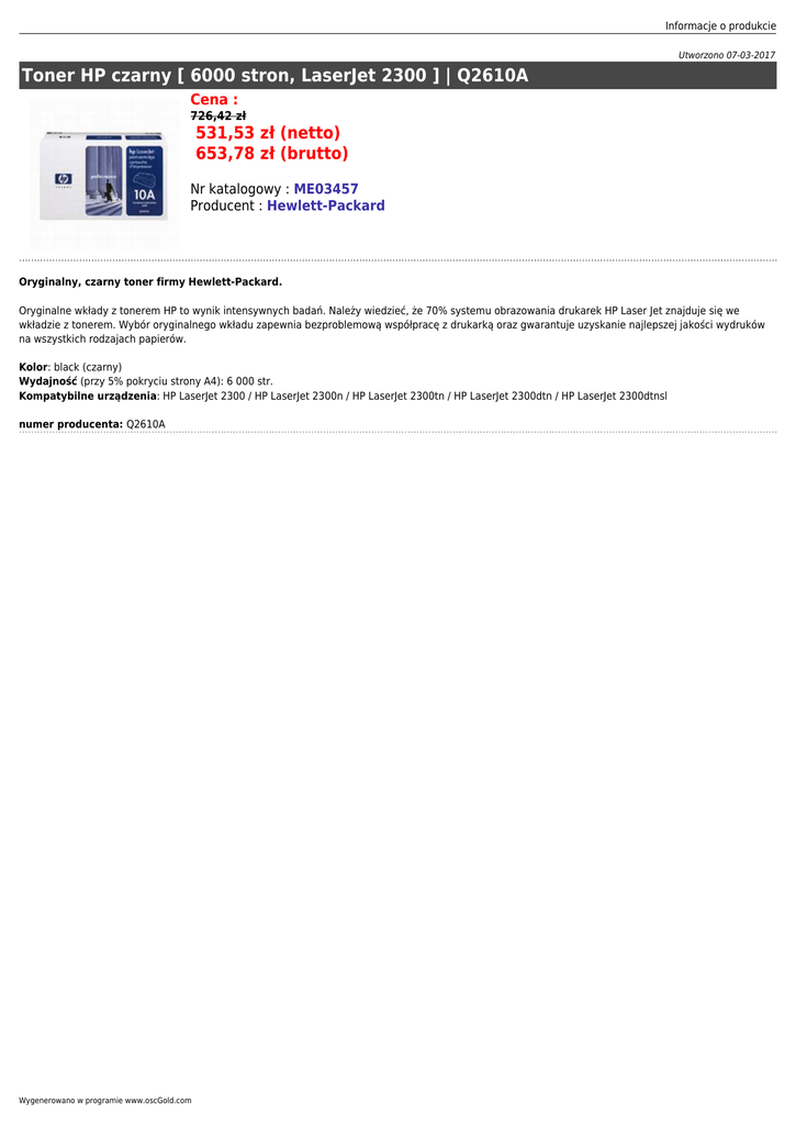 Informacje o produkcie Utworzono 07-03-2017 Toner HP czarny [ 6000 stron, LaserJet 2300 ] | Q2610A Cena : 726,42 zł 531,53 zł (netto) 653,78 zł (brutto) Nr katalogowy : ME03457 Producent : Hewlett-Packard Oryginalny, czarny toner firmy Hewlett-Packard. Oryginalne wkłady z tonerem HP to wynik intensywnych badań. Należy wiedzieć, że 70% systemu obrazowania drukarek HP Laser Jet znajduje się we wkładzie z tonerem. Wybór oryginalnego wkładu zapewnia bezproblemową współpracę z drukarką oraz gwarantuje uzyskanie najlepszej jakości wydruków na wszystkich rodzajach papierów. Kolor: black (czarny) Wydajność (przy 5% pokryciu strony A4): 6 000 str. Kompatybilne urządzenia: HP LaserJet 2300 / HP LaserJet 2300n / HP LaserJet 2300tn / HP LaserJet 2300dtn / HP LaserJet 2300dtnsl numer producenta: Q2610A Wygenerowano w programie www.oscGold.com