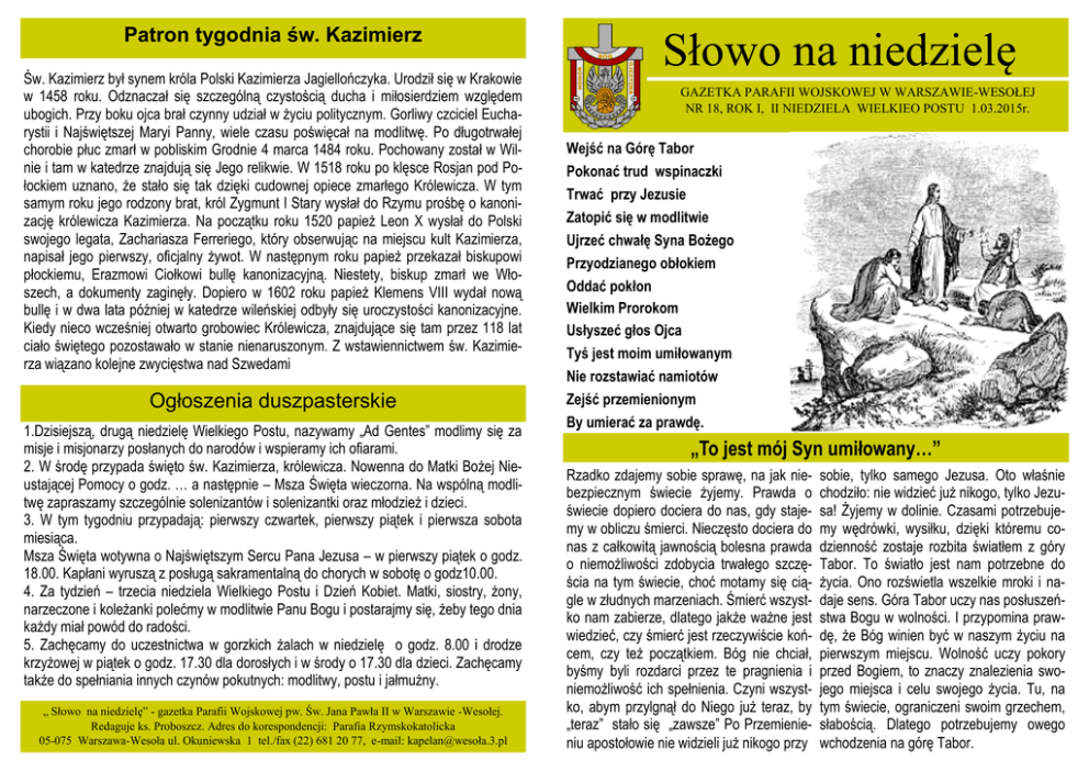 Patron tygodnia św. Kazimierz Św. Kazimierz był synem króla Polski Kazimierza Jagiellończyka. Urodził się w Krakowie w 1458 roku. Odznaczał się szczególną czystością ducha i miłosierdziem względem ubogich. Przy boku ojca brał czynny udział w życiu politycznym. Gorliwy czciciel Eucharystii i Najświętszej Maryi Panny, wiele czasu poświęcał na modlitwę. Po długotrwałej chorobie płuc zmarł w pobliskim Grodnie 4 marca 1484 roku. Pochowany został w Wilnie i tam w katedrze znajdują się Jego relikwie. W 1518 roku po klęsce Rosjan pod Połockiem uznano, że stało się tak dzięki cudownej opiece zmarłego Królewicza. W tym samym roku jego rodzony brat, król Zygmunt I Stary wysłał do Rzymu prośbę o kanonizację królewicza Kazimierza. Na początku roku 1520 papież Leon X wysłał do Polski swojego legata, Zachariasza Ferreriego, który obserwując na miejscu kult Kazimierza, napisał jego pierwszy, oficjalny żywot. W następnym roku papież przekazał biskupowi płockiemu, Erazmowi Ciołkowi bullę kanonizacyjną. Niestety, biskup zmarł we Włoszech, a dokumenty zaginęły. Dopiero w 1602 roku papież Klemens VIII wydał nową bullę i w dwa lata później w katedrze wileńskiej odbyły się uroczystości kanonizacyjne. Kiedy nieco wcześniej otwarto grobowiec Królewicza, znajdujące się tam przez 118 lat ciało świętego pozostawało w stanie nienaruszonym. Z wstawiennictwem św. Kazimierza wiązano kolejne zwycięstwa nad Szwedami Ogłoszenia duszpasterskie 1.Dzisiejszą, drugą niedzielę Wielkiego Postu, nazywamy „Ad Gentes” modlimy się za misje i misjonarzy posłanych do narodów i wspieramy ich ofiarami. 2. W środę przypada święto św. Kazimierza, królewicza. Nowenna do Matki Bożej Nieustającej Pomocy o godz. … a następnie – Msza Święta wieczorna. Na wspólną modlitwę zapraszamy szczególnie solenizantów i solenizantki oraz młodzież i dzieci. 3. W tym tygodniu przypadają: pierwszy czwartek, pierwszy piątek i pierwsza sobota miesiąca. Msza Święta wotywna o Najświętszym Sercu Pana Jezusa – w pierwszy piątek o godz. 18.00. Kapłani wyruszą z posługą sakramentalną do chorych w sobotę o godz10.00. 4. Za tydzień – trzecia niedziela Wielkiego Postu i Dzień Kobiet. Matki, siostry, żony, narzeczone i koleżanki polećmy w modlitwie Panu Bogu i postarajmy się, żeby tego dnia każdy miał powód do radości. 5. Zachęcamy do uczestnictwa w gorzkich żalach w niedzielę o godz. 8.00 i drodze krzyżowej w piątek o godz. 17.30 dla dorosłych i w środy o 17.30 dla dzieci. Zachęcamy także do spełniania innych czynów pokutnych: modlitwy, postu i jałmużny. „ Słowo na niedzielę” - gazetka Parafii Wojskowej pw. Św. Jana Pawła II w Warszawie -Wesołej. Redaguje ks. Proboszcz. Adres do korespondencji: Parafia Rzymskokatolicka 05-075 Warszawa-Wesoła ul. Okuniewska 1 tel./fax (22) 681 20 77, e-mail: kapelan@wesoła.3.pl Słowo na niedzielę GAZETKA PARAFII WOJSKOWEJ W WARSZAWIE-WESOŁEJ NR 18, ROK I, II NIEDZIELA WIELKIEO POSTU 1.03.2015r. Wejść na Górę Tabor Pokonać trud wspinaczki Trwać przy Jezusie Zatopić się w modlitwie Ujrzeć chwałę Syna Bożego Przyodzianego obłokiem Oddać pokłon Wielkim Prorokom Usłyszeć głos Ojca Tyś jest moim umiłowanym Nie rozstawiać namiotów Zejść przemienionym By umierać za prawdę. „To jest mój Syn umiłowany…” Rzadko zdajemy sobie sprawę, na jak niebezpiecznym świecie żyjemy. Prawda o świecie dopiero dociera do nas, gdy stajemy w obliczu śmierci. Nieczęsto dociera do nas z całkowitą jawnością bolesna prawda o niemożliwości zdobycia trwałego szczęścia na tym świecie, choć motamy się ciągle w złudnych marzeniach. Śmierć wszystko nam zabierze, dlatego jakże ważne jest wiedzieć, czy śmierć jest rzeczywiście końcem, czy też początkiem. Bóg nie chciał, byśmy byli rozdarci przez te pragnienia i niemożliwość ich spełnienia. Czyni wszystko, abym przylgnął do Niego już teraz, by „teraz” stało się „zawsze” Po Przemienieniu apostołowie nie widzieli już nikogo przy sobie, tylko samego Jezusa. Oto właśnie chodziło: nie widzieć już nikogo, tylko Jezusa! Żyjemy w dolinie. Czasami potrzebujemy wędrówki, wysiłku, dzięki któremu codzienność zostaje rozbita światłem z góry Tabor. To światło jest nam potrzebne do życia. Ono rozświetla wszelkie mroki i nadaje sens. Góra Tabor uczy nas posłuszeństwa Bogu w wolności. I przypomina prawdę, że Bóg winien być w naszym życiu na pierwszym miejscu. Wolność uczy pokory przed Bogiem, to znaczy znalezienia swojego miejsca i celu swojego życia. Tu, na tym świecie, ograniczeni swoim grzechem, słabością. Dlatego potrzebujemy owego wchodzenia na górę Tabor. Liturgia Słowa na II Niedzielę Wielkiego Postu B I Czytanie Rdz 22,1-2.9-13.15-18 II Czytanie Rz 8, 31b-34 Bóg wystawił Abrahama na próbę. Rzekł do niego: „Abrahamie!” A gdy on odpowiedział: „Oto jestem”, powiedział: „Weź twego syna jedynego, którego miłujesz, Izaaka, idź do kraju Moria i tam złóż go w ofierze na jednym z pagórków, jaki ci wskażę”. A gdy przyszedł na to miejsce, które Bóg wskazał, Abraham zbudował tam ołtarz, ułożył na nim drwa i związawszy syna swego Izaaka położył go na tych drwach na ołtarzu. Potem Abraham sięgnął ręką po nóż, aby zabić swego syna. Ale wtedy anioł Pana zawołał na niego z nieba i rzekł: „Abrahamie, Abrahamie!”A on rzekł: „Oto jestem”. Powiedział mu: „Nie podnoś ręki na chłopca i nie czyń mu nic złego! Teraz poznałem, że boisz się Boga, bo nie odmówiłeś Mi nawet twego jedynego syna”. Abraham obejrzawszy się poza siebie, spostrzegł barana uwikłanego w zaroślach. Poszedł więc, wziął barana i złożył w ofierze całopalnej zamiast swego syna. Po czym anioł Pana przemówił głośno z nieba do Abrahama po raz drugi: „Przy sięgam na siebie, mówi Pan, że ponieważ ucz