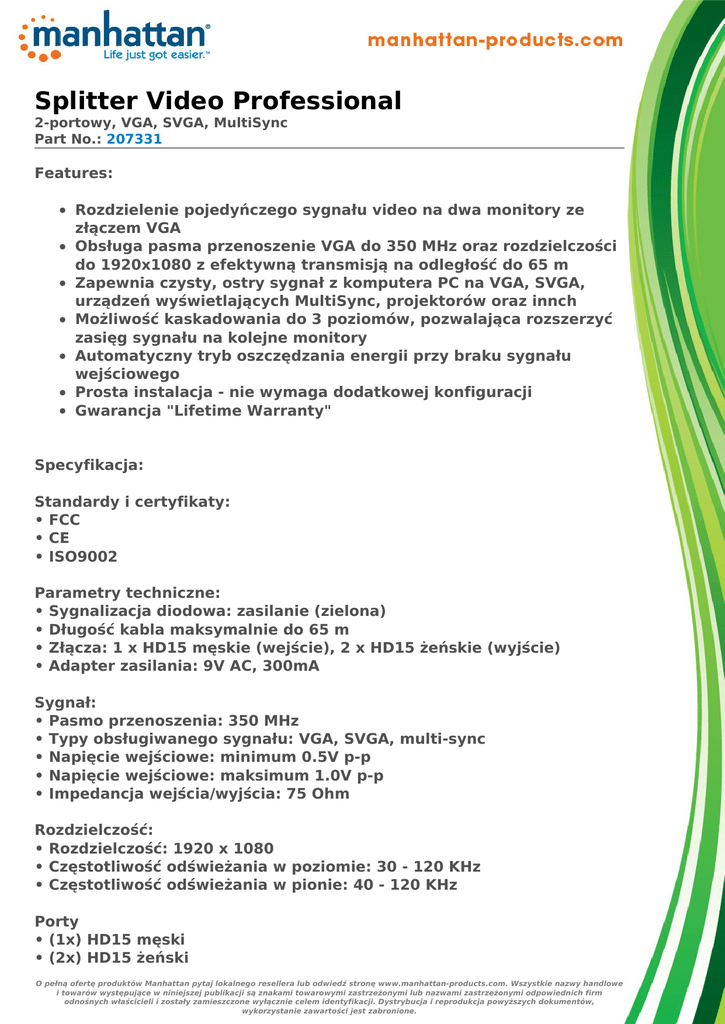 Splitter Video Professional 2-portowy, VGA, SVGA, MultiSync Part No.: 207331 Features: Rozdzielenie pojedyńczego sygnału video na dwa monitory ze złączem VGA Obsługa pasma przenoszenie VGA do 350 MHz oraz rozdzielczości do 1920x1080 z efektywną transmisją na odległość do 65 m Zapewnia czysty, ostry sygnał z komputera PC na VGA, SVGA, urządzeń wyświetlających MultiSync, projektorów oraz innch Możliwość kaskadowania do 3 poziomów, pozwalająca rozszerzyć zasięg sygnału na kolejne monitory Automatyczny tryb oszczędzania energii przy braku sygnału wejściowego Prosta instalacja - nie wymaga dodatkowej konfiguracji Gwarancja "Lifetime Warranty" Specyfikacja: Standardy i certyfikaty: • FCC • CE • ISO9002 Parametry techniczne: • Sygnalizacja diodowa: zasilanie (zielona) • Długość kabla maksymalnie do 65 m • Złącza: 1 x HD15 męskie (wejście), 2 x HD15 żeńskie (wyjście) • Adapter zasilania: 9V AC, 300mA Sygnał: • Pasmo przenoszenia: 350 MHz • Typy obsługiwanego sygnału: VGA, SVGA, multi-sync • Napięcie wejściowe: minimum 0.5V p-p • Napięcie wejściowe: maksimum 1.0V p-p • Impedancja wejścia/wyjścia: 75 Ohm Rozdzielczość: • Rozdzielczość: 1920 x 1080 • Częstotliwość odświeżania w poziomie: 30 - 120 KHz • Częstotliwość odświeżania w pionie: 40 - 120 KHz Porty • (1x) HD15 męski • (2x) HD15 żeński O pełną ofertę produktów Manhattan pytaj lokalnego resellera lub odwiedź stronę www.manhattan-products.com. Wszystkie nazwy handlowe i towarów występujące w niniejszej publikacji są znakami towarowymi zastrzeżonymi lub nazwami zastrzeżonymi odpowiednich firm odnośnych właścicieli i zostały zamieszczone wyłącznie celem identyfikacji. Dystrybucja i reprodukcja powyższych dokumentów, wykorzystanie zawartości jest zabronione. • (1x) gniazdo zasilania 9V, 1A Parametry fizyczne: • Materiał wykonania obudowy: metal • Wymiary: 133 x 94 x 42 mm • Waga: 396 g Zawartość opakowania: • Splitter Video Professional • Instrukcja użytkownika O pełną ofertę produktów Manhattan pytaj lokalnego resellera lub odwiedź stronę www.manhattan-products.com. Wszystkie nazwy handlowe i towarów występujące w niniejszej publikacji są znakami towarowymi zastrzeżonymi lub nazwami zastrzeżonymi odpowiednich firm odnośnych właścicieli i zostały zamieszczone wyłącznie celem identyfikacji. Dystrybucja i reprodukcja powyższych dokumentów, wykorzystanie zawartości jest zabronione.