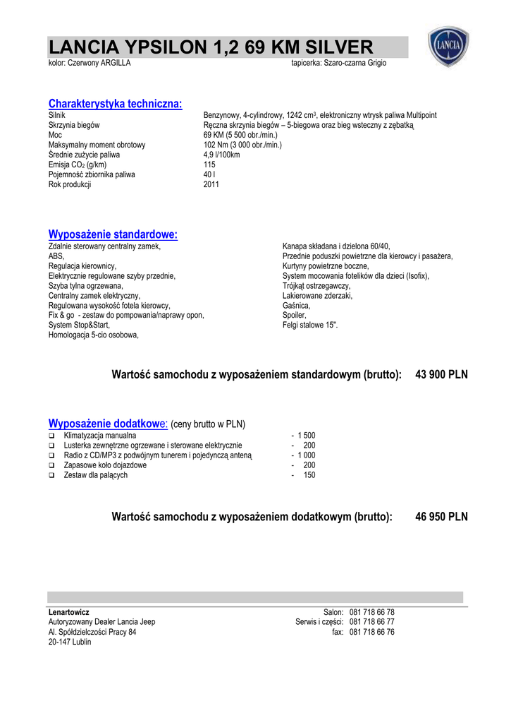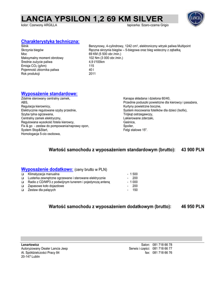 LANCIA YPSILON 1,2 69 KM SILVER kolor: Czerwony ARGILLA Charakterystyka techniczna: Silnik Skrzynia biegów Moc Maksymalny moment obrotowy Średnie zużycie paliwa Emisja CO2 (g/km) Pojemność zbiornika paliwa Rok produkcji tapicerka: Szaro-czarna Grigio Benzynowy, 4-cylindrowy, 1242 cm3, elektroniczny wtrysk paliwa Multipoint Ręczna skrzynia biegów – 5-biegowa oraz bieg wsteczny z zębatką 69 KM (5 500 obr./min.) 102 Nm (3 000 obr./min.) 4,9 l/100km 115 40 l 2011 Wyposażenie standardowe: Zdalnie sterowany centralny zamek, ABS, Regulacja kierownicy, Elektrycznie regulowane szyby przednie, Szyba tylna ogrzewana, Centralny zamek elektryczny, Regulowana wysokość fotela kierowcy, Fix & go - zestaw do pompowania/naprawy opon, System Stop&Start, Homologacja 5-cio osobowa, Kanapa składana i dzielona 60/40, Przednie poduszki powietrzne dla kierowcy i pasażera, Kurtyny powietrzne boczne, System mocowania fotelików dla dzieci (Isofix), Trójkąt ostrzegawczy, Lakierowane zderzaki, Gaśnica, Spoiler, Felgi stalowe 15". Wartość samochodu z wyposażeniem standardowym (brutto): 43 900 PLN Wyposażenie dodatkowe: (ceny brutto w PLN) Klimatyzacja manualna Lusterka zewnętrzne ogrzewane i sterowane elektrycznie Radio z CD/MP3 z podwójnym tunerem i pojedynczą anteną Zapasowe koło dojazdowe Zestaw dla palących - 1 500 - 200 - 1 000 - 200 - 150 Wartość samochodu z wyposażeniem dodatkowym (brutto): Lenartowicz Autoryzowany Dealer Lancia Jeep Al. Spółdzielczości Pracy 84 20-147 Lublin Salon: 081 718 66 78 Serwis i części: 081 718 66 77 fax: 081 718 66 76 46 950 PLN Zdalnie sterowany centralny zamek, ABS, regulacja kierownicy, elektrycznie regulowane szyby przednie, szyba tylna ogrzewana, centralny zamek elektryczny, regulowana wysokość fotela kierowcy, Fix & go - zestaw do pompowania/naprawy opon, system Stop&Start, homologacja 5-cio osobowa, kanapa składana i dzielona 60/40, przednie poduszki powietrzne dla kierowcy i pasażera, kurtyny powietrzne boczne, system mocowania fotelików dla dzieci (Isofix), trójkąt ostrzegawczy, lakierowane zderzaki, gaśnica, spoiler, felgi stalowe 15". klimatyzacja manualna, lusterka zewnętrzne ogrzewane i sterowane elektrycznie, radio z CD/MP3 z podwójnym tunerem i pojedynczą anteną, zapasowe koło dojazdowe, zestaw dla palących