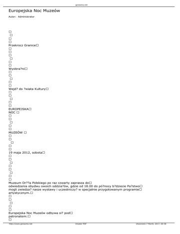 gorawino.net Europejska Noc Muzeów Autor: Administrator Przekrocz Granice Wyobra?ni Wejd? do ?wiata Kultury EUROPEJSKA NOC MUZEÓW 19 maja 2012, sobota Muzeum Or??a Polskiego po raz czwarty zaprasza do odwiedzenia obydwu swoich oddzia?ów, gdzie od 18.00 do pó?nocy b?dziecie Pa?stwo mogli zwiedza? nasze wystawy i uczestniczy? w specjalnie przygotowanym programie artystycznym. Europejska Noc Muzeów odbywa si? pod patronatem: http://www.gorawino.net Kreator PDF Utworzono 7 March, 2017, 00:38 gorawino.net Komendanta G?ównego Stra?y Granicznej – gen bryg Dominika Tracza Starosty ko?obrzeskiego – Tomasza Tamborskiego ODDZIA? DZIEJE OR??A POLSKIEGO ul. ppor. Emilii Gierczak 5 wst?p – 1 z?* godz. 18: 00 – uroczyste otwarcie Nocy Muzeów godz. 18:20 – Kpt W?ADYS?AW RAGINIS - pierwsza w kraju oficjalna ekspozycja muzealna przedmiotów osobistych kpt. W?adys?awa Raginisa, odnalezionych podczas ekshumacji szcz?tków z miejsca pochówku u podnó?a Góry Str?kowej, prelekcja: mgr in?. Dariusz Szymanowski (SWPFG, Stowarzyszenie „Wizna-1939”) godz. 18: 30 – ALEJA POLSKICH FORMACJI GRANICZNYCH – kolejna od?sona lapidarium kamieni granicznych (m.in. prezentacja kamienia wersalskiego) godz. 18.00-24.00: nocne zwiedzanie wystaw: Dzieje Or??a Polskiego, Ko?obrzeg dawniej i dzi?, Korpus Ochrony Pogranicza 1924-1939 http://www.gorawino.net Kreator PDF Utworzono 7 March, 2017, 00:38 gorawino.net dzia?o samobie?ne ISU-122, samolot szkolno-bojowy TS-11 Iskra prezentacje: ?redniowieczny Ko?obrzeg, grupy rekonstrukcyjne: Twierdza Ko?obrzeg w wojnie siedmioletniej i 1807, 1 Armia Wojska Polskiego 1945, Ludowe Wojsko Polskie, Narodowe Si?y Rezerwowe godz. 19:00 KORPUS OCHRONY POGRANICZA - prezentacja grupy rekonstrukcyjnej KOP pod dowództwem por. rez. Jaros?awa Wojciechowicza, godz. 19:30 pocz?stunek wojskowy godz. 20:00 MORSKI ODDZIA? STRA?Y GRANICZNEJ - pokaz sprz?tu i wyposa?enia Morskiego Oddzia?u SG w Ko?obrzegu godz.20:30 HISTORYCZNI DETEKTYWI pokaz grupy uczniów S.P. Nr 4 w Ko?obrzegu pod opiek? nauczycieli: p. B. Hordyjewskiej i L. Michalskiej godz. 21:00 PODDODZIA? ROZPOZNANIA SKA?EN- prezentacja zespo?u urz?dze? do rozpoznawania ska?e? na podwoziu samochodu opancerzonego BRDM-2RS- Jaros?aw Bogus?awski godz. 22:00 – GDZIE MY, TAM GRANICA – stanowisko historyczne GRH 2. pu?ku u?anów 1. Warszawskiej Brygady Kawalerii z wykorzystaniem samochodu terenowego Willys - Jeep: Prezentacja ekwipunku bojowego piechoty i uzbrojenia WP na Wschodzie, prezentacja multimedialna pt. “Wojsko Polskie na Wschodzie” ODDZIA? HISTORII MIASTA http://www.gorawino.net Kreator PDF Utworzono 7 March, 2017, 00:38 gorawino.net ul. Armii Krajowej 13 wst?p – 1 z?* godz. 18.00-24.00: nocne zwiedzanie wystaw: Dzieje Ko?obrzegu, Zbiory Metrologiczne, Navigare Necesse Est prezentacje: Nawigacja jest konieczno?ci? *symboliczna op?ata zostanie przekazana na renowacj? zabytków Pierwsza Noc Muzeów odby?a si? w Berlinie w 1997 r. Jej niezwykle du?e powodzenie sprawi?o, ?e podobne imprezy zacz??y powstawa? w innych miastach zachodnioeuropejskich. W sposób szczególny do idei odnios?o si? francuskie Ministerstwo Kultury w 1999r. Dwa lata pó?niej impreza przekszta?ci?a si? w ogólnoeuropejsk?, organizowan? w pa?stwach - sygnatariuszach Europejskiej Konwencji Kulturalnej. Równie? we Francji, w 2005 r., powsta? pomys? by to “?wi?to muzeów” odbywa?o si? w godzinach wieczornych i nocnych. Partnerzy: Towarzystwo Przyjació? Muzeum Or??a Polskiego w Ko?obrzegu Wojskowa Komenda Uzupe?nie? w Ko?obrzegu Szko?a Podstawowa nr 4 w Ko?obrzegu Fundacja Kresy – Syberia http://www.gorawino.net Kreator PDF Utworzono 7 March, 2017, 00:38 gorawino.net Stowarzyszenie Weteranów Polskich Formacji Granicznych Morski Oddzia? Stra?y Granicznej w Ko?obrzegu GRH Korpus Ochrony Pogranicza GRH 2. pu?k u?anów 1. Warszawskiej Brygady Kawalerii Mecenasi kultury: Hotel Zdrojowy PRO-VITA Troton Sp. z o.o. Jantar Wody Mineralne Patroni medialni: Wojskowy Instytut Wydawniczy Polska Zbrojna Kurier Szczeci?ski Telewizja Kablowa Ko?obrzeg Portal Kolobrzeg.de wydarzenia towarzysz?ce: http://www.gorawino.net Kreator PDF Utworzono 7 March, 2017, 00:38 gorawino.net 19 maja 2012r uroczyste obchody XX-lecia Stowarzyszenia Weteranów Polskich Formacji Granicznych pod Patronatem Honorowym Komendanta G?ównego Stra?y Granicznej gen. bryg. SG Dominika Tracza Blok I Miejsce: Muzeum Or??a Polskiego, ul. ppor. Emilii Gierczak 5 godz. 10:30 – zwiedzanie wystawy plenerowej “Korpus Ochrony Pogranicza 1924 – 1939” przygotowanej przez Fundacj? Kresy-Syberia w Warszawie godz. 11:00 – 11:30 – koncert z okazji XX-lecia SWPFG w wykonaniu Orkiestry Reprezentacyjnej Stra?y Granicznej z Nowego S?cza http://www.gorawino.net Kreator PDF Utworzono 7 March, 2017, 00:38 gorawino.net Blok II - godz. 12:00 miejsce: Muzeum Or??a Polskiego, sala plafonowa Pa?acu Braunschweigów przy ul. Armii Krajowej 13 powitanie go?ci w imieniu organizatorów przez Paw?a Paw?owskiego – dyrektora Muzeum Or??a Polskiego w Ko?obrzegu otwarcie wystawy “1992-2012 – 20. lat dzia?alno?ci Stowarzyszenia Weteranów Polskich Formacji Granicznych” wyst?pienia przedstawicieli urz?dów, w?adz samorz?dowych i organizacji nadanie odznacze? i wr?czenie wyró?nie? wyst?pienie przedstawiciela wyró?nionych Blok III – sympozjum naukowe pod kierownictwem naukowym: prof. dr hab. Bogus?awa Polaka i pp?k. SG dr Wojciecha Grobelskiego Sesja I http://www.gorawino.net Kreator PDF Utworzono 7 March, 2017, 00:38 gorawino.net godz. 13:00- s?owo wst?pne prezesa SWPFG Waldemara Boche?skiego godz. 13:10- otwarcie sympozjum przez Przewodnicz?cego prof. dr hab. Bogus?awa Polaka godz. 13:20- wyst?pienie przedstawiciela KG SG Referaty: godz. 13:30- in?. Waldemar Boche?ski (SWPFG, Warszawa) “Dzia?alno?? Stowarzyszenia Weteranów Polskich Formacji Granicznych w latach 1992-2012” godz. 13:45- pp?k SG dr Wojciech Grobelski ( COS SG, Koszalin) “Korpus Ochrony Pogranicza 1924-1939” godz.- 14:00-mjr SG