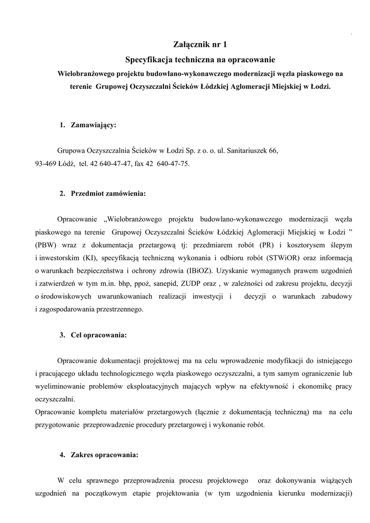 . Załącznik nr 1 Specyfikacja techniczna na opracowanie Wielobranżowego projektu budowlano-wykonawczego modernizacji węzła piaskowego na terenie Grupowej Oczyszczalni Ścieków Łódzkiej Aglomeracji Miejskiej w Łodzi. 1. Zamawiający: Grupowa Oczyszczalnia Ścieków w Łodzi Sp. z o. o. ul. Sanitariuszek 66, 93-469 Łódź, tel. 42 640-47-47, fax 42 640-47-75. 2. Przedmiot zamówienia: Opracowanie „Wielobranżowego projektu budowlano-wykonawczego modernizacji węzła piaskowego na terenie Grupowej Oczyszczalni Ścieków Łódzkiej Aglomeracji Miejskiej w Łodzi ” (PBW) wraz z dokumentacja przetargową tj: przedmiarem robót (PR) i kosztorysem ślepym i inwestorskim (KI), specyfikacją techniczną wykonania i odbioru robót (STWiOR) oraz informacją o warunkach bezpieczeństwa i ochrony zdrowia (IBiOZ). Uzyskanie wymaganych prawem uzgodnień i zatwierdzeń w tym m.in. bhp, ppoż, sanepid, ZUDP oraz , w zależności od zakresu projektu, decyzji o środowiskowych uwarunkowaniach realizacji inwestycji i decyzji o warunkach zabudowy i zagospodarowania przestrzennego. 3. Cel opracowania: Opracowanie dokumentacji projektowej ma na celu wprowadzenie modyfikacji do istniejącego i pracującego układu technologicznego węzła piaskowego oczyszczalni, a tym samym ograniczenie lub wyeliminowanie problemów eksploatacyjnych mających wpływ na efektywność i ekonomikę pracy oczyszczalni. Opracowanie kompletu materiałów przetargowych (łącznie z dokumentacją techniczną) ma na celu przygotowanie przeprowadzenie procedury przetargowej i wykonanie robót. 4. Zakres opracowania: W celu sprawnego przeprowadzenia procesu projektowego oraz dokonywania wiążących uzgodnień na początkowym etapie projektowania (w tym uzgodnienia kierunku modernizacji) . Zamawiający ustala, iż opracowanie właściwego projektu będącego tytułowym przedmiotem zamówienia poprzedzone zostanie fazą projektu wstępnego, która będzie podlegać uzgodnieniu przez Zamawiającego. W związku z tym całe zadanie podzielone zostaje na 2 etapy projektowania. Ó Etap I – Projekt wstępny modernizacji węzła piaskowego GOŚ ŁAM – stanowić będzie materiał do uzgodnień z Zamawiającym proponowanych rozwiązań technicznych m.in. w zakresie proponowanych rozwiązań konstrukcyjnych i technologicznych, proponowanych urządzeń i rozwiązań technicznych (w tym np. systemu napowietrzania, odbioru i płukania piasku, wydzielania tłuszczy, zasilania i sterowania) oraz szacunkowych kosztów inwestycyjnych i eksploatacyjnych. Projekt wstępny podlegać będzie uzgodnieniu przez Zamawiającego. Zamawiający zastrzega sobie możliwość weryfikacji proponowanych rozwiązań na wskazanych przez Wykonawcę obiektach referencyjnych. Przyjęty przez Zamawiającego Projekt Wstępny stanowić będzie podstawę dalszych prac projektowych Etapu II. Projekt wstępny – do uzgodnień z Zamawiającym należy opracować w 2 egz. oraz w wersji elektronicznej. Ó Etap II - Wielobranżowy projekt budowlano-wykonawczy modernizacji węzła piaskowego na terenie GOŚ ŁAM wraz z materiałami umożliwiającymi uzyskanie niezbędnych decyzji (w zależności od zakresu modernizacji – do zgłoszenia lub pozwolenia na budowę - m.in. o środowiskowych uwarunkowań lokalizacji inwestycji celu publicznego i o warunkach zabudowy i zagospodarowania przestrzennego), uzyskaniem uzgodnień (m.in. bhp, ppoż, sanepid, ZUDP) wymaganych do wystąpienia przez Zamawiającego o Pozwolenie na budowę oraz materiałami do przeprowadzenia procedury zamówień publicznych na wykonanie w/w obiektu. Projekt winien obejmować wszystkie niezbędne branże dla przedmiotowego zakresu umożliwiające wykonanie robót (przewiduje się branże technologiczną, konstrukcyjną, elektryczną i AKPiA ) oraz winien być opracowany i uzgodniony zgodnie z przepisami prawa polskiego. Projekt (i opracowania ekonomiczne – kosztorys i przedmiar robót) należy opracować w podziale na poszczególne zadania (ciągi technologiczne) w celu umożliwienia etapowania robót zarówno pod względem zachowania ciągłości pracy oczyszczalni jak i zapewnienia finansowania. W ramach projektu należy przewidzieć min. 4 zadania tzn. 1 ciąg piaskownika -1 zadanie. Dokumentację należy opracować w 6 egz. oraz w wersji elektronicznej (na płycie CD/DVD). Wersję elektroniczną należy przekazać w postaci: - Całość w formacie pdf (podzielona na poszczególne zadania, branże i opracowania) - Część opisową projektów, STWiOR, IBiOZ – w formacie MS WORD lub kompatybilnym, - Część graficzną projektów w formacie ACAD lub kompatybilnym - Opracowania kosztowe (PR i KI) – w formacie kompatybilnym z programem NORMA PRO (format ath, kst). Wersja Projektu do uzgodnień - w 2 egz. . 5. Stan istniejący węzła piaskowego GOŚ ŁAM: lość i jakość ścieków dopływających do GOS ŁAM. Ilość i jakość ścieków w dopływie do oczyszczalni w poszczególnych miesiącach 2011 r. przedstawiona została w Załączniku 1d. Wpływające na oczyszczalnię ścieki z kolektora „Polesie 15” trafiają do Głównej Komory Wlotowej gdzie podlegają cedzeniu na kracie rzadkiej 10 cm i są rozdzielane na poszczególne linie. W budynku Hali Krat umiejscowiono urządzenia do cedzenia ścieków, urządzenia do płukania i prasowania skratek, przenośniki do transportu skratek, urządzenie do dezynfekcji skratek, separatory piasku oraz płuczki piasku. Cedzenie ścieków odbywa się na kratach z mechanicznym usuwaniem skratek oraz na sitach dynamicznych dyskowych z rozdrabniaczami. Dwa pierwsze ciągi technologiczne (linie 1÷2) wyposażone są w kraty gęste hakowo-taśmowe typu SCC-GM firmy FONTANA produkcji czeskiej, natomiast pozostałe dwa ciągi (linie 3÷4) w zestawy DISCAM model D1F08C58L/2001 firmy Mono Pumps Limited z Wielkiej Brytanii. Przepustowość jednej kraty czeskiej wynosi 5 500 m3/h, natomiast jednego zestawu DISCAM 5 868 m3/h (łącznie zamontowane są 4 zestawy D