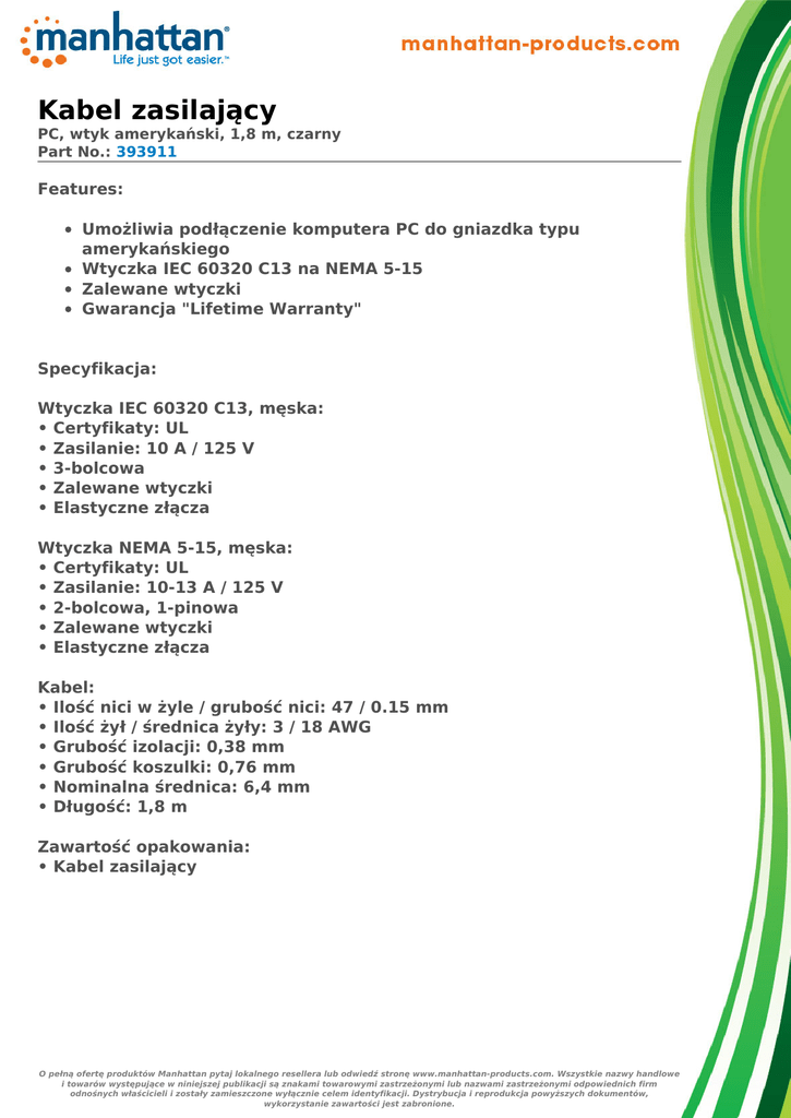 Kabel zasilający PC, wtyk amerykański, 1,8 m, czarny Part No.: 393911 Features: Umożliwia podłączenie komputera PC do gniazdka typu amerykańskiego Wtyczka IEC 60320 C13 na NEMA 5-15 Zalewane wtyczki Gwarancja "Lifetime Warranty" Specyfikacja: Wtyczka IEC 60320 C13, męska: • Certyfikaty: UL • Zasilanie: 10 A / 125 V • 3-bolcowa • Zalewane wtyczki • Elastyczne złącza Wtyczka NEMA 5-15, męska: • Certyfikaty: UL • Zasilanie: 10-13 A / 125 V • 2-bolcowa, 1-pinowa • Zalewane wtyczki • Elastyczne złącza Kabel: • Ilość nici w żyle / grubość nici: 47 / 0.15 mm • Ilość żył / średnica żyły: 3 / 18 AWG • Grubość izolacji: 0,38 mm • Grubość koszulki: 0,76 mm • Nominalna średnica: 6,4 mm • Długość: 1,8 m Zawartość opakowania: • Kabel zasilający O pełną ofertę produktów Manhattan pytaj lokalnego resellera lub odwiedź stronę www.manhattan-products.com. Wszystkie nazwy handlowe i towarów występujące w niniejszej publikacji są znakami towarowymi zastrzeżonymi lub nazwami zastrzeżonymi odpowiednich firm odnośnych właścicieli i zostały zamieszczone wyłącznie celem identyfikacji. Dystrybucja i reprodukcja powyższych dokumentów, wykorzystanie zawartości jest zabronione. O pełną ofertę produktów Manhattan pytaj lokalnego resellera lub odwiedź stronę www.manhattan-products.com. Wszystkie nazwy handlowe i towarów występujące w niniejszej publikacji są znakami towarowymi zastrzeżonymi lub nazwami zastrzeżonymi odpowiednich firm odnośnych właścicieli i zostały zamieszczone wyłącznie celem identyfikacji. Dystrybucja i reprodukcja powyższych dokumentów, wykorzystanie zawartości jest zabronione.