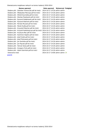 Oświadczenia majątkowe radnych na koniec kadencji 2010-2014 Nazwa operacji Data operacji Wytworzył Podgląd Dodano plik - Zdzisław Tereszczak.pdf do treści 2014-10-17 14:18 admin admin Dodano plik - Władysław Maciupa.pdf do treści 2014-10-17 14:18 admin admin Dodano plik - Witold Szumełda.pdf do treści 2014-10-17 14:18 admin admin Dodano plik - Wacław Pawłowski.pdf do treści 2014-10-17 14:18 admin admin Dodano plik - Ryszard Gołębiowski.pdf do treści 2014-10-17 14:18 admin admin Dodano plik - Ryszard Adamski.pdf do treści 2014-10-17 14:18 admin admin Dodano plik - Renata Muszak.pdf do treści 2014-10-17 14:18 admin admin Dodano plik - Marek Kudła.pdf do treści 2014-10-17 14:18 admin admin Dodano plik - Krzysztof Majcher.pdf do treści 2014-10-17 14:18 admin admin Dodano plik - Krzystof Kołodziejczyk.pdf do treści 2014-10-17 14:18 admin admin Dodano plik - Krystyna Mac.pdf do treści 2014-10-17 14:18 admin admin Dodano plik - Kazimierz Kapłon.pdf do treści 2014-10-17 14:18 admin admin Dodano plik - Józef Zubik.pdf do treści 2014-10-17 14:18 admin admin Dodano plik - Józef Piotrowski.pdf do treści 2014-10-17 14:18 admin admin Dodano plik - Jan Semków.pdf do treści 2014-10-17 14:18 admin admin Dodano plik - Jan Pączek.pdf do treści 2014-10-17 14:18 admin admin Dodano plik - Henryk Sowa.pdf do treści 2014-10-17 14:18 admin admin Dodano plik - Grzegorz Finik.pdf do treści 2014-10-17 14:18 admin admin Dodano plik - Adam Kamiński.pdf do treści 2014-10-17 14:18 admin admin Utworzono treść 2014-10-17 14:08 admin admin powrót Oświadczenia majątkowe radnych na koniec kadencji 2010-2014