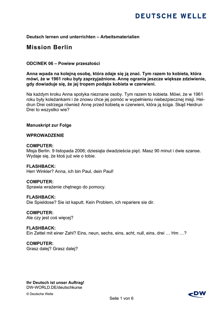 Deutsch lernen und unterrichten – Arbeitsmaterialien Mission Berlin ODCINEK 06 – Powiew przeszłości Anna wpada na kolejną osobę, która zdaje się ją znać. Tym razem to kobieta, która mówi, że w 1961 roku były zaprzyjaźnione. Annę ogrania jeszcze większe zdziwienie, gdy dowiaduje się, że jej tropem podąża kobieta w czerwieni. Na każdym kroku Anna spotyka nieznane osoby. Tym razem to kobieta. Mówi, że w 1961 roku były koleżankami i że znowu chce jej pomóc w wypełnieniu niebezpiecznej misji. Heidrun Drei ostrzega również Annę przed kobietą w czerwieni, która ją ściga. Skąd Heidrun Drei to wszystko wie? Manuskript zur Folge WPROWADZENIE COMPUTER: Misja Berlin. 9 listopada 2006; dziesiąta dwadzieścia pięć. Masz 90 minut i dwie szanse. Wydaje się, że ktoś już wie o tobie. FLASHBACK: Herr Winkler? Anna, ich bin Paul, dein Paul! COMPUTER: Sprawia wrażenie chętnego do pomocy. FLASHBACK: Die Spieldose? Sie ist kaputt. Kein Problem, ich repariere sie dir. COMPUTER: Ale czy jest coś więcej? FLASHBACK: Ein Zettel mit einer Zahl? Eins, neun, sechs, eins, acht, null, eins, drei … Hm …? COMPUTER: Grasz dalej? Grasz dalej? Ihr Deutsch ist unser Auftrag! DW-WORLD.DE/deutschkurse © Deutsche Welle Seite 1 von 6 Deutsch lernen und unterrichten – Arbeitsmaterialien Mission Berlin SYTUACJA 1 – Auf dem Jahrmarkt ANNA: Witaj, jestem gotowa. SPIELER: Dowiedzmy się, co znaczą te cyfry! ANNA: eins, neun, sechs, eins, acht, ooh, zapach prażonych migdałów … VERKÄUFER: Na, junge Frau, was möchten Sie? Gebrannte Mandeln oder einen Liebesapfel? ANNA: Err… oh… Czy on mówi do mnie? Entschuldigung!! VERKÄUFER: Gebrannte Mandeln, schöne Frau oder einen Liebesapfel? ANNA: Einen … Liebesapfel. VERKÄUFER: Hier bitte, der ist genauso knackig wie Sie. Das macht zwei Euro dreißig. ANNA: Eins, … zwei, … drei Euro. VERKÄUFER: Und siebzig Cent zurück. Ich bedanke mich. Wer bekommt als Nächster? HEIDRUN DREI: Guten Appetit, Anna! ANNA: Entschuldigung!? Czego chce ta kobieta? Nie znam jej. HEIDRUN DREI: Wir kennen uns, Anna. Ihr Deutsch ist unser Auftrag! DW-WORLD.DE/deutschkurse © Deutsche Welle Seite 2 von 6 Deutsch lernen und unterrichten – Arbeitsmaterialien Mission Berlin ANNA: Wir? Wer? HEIDRUN DREI: Ich kenne Sie. Sie kennen mich. Ich bin Heidrun. Heidrun Drei. Neunzehnhunderteinundsechzig. Erinnern Sie sich? ANNA: Heidrun Drei? KARTENVERKÄUFER: Geisterbahn: Hereinspaziert, meine Herrschaften, in Drakulas Geisterbahn! Monster und Vampire direkt aus den Karpaten. Mit drei Euro sind Sie dabei. ANNA: Pociąg widmo! Drei Euro i mogę uciekać. ROZSZYFROWANIE 1 SPIELER: Świetnie, Anno! Pozbyłaś się tej kobiety. Stań w kolejce do pociągu widma. ANNA: Ciągle ktoś o mnie wi … to trochę niepokojące. SPIELER: Na pewno … "wir kennen uns", to czasownik zwrotny. ANNA: Ale czy my się znamy? "Wir kennen uns" … Nie sądzę. SPIELER: Jesteś pewna, że nigdy jej nie spotkałaś? ANNA: Gdzie i kiedy? SPIELER: Neunzehnhundert … Tysiąc dziewięćset … Nie rozumiem reszty … Anno, podaj szybko papier! Kilka pierwszych cyfr! Ihr Deutsch ist unser Auftrag! DW-WORLD.DE/deutschkurse © Deutsche Welle Seite 3 von 6 Deutsch lernen und unterrichten – Arbeitsmaterialien Mission Berlin ANNA: Jeden, dziewięć, sześć, jeden …Tysiąc dziewięćset sześćdziesiąt jeden! A ósemka oznacza sierpień … Trzynasty sierpnia … SPIELER: Jesteś naprawdę bystra! SYTUACJA 2 – Heidrun Drei SPIELER: Pospiesz się, weź bilet! KASSIERER: Einmal? ANNA: Ja. KASSIERER: Beeilen Sie sich! ANNA: O nie! To znowu ona! HEIDRUN: Warten Sie, Anna! Ich möchte Ihnen helfen. Wir müssen Berlin retten. COMPUTER: Jeśli wsiądziesz do pociągu – widma, dostaniesz premię – przewodnik po Berlinie. SPIELER: Powodzenia, Anno! HEIDRUN DREI: Anna, Ihre Mission ist riskant. Sie sind in Gefahr. Die Frau in Rot sucht Sie. Auf Wiedersehen! ANNA: Co to było? Err … was? Gefahr? Poczekaj! Warte … Ihr Deutsch ist unser Auftrag! DW-WORLD.DE/deutschkurse © Deutsche Welle Seite 4 von 6 Deutsch lernen und unterrichten – Arbeitsmaterialien Mission Berlin ROZSZYFROWANIE 2 ANNA: Riskant? Gefahr? Frau in Rot? SPIELER: Tak, szuka cię kobieta w czerwieni. ANNA: Czy ona stanowi jakieś zagrożenie? Gefahr? Kobieta ubrana na czerwono? SPIELER: Tak, zgodnie z tym, co mówi Frau Drei. ANNA: A ona chce mi pomóc? SPIELER: Tak. "Ich möchte" … Chciałabym … "Ihnen helfen". ANNA: Ale nic nie zrobiła… dostałam od niej tylko jakąś datę. SPIELER: To nic, ale … ANNA: Co się wydarzyło w 1961??? WNIOSEK COMPUTER: Runda szósta zakończona. Zostały ci dwie szanse. Ale straciłaś Frau Drei, co oznacza dziesięciominutową karę. Masz 75 minut, aby uporać się z misją. Ale czy znasz ludzi, którzy znają ciebie? FLASHBACK: Ich kenne Sie. Sie kennen mich. Ich bin Heidrun, Heidrun Drei. Neunzehnhunderteinundsechzig. Erinnern Sie sich? Ihr Deutsch ist unser Auftrag! DW-WORLD.DE/deutschkurse © Deutsche Welle Seite 5 von 6 Deutsch lernen und unterrichten – Arbeitsmaterialien Mission Berlin COMPUTER: Jak oni mogą wiedzieć więcej od ciebie? FLASHBACK: Anna, Ihre Mission ist riskant. Die Frau in Rot sucht Sie. COMPUTER: Musisz dociekać! Grasz dalej? Grasz dalej? Koprodukcja Deutsche Welle, Polskiego Radia i Radia France International przy wsparciu Unii Europejskiej Ihr Deutsch ist unser Auftrag! DW-WORLD.DE/deutschkurse © Deutsche Welle Seite 6 von 6