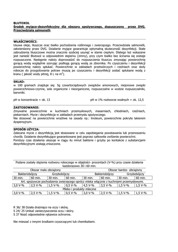 BLUTOXOL Środek myjąco-dezynfekcyjny dla obszaru spożywczego, dopuszczony Przeciwdziała salmonelli. przez DVG. WŁAŚCIWOŚCI: Usuwa oleje, tłuszcze oraz białko pochodzenia roślinnego i zwierzęcego. Przeciwdziała salmonelli, zatwierdzony przez DVG. Działanie myjące gwarantuje optymalną skuteczność dezynfekcji. Stałe zabrudzenia tłuszczowe można znacznie szybciej usunąć w stanie ciepłym. Dlatego też wskazane jest nanieść Blutoxol w odpowiednim stężeniu (zimny), przy czym białko bez ścinania się zostaje rozpuszczone. Następnie należy doprowadzić do rozpuszczenia tłuszczu zmywając powierzchnię gorącą wodą względnie szorując podłogę gorącą wodą ze zbiornika. Po czyszczeniu i dezynfekcji powierzchnię należy spłukać. Powierzchnie w zakładach przetwórczych i rzeźniach oraz stoły robocze do przygotowania potraw muszą po czyszczeniu i dezynfekcji zostać spłukane wodą z kranu ( jakość wody pitnej, 8 L na m2). SKŁAD: w 100 gramach znajduje się: 5g czwartorzędowych związków amonowych, niejonowe związki powierzchniowo-czynne, sole organiczne i nieorganiczne, rozpuszczalne w wodzie rozpuszczalniki, barwniki. pH w koncentracie = ok. 13 pH w 1% roztworze wodnych = ok. 12,5 ZASTOSOWANIE: Zmywalne powierzchnie w kuchniach przemysłowych, masarniach, chłodniach, rzeźniach, piekarniach. Mycie i dezynfekcja w zakładach przemysłu spożywczego. Nie stosować na powierzchnie wrażliwe na zasady np.: linoleum, powierzchnie pokryte lakierem dyspersyjnym. SPOSÓB UŻYCIA: Zalecane mycie z dezynfekcją jest stosowane w celu zapobiegania powstawania lub przenoszeniu chorób. Działanie dezynfekujące gwarantowane jest poprzez całkowite zwilżenie powierzchni. Poniższy czas działania ukazuje w ciągu ilu minut bakterie i grzyby po kontakcie z substancjami dezynfekcyjnymi zostają zniszczone. Podane zostały stężenia roztworu roboczego w objętości- procentach (V-%) przy czasie działania każdorazowo 30 i 60 min. Obszar mało obciążony Obszar bardzo obciążony Bakteriobójczy Grzybobójczy Bakteriobójczy Grzybobójczy 30 min. 60 min. 30 min. 60 min. 30 min. 60 min. 30 min. 60 min. Art. spożywcze pochodzenia zwierzęcego oprócz mleka włącznie z kuchniami przemysłowymi. 3,0 V-% 2,5 V-% 1,5 V-% 0,5 V-% 4,5 V-% 3,5 V-% 1,5 V-% 1,5 V-% Mleko i produkty mleczne 3,0 V-% 2,5 V-% 1,5 V-% 0,5 V-% 3,0 V-% 2,5 V-% 1,5 V-% 1,5 V-% R 36/ 38 Działa drażniąco na oczy i skórę. S 24/ 25 Unikać zanieczyszczenia oczu i skóry. S 37 Nosić odpowiednie rękawice ochronne. Nie mieszać z innymi środkami czyszczącymi lub chemikaliami.