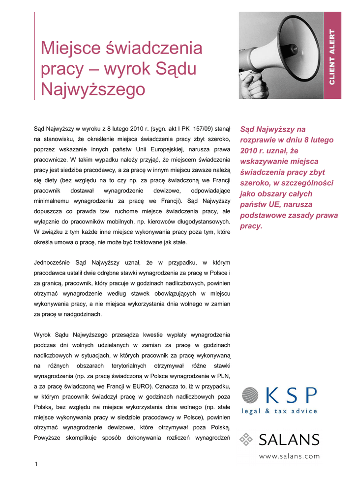 Miejsce świadczenia pracy – wyrok Sądu NajwyŜszego Sąd NajwyŜszy w wyroku z 8 lutego 2010 r. (sygn. akt I PK 157/09) stanął na stanowisku, Ŝe określenie miejsca świadczenia pracy zbyt szeroko, poprzez wskazanie innych państw Unii Europejskiej, narusza prawa pracownicze. W takim wypadku naleŜy przyjąć, Ŝe miejscem świadczenia pracy jest siedziba pracodawcy, a za pracę w innym miejscu zawsze naleŜą się diety (bez względu na to czy np. za pracę świadczoną we Francji pracownik dostawał wynagrodzenie dewizowe, odpowiadające minimalnemu wynagrodzeniu za pracę we Francji). Sąd NajwyŜszy dopuszcza co prawda tzw. ruchome miejsce świadczenia pracy, ale wyłącznie do pracowników mobilnych, np. kierowców długodystansowych. W związku z tym kaŜde inne miejsce wykonywania pracy poza tym, które określa umowa o pracę, nie moŜe być traktowane jak stałe. Jednocześnie Sąd NajwyŜszy uznał, Ŝe w przypadku, w którym pracodawca ustalił dwie odrębne stawki wynagrodzenia za pracę w Polsce i za granicą, pracownik, który pracuje w godzinach nadliczbowych, powinien otrzymać wynagrodzenie według stawek obowiązujących w miejscu wykonywania pracy, a nie miejsca wykorzystania dnia wolnego w zamian za pracę w nadgodzinach. Wyrok Sądu NajwyŜszego przesądza kwestie wypłaty wynagrodzenia podczas dni wolnych udzielanych w zamian za pracę w godzinach nadliczbowych w sytuacjach, w których pracownik za pracę wykonywaną na róŜnych obszarach terytorialnych otrzymywał róŜne stawki wynagrodzenia (np. za pracę świadczoną w Polsce wynagrodzenie w PLN, a za pracę świadczoną we Francji w EURO). Oznacza to, iŜ w przypadku, w którym pracownik świadczył pracę w godzinach nadliczbowych poza Polską, bez względu na miejsce wykorzystania dnia wolnego (np. stałe miejsce wykonywania pracy w siedzibie pracodawcy w Polsce), powinien otrzymać wynagrodzenie dewizowe, które otrzymywał poza Polską. PowyŜsze skomplikuje sposób dokonywania rozliczeń wynagrodzeń 1 Sąd NajwyŜszy na rozprawie w dniu 8 lutego 2010 r. uznał, Ŝe wskazywanie miejsca świadczenia pracy zbyt szeroko, w szczególności jako obszary całych państw UE, narusza podstawowe zasady prawa pracy. pracowników w ramach udzielonego dnia wolnego, gdyŜ rozliczenia będą musiały uwzględniać wypłatę wynagrodzeń w dwóch róŜnych walutach. Jednocześnie rozstrzygniecie Sądu NajwyŜszego stanowi, Ŝe określenie miejsca świadczenia pracy w umowie o pracę poprzez wskazanie kilku krajów Unii Europejskiej z jednoczesnym wskazaniem wynagrodzenie dewizowego za pracę poza Polską, nie uchroni pracodawcy od obowiązku zapłaty diet. Taka interpretacja naszym zdaniem spowoduje podwyŜszenie kosztów utrzymania polskich pracowników za granicą. Nie moŜna pomijać postanowień Dyrektywy 96/71/WE Parlamentu Europejskiego i Rady z 16 grudnia 1996 r. dotyczącących delegowania pracowników w ramach świadczenia usług, które gwarantują pracownikom delegowanym do państw Unii Europejskiej warunki pracy i zatrudnienia, w tym minimalne stawki pracy wraz ze stawką za nadgodziny, co najmniej na poziomie obowiązującym w państwie delegowania. W praktyce, pracodawca wysyłający pracowników czasowo np. do Francji, zobligowany będzie z jednej strony do podwyŜszenia wynagrodzenia do co najmniej minimalnego wynagrodzeniu za pracę we Francji, a z drugiej strony, w świetle polskiego prawa pracy odnoszącego się do obowiązku wypłaty diet za podróŜ słuŜbową, do wypłaty diet. Tym samym, stanowisko Sądu NajwyŜszego rozstrzyga, iŜ wysłanie pracownika zatrudnionego w Polsce do pracy za Kontakt w biurze katowickim: / Contact in the Katowice office: granicą, nie oznacza dorozumianej zmiany miejsca świadczenia pracy, zwalniającą pracodawcę z obowiązku wypłaty diet delegacyjnych. Piotr Krupa T: +48 32 731 68 52 E: [email protected] * * * * * Krupa Srokosz Patryas Sp.k. ul. Chorzowska 50 Mamy nadzieję, Ŝe powyŜsza informacja będzie dla Państwa pomocna. 40-121 Katowice Informacje te nie stanowią opinii prawnej ani porady. W celu uzyskania Poland pełnych informacji lub porady prawnej, prosimy o kontakt. T: +48 32 731 68 52 F: +48 32 731 68 51 www.ksplegal.pl 2