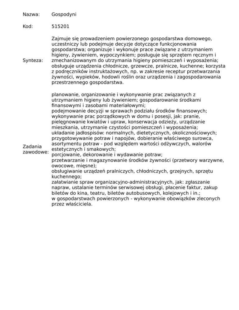 Nazwa: Gospodyni Kod: 515201 Synteza: Zajmuje się prowadzeniem powierzonego gospodarstwa domowego, uczestniczy lub podejmuje decyzje dotyczące funkcjonowania gospodarstwa; organizuje i wykonuje prace związane z utrzymaniem higieny, żywieniem, wypoczynkiem; posługuje się sprzętem ręcznym i zmechanizowanym do utrzymania higieny pomieszczeń i wyposażenia; obsługuje urządzenia chłodnicze, grzewcze, pralnicze, kuchenne; korzysta z podręczników instruktażowych, np. w zakresie receptur przetwarzania żywności, wypieków, hodowli roślin oraz urządzenia i zagospodarowania przestrzennego gospodarstwa. planowanie, organizowanie i wykonywanie prac związanych z utrzymaniem higieny lub żywieniem; gospodarowanie środkami finansowymi i zasobami materiałowymi; podejmowanie decyzji w sprawach podziału środków finansowych; wykonywanie prac porządkowych w domu i posesji, jak: pranie, pielęgnowanie kwiatów i upraw, konserwacja odzieży, urządzanie mieszkania, utrzymanie czystości pomieszczeń i wyposażenia; układanie jadłospisów: normalnych, dietetycznych, okolicznościowych; przygotowywanie potraw i napojów, dobieranie właściwego surowca, asortymentu potraw - pod względem wartości odżywczych, walorów Zadania estetycznych i smakowych; zawodowe: porcjowanie, dekorowanie i wydawanie potraw; przetwarzanie i magazynowanie środków żywności (przetwory warzywne, owocowe, mięsne); obsługiwanie urządzeń pralniczych, chłodniczych, grzejnych, sprzętu kuchennego; załatwianie spraw organizacyjno-administracyjnych, jak: zgłaszanie napraw, ustalanie terminów serwisowej obsługi, płacenie faktur, zakup biletów do kina, teatru, biletów autobusowych, kolejowych i in.; w gospodarstwach powierzonych - wykonywanie obowiązków zleconych przez właściciela.