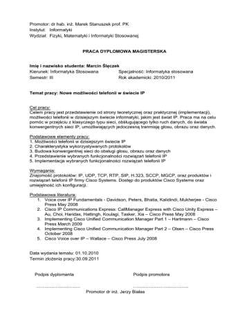 Promotor: dr hab. inż. Marek Stanuszek prof. PK Instytut: Informatyki Wydział: Fizyki, Matematyki i Informatyki Stosowanej PRACA DYPLOMOWA MAGISTERSKA Imię i nazwisko studenta: Marcin Ślęczek Kierunek: Informatyka Stosowana Specjalność: Informatyka stosowana Semestr: III Rok akademicki: 2010/2011 Temat pracy: Nowe możliwości telefonii w świecie IP Cel pracy: Celem pracy jest przedstawienie od strony teoretycznej oraz praktycznej (implementacji), możliwości telefonii w dzisiejszym świecie informatyki, jakim jest świat IP. Praca ma na celu pomóc w przejściu z klasyczego typu sieci, obśługującego tylko ruch danych, do świata konwergentnych sieci IP, umożliwiających jedoczesną tranmisję głosu, obrazu oraz danych. Podstawowe elementy pracy: 1. Możliwości telefonii w dzisiejszym świecie IP 2. Charakterystyka wykorzystywanych protokołów 3. Budowa konwergentnej sieci do obsługi głosu, obrazu oraz danych 4. Przedstawienie wybranych funkcjonalności rozwiązań telefonii IP 5. Implementacja wybranych funkcjonalności rozwiązań telefonii IP Wymagania: Znajomość protokołów: IP, UDP, TCP, RTP, SIP, H.323, SCCP, MGCP, oraz produktów i rozwiązań telefonii IP firmy Cisco Systems. Dostęp do produktów Cisco Systems oraz umiejętność ich konfiguracji. Podstawowa literatura: 1. Voice over IP Fundamentals - Davidson, Peters, Bhatia, Kalidindi, Mukherjee - Cisco Press May 2008 2. Cisco IP Communications Express: CallManager Express with Cisco Unity Express – Au, Choi, Haridas, Hattingh, Koulagi, Tasker, Xia – Cisco Press May 2008 3. Implementing Cisco Unified Communication Manager Part 1 – Hartmann – Cisco Press March 2009 4. Implementing Cisco Unified Communication Manager Part 2 – Olsen – Cisco Press October 2008 5. Cisco Voice over IP – Wallace – Cisco Press July 2008 Data wydania tematu: 01.10.2010 Termin złożenia pracy:30.09.2011 Podpis dyplomanta ……………………….. Podpis promotora ……………………………… Promotor dr inż. Jerzy Białas