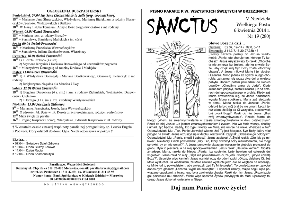 OGŁOSZENIA DUSZPASTERSKI Poniedziałek 07.04 św. Jana Chrzciciela de la Salle (wsp. obowiązkowe) 1800 + Mariannę, Jana Ślusarczyków, Władysława, Mariannę Białek, zm. z rodziny Ślusarczyków, Sochów, Wylazowskich i Białków 1830 W 1-szą r. ślubu Tomasza i Anny o Boże błogosławieństwo z int. rodziny Wtorek 08.04 Dzień Powszedni 1800 + Mariana i zm. z rodziny Brzozów 1830 + Stanisława, Stanisławę Malickich z int. córki Środa 09.04 Dzień Powszedni 1800 + Mariannę Franciszka Wawrzeńczyków 1830 + Stanisława, Juliana Stachurów zam. Wierzbiccy Czwartek 10.04 Dzień Powszedni 1800 1) + Józefa Prokopa (4 r śm) 2) Szymona Krzysiek i Dariusza Bozowskiego od uczestników pogrzebu 1830 + Mieczysława Domagałę od rodziny Kruków i Madajów Piątek 11.04 Dzień Powszedni 1800 1) + Władysława Domagałę i Mariana Bentkowskiego, Genowefę Pietszczyk z int. rodziny 2) Dziękczynno-błagalna dla Marcina i Ewy Sobota 12.04 Dzień Powszedni 1800 1) Bogdana Drzewicza (4 r. śm.) i zm. z rodziny Zielińskich, Woźniaków, Drzewiczów i Gielników 2) + Jerzego (11 r. śm.) i zm. z rodziny Władyszewskich Niedziela 13.04 Niedziela Palmowa 800 + Mariannę, Franciszka, Józefa, Jana Wawrzeńczyków 1000 O zdrowie i bł. Boże w int. Doroty z racji urodzin zam. rodzice i rodzeństwo 1200 Msza święta za parafie 1600 + Reginę Kasperek Ciciorę, Władysława, Edwarda Kasperków z int. rodziny † W ostatnim czasie z naszej wspólnoty parafialnej pożegnaliśmy śp. Leszka Engela z Podwola, który odszedł do domu Ojca. Niech odpoczywa w pokoju † Ekstra… × 07.04 × 10.04 × 11.04 × 12.04 - Światowy Dzień Zdrowia Dzień Służby Zdrowia Dzień Radia Dzień Kosmonautyki Parafia p.w. Wszystkich Świętych Brzeziny ul. Chęcińska 312, 26-026 Morawica, e-mail: [email protected] nr tel. ks. Proboszcz 41 311 42 59, ks. Wikariusz 41 311 48 98 Numer konta: Bank Spółdzielczy w Kielcach Oddział w Morawicy 08 84930004 0070 0205 4104 0001 D O U Ż Y T K U W E W N Ę T R Z N E G O PISMO PARAFII P.W. WSZYSTKICH ŚWIĘTYCH W BRZEZINACH SANCTUS V Niedziela Wielkiego Postu 6 kwietnia 2014 r. Nr 19 (280) Słowo Boże na dziś… Czytania: Ez 37, 12–14 / Rz 8, 8–11 Ewangelia: J 11,3-7.17.20-27.33b-45 „Siostry Łazarza posłały do Jezusa wiadomość: „Panie, oto choruje ten, którego Ty kochasz”. Jezus usłyszawszy to rzekł: „Choroba ta nie zmierza ku śmierci, ale ku chwale Bożej, aby dzięki niej Syn Boży został otoczony chwałą”. A Jezus miłował Martę i jej siostrę, i Łazarza. Mimo jednak że słyszał o jego chorobie, zatrzymał się przez dwa dni w miejscu pobytu. Dopiero potem powiedział do swoich uczniów: „Chodźmy znów do Judei”. Kiedy Jezus tam przybył, zastał Łazarza już od czterech dni spoczywającego w grobie. Kiedy zaś Marta dowiedziała się, że Jezus nadchodzi, wyszła Muna spotkanie. Maria zaś siedziała w domu. Marta rzekła do Jezusa: „Panie, gdybyś tu był, mój brat by nie umarł. Lecz i teraz wiem, że Bóg da Ci wszystko, o cokolwiek byś prosił Boga”. Rzekł do niej Jezus: „Brat twój zmartwychwstanie”. Rzekła Marta do Niego: „Wiem, że zmartwychwstanie w czasie zmartwychwstania w dniu ostatecznym”. Rzekł do niej Jezus: „Ja jestem zmartwychwstaniem i życiem. Kto we Mnie wierzy, choćby i umarł, żyć będzie. Każdy, kto żyje i wierzy we Mnie, nie umrze na wieki. Wierzysz w to?” Odpowiedziała Mu: „Tak, Panie! Ja wciąż wierzę, żeś Ty jest Mesjasz, Syn Boży, który miał przyjść na świat”. Jezus wzruszył się w duchu, rozrzewnił i zapytał: „Gdzieście go położyli?”. Odpowiedzieli Mu: „Panie, chodź i zobacz”. Jezus zapłakał. A Żydzi rzekli: „Oto jak go miłował”. Niektórzy z nich powiedzieli: „Czy Ten, który otworzył oczy niewidomemu, nie mógł sprawić, by on nie umarł?”. A Jezus ponownie okazując wzruszenie głębokie przyszedł do grobu. Była to pieczara, a na niej spoczywał kamień. Jezus rzekł: „Usuńcie kamień”. Siostra zmarłego, Marta, rzekła do Niego: „Panie, już cuch-nie. Leży bowiem od czterech dni w grobie”. Jezus rzekł do niej: „Czyż nie powiedziałem ci, że jeśli uwierzysz, ujrzysz chwałę Bożą?”. Usunięto więc kamień. Jezus wzniósł oczy do góry i rzekł: „Ojcze, dziękuję Ci, żeś Mnie wysłuchał. Ja wiedziałem, że Mnie zawsze wysłuchujesz. Ale ze względu na otaczający Mnie lud to powiedziałem, aby uwierzyli, żeś Ty Mnie posłał”. To powiedziawszy, zawołał donoś-nym głosem: „Łazarzu, wyjdź na zewnątrz!”. I wyszedł zmarły, mając nogi i ręce powiązane opaskami, a twarz jego była zawi-nięta chustą. Rzekł do nich Jezus: „Rozwiążcie goi pozwólcie mu chodzić”. Wielu więc spośród Żydów przybyłych do Marii ujrzawszy to, czego Jezus dokonał, uwierzyło w Niego. Daj nam Panie nowe życie! A w parafii… Boży człowiek… - bł. Pierina Morosini (6 kwietnia) ▪ W dniach 30 III -1IV w naszej parafii odbyły się rekolekcje wielkopostne, które prowadził o. Krzysztof Górski, karmelita z Piotrkowic. Głównym przesłaniem kazań rekolekcjonisty było poszukiwanie prawdziwego obrazu Pana Boga, który tak bardzo współcześnie jest zniekształcony. Drugi dzień ćwiczeń poświęcony był na sakrament Pokuty i Pojednania. O. Krzysztof przypomniał o miłosiernym Bogu, który cały czas na nas czeka. We wtorek rekolekcjonista przypomniał o szczególnej roli modlitwy w życiu chrześcijanina. Mamy nadzieję, że rekolekcje przyniosą owoc. Nigdy człowiek nie jest tak wielki jak wtedy, gdy klęczy. /bł.Jan XIII/ /TK/ ▪ W niedzielę 30 marca odbyła się u nas uroczystość wprowadzenia relikwii św. Rafała Kalinowskiego. Przed uroczystą sumą został wyświetlony w kościele krótki film obrazujący jego życiorys. Zanim rozpoczęła się eucharystia, ksiądz Józef Knap odmówił z parafianami litanię do nowego patrona. Relikwie św. Rafała Kalinowskiego przy dźwiękach