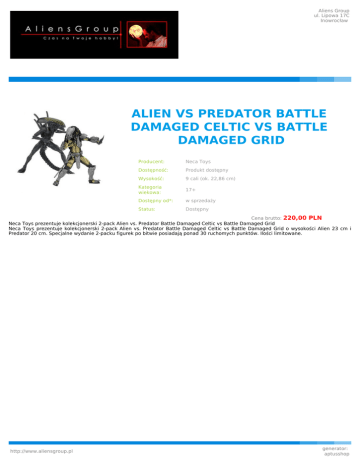 Aliens Group ul. Lipowa 17C Inowrocław ALIEN VS PREDATOR BATTLE DAMAGED CELTIC VS BATTLE DAMAGED GRID Producent: Neca Toys Dostępność: Produkt dostępny Wysokość: 9 cali (ok. 22,86 cm) Kategoria wiekowa: 17+ Dostępny od*: w sprzedaży Status: Dostępny Cena brutto: 220,00 PLN Neca Toys prezentuje kolekcjonerski 2-pack Alien vs. Predator Battle Damaged Celtic vs Battle Damaged Grid Neca Toys prezentuje kolekcjonerski 2-pack Alien vs. Predator Battle Damaged Celtic vs Battle Damaged Grid o wysokości Alien 23 cm i Predator 20 cm. Specjalne wydanie 2-packu figurek po bitwie posiadają ponad 30 ruchomych punktów. Ilości limitowane. http://www.aliensgroup.pl generator: aptusshop