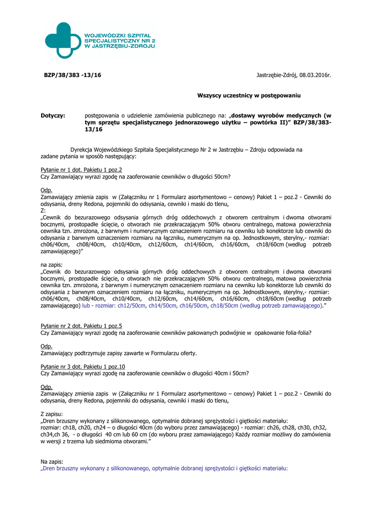 BZP/38/383 -13/16 Jastrzębie-Zdrój, 08.03.2016r. Wszyscy uczestnicy w postępowaniu Dotyczy: postępowania o udzielenie zamówienia publicznego na: „dostawy wyrobów medycznych (w tym sprzętu specjalistycznego jednorazowego użytku – powtórka II)” BZP/38/38313/16 Dyrekcja Wojewódzkiego Szpitala Specjalistycznego Nr 2 w Jastrzębiu – Zdroju odpowiada na zadane pytania w sposób następujący: Pytanie nr 1 dot. Pakietu 1 poz.2 Czy Zamawiający wyrazi zgodę na zaoferowanie cewników o długości 50cm? Odp. Zamawiający zmienia zapis w (Załączniku nr 1 Formularz asortymentowo – cenowy) Pakiet 1 – poz.2 - Cewniki do odsysania, dreny Redona, pojemniki do odsysania, cewniki i maski do tlenu, Z: „Cewnik do bezurazowego odsysania górnych dróg oddechowych z otworem centralnym i dwoma otworami bocznymi, prostopadłe ścięcie, o otworach nie przekraczającym 50% otworu centralnego, matowa powierzchnia cewnika tzn. zmrożona, z barwnym i numerycznym oznaczeniem rozmiaru na cewniku lub konektorze lub cewniki do odsysania z barwnym oznaczeniem rozmiaru na łączniku, numerycznym na op. Jednostkowym, sterylny,- rozmiar: ch06/40cm, ch08/40cm, ch10/40cm, ch12/60cm, ch14/60cm, ch16/60cm, ch18/60cm (według potrzeb zamawiającego)” na zapis: „Cewnik do bezurazowego odsysania górnych dróg oddechowych z otworem centralnym i dwoma otworami bocznymi, prostopadłe ścięcie, o otworach nie przekraczającym 50% otworu centralnego, matowa powierzchnia cewnika tzn. zmrożona, z barwnym i numerycznym oznaczeniem rozmiaru na cewniku lub konektorze lub cewniki do odsysania z barwnym oznaczeniem rozmiaru na łączniku, numerycznym na op. Jednostkowym, sterylny,- rozmiar: ch06/40cm, ch08/40cm, ch10/40cm, ch12/60cm, ch14/60cm, ch16/60cm, ch18/60cm (według potrzeb zamawiającego) lub - rozmiar: ch12/50cm, ch14/50cm, ch16/50cm, ch18/50cm (według potrzeb zamawiającego).” Pytanie nr 2 dot. Pakietu 1 poz.5 Czy Zamawiający wyrazi zgodę na zaoferowanie cewników pakowanych podwójnie w opakowanie folia-folia? Odp. Zamawiający podtrzymuje zapisy zawarte w Formularzu oferty. Pytanie nr 3 dot. Pakietu 1 poz.10 Czy Zamawiający wyrazi zgodę na zaoferowanie cewników o długości 40cm i 50cm? Odp. Zamawiający zmienia zapis w (Załączniku nr 1 Formularz asortymentowo – cenowy) Pakiet 1 – poz.2 - Cewniki do odsysania, dreny Redona, pojemniki do odsysania, cewniki i maski do tlenu, Z zapisu: „Dren brzuszny wykonany z silikonowanego, optymalnie dobranej sprężystości i giętkości materiału: rozmiar: ch18, ch20, ch24 – o długości 40cm (do wyboru przez zamawiającego) - rozmiar: ch26, ch28, ch30, ch32, ch34,ch 36, - o długości 40 cm lub 60 cm (do wyboru przez zamawiającego) Każdy rozmiar możliwy do zamówienia w wersji z trzema lub siedmioma otworami.” Na zapis: „Dren brzuszny wykonany z silikonowanego, optymalnie dobranej sprężystości i giętkości materiału: rozmiar: ch18, ch20, ch24 – o długości 40cm lub 50 cm (do wyboru przez zamawiającego) - rozmiar: ch26, ch28, ch30, ch32, ch34,ch 36, - o długości 40 cm lub 50 cm lub 60 cm (do wyboru przez zamawiającego) Każdy rozmiar możliwy do zamówienia w wersji z trzema lub siedmioma otworami.” Pytanie nr 4 Czy Zamawiający wymaga, aby dostawca zamówionego towaru (jego pracownik) pomagał przy rozładunku towaru w miejscu wskazanym przez Zamawiającego oraz był obecny podczas sprawdzenia zgodności towaru z zamówieniem? Odp. Zamawiający podtrzymuje zapisy zawarte w Formularzu oferty. Pytanie nr 5 Czy Zamawiający wymaga, aby dostawy towaru były wykonywane własnymi środkami transportu Wykonawców bez udziału pośredników? Takie rozwiązanie daje Zamawiającemu pewność należycie wykonanej dostawy oraz tego, że dostarczony towar był przewożony wyłącznie z wyrobami medycznymi. Odp. Zamawiający podtrzymuje zapisy zawarte w Formularzu oferty. Pytanie nr 6 W karcie charakterystyki produktu niebezpiecznego producent wskazuje, w jakich warunkach powinien być przewożony i magazynowany towar. W związku z powyższym czy Zamawiający wymaga, aby dostawy wyrobów medycznych i produktów biobójczych do siedziby Zamawiającego odbywały się środkami transportu, czyli pojazdami wyposażonymi w zabudowy typu „izoterma” ? Odp. Zamawiający podtrzymuje zapisy zawarte w Formularzu oferty (zapis w § 2 ust. 4 wzoru umowy). Pytanie nr 7 Czy Zamawiający wymaga przedstawienia wykazu odpowiednio przystosowanych środków transportu, czyli pojazdów wyposażonych w zabudowy typu „izoterma” do realizacji zamówienia? Odp. Zamawiający podtrzymuje zapisy zawarte w Formularzu oferty. Pytanie nr 8 Czy Zamawiający dopuszcza dostawy towaru za pośrednictwem firmy kurierskie w systemie burta-burta, czyli wyładowanie towaru z auta bez wniesienia we wskazane miejsce ? Odp. Zamawiający podtrzymuje zapisy zawarte w Formularzu oferty. Pytanie nr 9 dot. Pakietu 1 poz.1 Czy Zamawiający dopuści cewniki do odsysania o długości 40cm dla rozmiaru CH 04, spełniające pozostałe wymagania SIWZ? Odp. Zamawiający zmienia zapis w (Załączniku nr 1 Formularz asortymentowo – cenowy) Pakiet 1 – poz.1 - Cewniki do odsysania, dreny Redona, pojemniki do odsysania, cewniki i maski do tlenu, Z zapisu: „Cewnik do bezurazowego odsysania górnych dróg oddechowych z otworem centralnym i dwoma otworami bocznymi, prostopadłe ścięcie, o otworach nie przekraczającym 50% otworu centralnego, matowa powierzchnia cewnika, sterylny o długości 40cm, rozmiar Ch 05, i dług. 30cm dla rozm. Ch04 cewnik ma posiadać barwne i numeryczne oznaczenie rozmiaru na konektorze cewnika oraz fabrycznie nadrukowany rozmiar na opakowaniu, lub cewniki do odsysania z barwnym oznaczeniem rozmiaru na łączniku, numerycznym na op. jednostkowym.” Na zapis: „Cewnik do bezurazowego odsysania górnych dróg oddechowych z otworem centralnym i dwoma otworami bocznymi, prostopadłe ścięcie, o otworach nie przekraczającym 50% otworu centralnego, matow