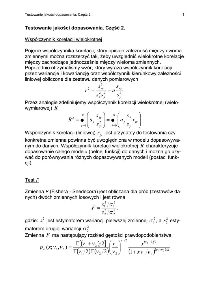 Testowanie jakości dopasowania. Część 2. 1 Testowanie jakości dopasowania. Część 2. Współczynnik korelacji wielokrotnej Pojęcie współczynnika korelacji, który opisuje zależność między dwoma zmiennymi można rozszerzyć tak, żeby uwzględnić wielokrotne korelacje między zachodzące jednocześnie między wieloma zmiennych. Poprzednio otrzymaliśmy wzór, który wyraża współczynnik korelacji przez wariancje i kowariancję oraz współczynnik kierunkowy zależności liniowej obliczone dla zestawu danych pomiarowych r = 2 s xy2 s x2 s 2y =a s xy s y2 . Przez analogię zdefiniujemy współczynnik korelacji wielokrotnej (wielowymiarowej) R s jy m s j R ≡ ∑ a j 2 = ∑ a j r jy s y j =0 s y j =0 Współczynnik korelacji (liniowej) r jy jest przydatny do testowania czy 2 m konkretna zmienna powinna być uwzględniona w modelu dopasowywanym do danych. Współczynnik korelacji wielokrotnej R charakteryzuje dopasowanie całego modelu (pełnej funkcji) do danych i można go używać do porównywania różnych dopasowywanych modeli (postaci funkcji). Test F Zmienna F (Fishera - Snedecora) jest obliczana dla prób (zestawów danych) dwóch zmiennych losowych i jest równa s12 σ 12 F= 2 2. s2 σ 2 gdzie: s1 jest estymatorem wariancji pierwszej zmiennej σ 1 , a s 2 esty2 2 2 matorem drugiej wariancji σ 2 . Zmienna F ma następujący rozkład gęstości prawdopodobieństwa: 2 Γ[(ν 1 + ν 2 ) 2] ν 1 p F ( x; ν 1 ,ν 2 ) = Γ(ν 1 2 ) Γ(ν 2 2 ) ν 2 ν1 2 x (ν 1 − 2 ) 2 (1 + xν 1 ν 2 )(ν1 +ν 2 ) 2 Testowanie jakości dopasowania. Część 2. 2 gdzie x > 0 a ν 1 i ν 2 są liczbami stopni swobody odpowiadającymi s1 2 2 i s2 . Jak wynika z definicji zmiennej F również stosunek zredukowanych 2 zmiennych χ ν ma ten sam rozkład: χ12 ν 1 F= 2 χ2 ν 2 Wykorzystując zmienną F do testowania wartości stosunku χ ν korzy2 stamy z tablic, w których podaje się wartości graniczne Fα ∞ ∫p α= F ( x; ν 1 ,ν 2 ) dx , Fα których przekroczenie może zdarzyć się z określonym prawdopodobieństwem α (zwykle 0,05 i 0,01). Jeżeli uzyskana wartość stosunku F ≥ Fα jest nie mniejsza od granicznej, czyli jest w tym przypadku bardzo mało prawdopodobna (na przykład <0,05 lub <0,01) to mamy prawo przypuszczać, że różnica między 2 wartościami χ ν nie jest przypadkowa, że jest statystycznie istotna, i ich macierzyste rozkłady prawdopodobieństwa (wariancje) są różne. Jeżeli wartość F < Fα , to nie można wykluczyć, że obserwowana różnica jest przypadkowa. Ze względu na konstrukcję tablic wartości granicznych rozkładu zmiennej F przy jej obliczaniu do licznika wstawiamy większą wartość. Rozważmy sumę kwadratów odchyleń S y2 związaną z zakresem danych (rozrzutem względem ich średniej), pomijając dla uproszczenia czynniki wagowe n S = ∑ ( yi − y ) . 2 y 2 i =1 2 S y2 jest statystyką o rozkładzie χ z n − 1 stopniami swobody. Załóżmy dalej, że m y ( xi ) = ∑ a j f j ( x i ) j =0 Testowanie jakości dopasowania. Część 2. 3 oraz oznaczmy 1 n f j = ∑ f j ( xi ) n i =1 Sumę S y2 możemy przekształcić, drogą odpowiednich podstawień i przekształceń (wykorzystując przy tym fakt, że parametry dopasowania spełniają odpowiednie równania), do następującej postaci: n S y2 = ∑ ( yi − y ) 2 i =1 m m n = ∑ ( yi − y ) ∑ a j ( f j ( xi ) − f j ( xi ) ) + ∑ yi − ∑ a j f j ( xi ) i =1 j =0 j =0 i =1 n lub krócej m m n ( yi − y ) = ∑ ( yi − y ) ∑ a j ( f j − f j ) + ∑ yi − ∑ a j f j ∑ i =1 i =1 j =0 j =0 i =1 i po zmianie kolejności sumowania n m n n 2 ( yi − y ) = ∑ a j ∑ [( yi − y ) ( f j − f j )] + ∑ [yi − y ( xi )]2 ∑ i =1 i =1 j =0 i =1 n 2 n 2 W statystyce udowadnia się twierdzenie dotyczące właściwości 2 2 2 zmiennych χ , które mówi, że suma dwóch zmiennych χ1 i χ 2 o ν 1 i ν 2 stopniach swobody jest też zmienną χ 2 o ν = ν 1 + ν 2 stopniach swobody. Jeżeli przyjrzymy się rozkładowi na składniki sumy S y2 , która jest zmienną χ o n − 1 stopniach swobody, to zauważymy, że 2 ∑ [y − y ( x ) ] 2 i i jest też zmienną χ , ale o n − m − 1 stopniach swobody. 2 Zatem pierwszy składnik też musi być zmienną χ o m stopniach 2 swobody. Wróćmy teraz do definicji współczynnika korelacji wielokrotnej R : ∑ (a s ) m s R 2 ≡ ∑ a j jy2 = sy j =0 m j j =0 s y2 jy 2 Testowanie jakości dopasowania. Część 2. 4 Przez analogię możemy przedstawić pierwszy składnik S y2 jako ∑ a j j =0 m Zatem n 2 2 2 [( yi − y ) ( f j − f j )] = R S y = R ∑ ( yi − y )2 ∑ i =1 i =1 n = R 2 ∑ [yi − y ( xi )] + (1 − R 2 )∑ [yi − y ( xi )] gdzie oba składniki po prawej stronie są w dalszym ciągu zmiennymi 2 o rozkładach χ z n − m − 1 i m stopniami swobody. ∑ [y − y ( x ) ] 2 i 2 2 i Sumę S y2 (która jest miarą rozrzutu wartości zmiennej zależnej) nazywa się często początkową sumą kwadratów, a ∑ [y − y ( x ) ] 2 i i resztkową sumą kwadratów (pozostającą po dopasowaniu funkcji y (x) ). W tym kontekście R 2 ∑ [yi − y ( xi )]2 jest częścią początkowego rozrzutu usuniętą przez dopasowania. Dopasowanie (w sensie użytego modelu) jest tym lepsze im większą część początkowego rozrzutu usuwa. Do sprawdzenia czy pozostały rozrzut jest istotnie mniejszy od usuniętego, tzn. czy dopasowanie ma w ogóle sens możemy wykorzystać statystykę F definiując nową wielkość R2 m FR = (1 − R 2 ) (n − m − 1) Testowanie wartości FR jest w istocie testem, że wszystkie współczynniki a j są różne od zera, czyli są znaczące w dopasowywanym modelu. Jeżeli wartość FR nie przekracza granicznej wartości statystyki F , to oznacza to, że parametrów modelu jest za dużo (przynajmniej jeden ze współczynników powinien wynosić zero). Testowanie zasadności dodatkowego parametru modelu Jeżeli dopasujemy do n danych punktów funkcję o m parametrach, to 2 pozostała suma k