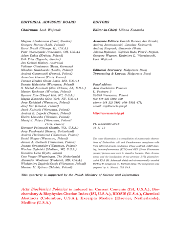 EDITORIAL ADVISORY BOARD EDITORS Chairman: Lech Wojtczak Editor-in-Chief: Liliana Konarska Magnus Abrahamson (Lund, Sweden) Grzegorz Bartosz (Łódź, Poland) Karol Bruzik (Chicago, IL, U.S.A.) Piotr Chomczyński (Cincinnati, OH, U.S.A.) Adam Dubin (Kraków, Poland) Erik Fries (Uppsala, Sweden) Jan Gebicki (Sidney, Australia) Volkmar Gieselmann (Bonn, Germany) Nikodem Grankowski (Lublin, Poland) Andrzej Guranowski (Poznań, Poland) Anne-Lise Haenni (Paris, France) Tomasz Heyduk (Saint Louis, MO, U.S.A.) Danuta Hulanicka (Warszawa, Poland) S. Michal Jazwinski (New Orleans, LA, U.S.A.) Marian Kochman (Wrocław, Poland) Ryszard Kole (Chapel Hill, NC, U.S.A.) Magda Konarska (New York, NY, U.S.A.) Jerzy Kościelak (Warszawa, Poland) Józef Kur (Gdańsk, Poland) Jacek Kuźnicki (Warszawa, Poland) Andrzej B. Legocki (Poznań, Poland) Elwira Lisowska (Wrocław, Poland) Maciej J. Nałęcz (Warszawa, Poland/ Paris, France) Krzysztof Palczewski (Seattle, WA, U.S.A.) Jerzy Paszkowski (Geneva, Switzerland) Andrzej Płucienniczak (Warszawa, Poland) David Shugar (Warszawa, Poland) Janusz A. Siedlecki (Warszawa, Poland) Joanna Strosznajder (Warszawa, Poland) Waclaw Szybalski (Madison, WI, U.S.A.) Kunihiro Ueda (Kyoto, Japan) Cees Veeger (Wageningen, The Netherlands) Alexander Wlodawer (Frederick, MD, U.S.A.) Włodzimierz Zagórski-Ostoja (Warszawa, Poland) Mariusz M. Żydowo (Gdańsk, Poland) Associate Editors: Daniela Barszcz, Jan Brzeski, Andrzej Jerzmanowski, Jarosław Kuśmierek, Andrzej Kasprzak, Sławomir Pikuła, Jolanta Rędowicz, Wojciech Rode, Piotr P. Stępień, Grzegorz Węgrzyn, Kazimierz L. Wierzchowski, Lech Wojtczak Editorial Secretary: Małgorzata Basaj Typesetting & Layout: Małgorzata Basaj Postal address: Acta Biochimica Polonica L. Pasteura 3 02-093 Warszawa, Poland fax: (48 22) 5892 499 phone: (48 22) 5892 400; 5892 471; e-mail: [email protected] http://www.actabp.pl PL ISSN0001-527X 31 11 13 The cover illustration is a compilation of microscopic observations of Escherichia coli and Pseudomonas aeruginosa cells from different growth conditions. Phase contrast, DAPI staining, immunofluorescence (FITC) and GFP (Green Fluorescent protein) fusions were used to visualize bacteria, their chromosomes and the localization of two proteins: R751 plasmid-encoded KfrA (M. Adamczyk data) and chromosomally- encoded ParB of P. aeruginosa (A. Bartosik data). The compilation was prepared by A. Nowak, IBB PAS. This quarterly is supported by the Polish Ministry of Science and Informatics Acta Biochimica Polonica is indexed in: Current Contents (ISI, U.S.A.), Biochemistry & Biophysics Citation Index (ISI, U.S.A.), BIOSIS (U.S.A.), Chemical Abstracts (Columbus, U.S.A.), Excerpta Medica (Elsevier, Netherlands), Medline (U.S.A.)
