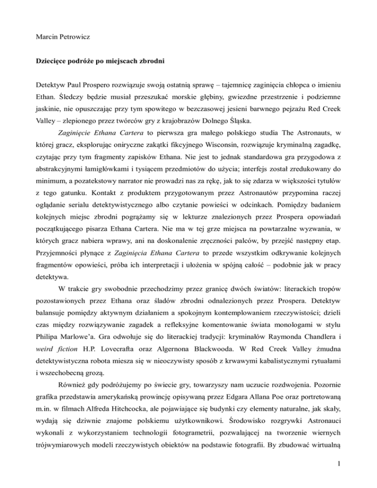Marcin Petrowicz Dziecięce podróże po miejscach zbrodni Detektyw Paul Prospero rozwiązuje swoją ostatnią sprawę – tajemnicę zaginięcia chłopca o imieniu Ethan. Śledczy będzie musiał przeszukać morskie głębiny, gwiezdne przestrzenie i podziemne jaskinie, nie opuszczając przy tym spowitego w bezczasowej jesieni barwnego pejzażu Red Creek Valley – zlepionego przez twórców gry z krajobrazów Dolnego Śląska. Zaginięcie Ethana Cartera to pierwsza gra małego polskiego studia The Astronauts, w której gracz, eksplorując oniryczne zakątki fikcyjnego Wisconsin, rozwiązuje kryminalną zagadkę, czytając przy tym fragmenty zapisków Ethana. Nie jest to jednak standardowa gra przygodowa z abstrakcyjnymi łamigłówkami i tysiącem przedmiotów do użycia; interfejs został zredukowany do minimum, a pozatekstowy narrator nie prowadzi nas za rękę, jak to się zdarza w większości tytułów z tego gatunku. Kontakt z produktem przygotowanym przez Astronautów przypomina raczej oglądanie serialu detektywistycznego albo czytanie powieści w odcinkach. Pomiędzy badaniem kolejnych miejsc zbrodni pogrążamy się w lekturze znalezionych przez Prospera opowiadań początkującego pisarza Ethana Cartera. Nie ma w tej grze miejsca na powtarzalne wyzwania, w których gracz nabiera wprawy, ani na doskonalenie zręczności palców, by przejść następny etap. Przyjemności płynące z Zaginięcia Ethana Cartera to przede wszystkim odkrywanie kolejnych fragmentów opowieści, próba ich interpretacji i ułożenia w spójną całość – podobnie jak w pracy detektywa. W trakcie gry swobodnie przechodzimy przez granicę dwóch światów: literackich tropów pozostawionych przez Ethana oraz śladów zbrodni odnalezionych przez Prospera. Detektyw balansuje pomiędzy aktywnym działaniem a spokojnym kontemplowaniem rzeczywistości; dzieli czas między rozwiązywanie zagadek a refleksyjne komentowanie świata monologami w stylu Philipa Marlowe’a. Gra odwołuje się do literackiej tradycji: kryminałów Raymonda Chandlera i weird fiction H.P. Lovecrafta oraz Algernona Blackwooda. W Red Creek Valley żmudna detektywistyczna robota miesza się w nieoczywisty sposób z krwawymi kabalistycznymi rytuałami i wszechobecną grozą. Również gdy podróżujemy po świecie gry, towarzyszy nam uczucie rozdwojenia. Pozornie grafika przedstawia amerykańską prowincję opisywaną przez Edgara Allana Poe oraz portretowaną m.in. w filmach Alfreda Hitchcocka, ale pojawiające się budynki czy elementy naturalne, jak skały, wydają się dziwnie znajome polskiemu użytkownikowi. Środowisko rozgrywki Astronauci wykonali z wykorzystaniem technologii fotogrametrii, pozwalającej na tworzenie wiernych trójwymiarowych modeli rzeczywistych obiektów na podstawie fotografii. By zbudować wirtualną 1 dolinę w Wisconsin, twórcy gry wykorzystali zdjęcia plenerów Pilchowic, Wrzeszczyna, Karpacza oraz karkonoskich lasów. Efektem tych prac jest nie tylko dwoisty charakter komputerowych scenografii, ale i spójna, melancholijna estetyka, przedstawiona za pomocą zaawansowanej, hiperrealistycznej grafiki, którą docenią nie tylko weterani komputerowej rozrywki. Mimo wielu zalet tytuł był krytykowany przez zagorzałych fanów gier za słabo rozwinięty system mechaniczny gry, a co za tym idzie – niską wartość ludyczną. Dzieło The Astronauts ma zadowolić typowych konsumentów gier – zapalonych geeków, a zarazem stworzyć coś nowego i bardziej artystycznego niż strzelanka z hordami demonicznych potworów. Projekt nie oferuje wiele tradycyjnie pojętego „grania” – mechanicznych wyzwań wymagających nauki zasad rozgrywki, elementów zachęcających do jej powtórnego przejścia w odmienny sposób. W tej materii bardziej przypomina ponowną lekturę powieści Agathy Christie (gdy wiemy już, kto dokonał zbrodni) – czerpiemy przyjemność z obcowania z tekstem i jego formą lub odczytujemy ją w świetle znanego już rozwiązania fabuły. Nie jest to jednak przygodówka tak radykalna jak paraliteracka Dear Esther (The Chinese Room, 2012) czy minimalistyczne doświadczenie Proteusa (Curve Studios, 2013); Zaginięcie Ethana Cartera pozostaje mostem pomiędzy innowacyjnymi i artystycznymi przedsięwzięciami na gruncie wirtualnej rozrywki a sercem kultury gier. Zaginięcie Ethana Cartera The Astronauts data premiery: 25 września 2014 2
