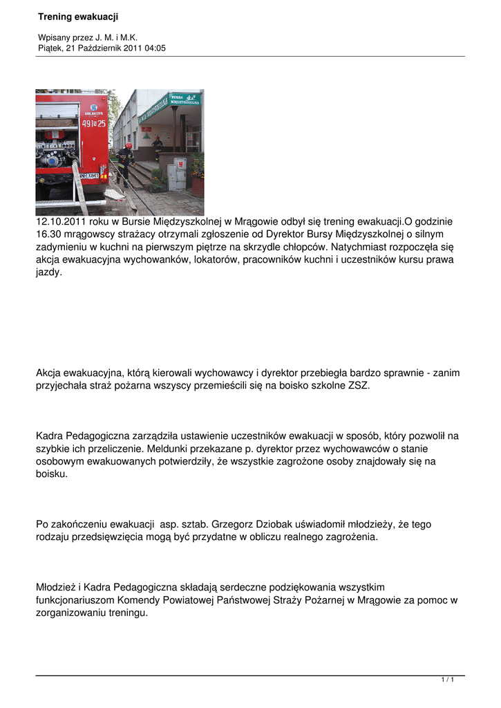 Trening ewakuacji Wpisany przez J. M. i M.K. Piątek, 21 Październik 2011 04:05 12.10.2011 roku w Bursie Międzyszkolnej w Mrągowie odbył się trening ewakuacji.O godzinie 16.30 mrągowscy strażacy otrzymali zgłoszenie od Dyrektor Bursy Międzyszkolnej o silnym zadymieniu w kuchni na pierwszym piętrze na skrzydle chłopców. Natychmiast rozpoczęła się akcja ewakuacyjna wychowanków, lokatorów, pracowników kuchni i uczestników kursu prawa jazdy. Akcja ewakuacyjna, którą kierowali wychowawcy i dyrektor przebiegła bardzo sprawnie - zanim przyjechała straż pożarna wszyscy przemieścili się na boisko szkolne ZSZ. Kadra Pedagogiczna zarządziła ustawienie uczestników ewakuacji w sposób, który pozwolił na szybkie ich przeliczenie. Meldunki przekazane p. dyrektor przez wychowawców o stanie osobowym ewakuowanych potwierdziły, że wszystkie zagrożone osoby znajdowały się na boisku. Po zakończeniu ewakuacji asp. sztab. Grzegorz Dziobak uświadomił młodzieży, że tego rodzaju przedsięwzięcia mogą być przydatne w obliczu realnego zagrożenia. Młodzież i Kadra Pedagogiczna składają serdeczne podziękowania wszystkim funkcjonariuszom Komendy Powiatowej Państwowej Straży Pożarnej w Mrągowie za pomoc w zorganizowaniu treningu. 1/1