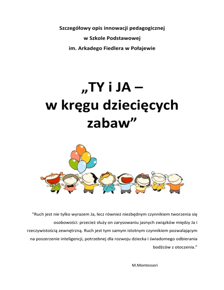 Szczegółowyopisinnowacjipedagogicznej wSzkolePodstawowej im.ArkadegoFiedlerawPołajewie „TYiJA– wkręgudziecięcych zabaw” ”RuchjestnietylkowyrazemJa,leczrównieżniezbędnymczynnikiemtworzeniasię osobowości:przecieżsłużyonzarysowaniujasnychzwiązkówmiędzyJai rzeczywistościązewnętrzną.Ruchjesttymsamymistotnymczynnikiempozwalającym naposzerzenieinteligencji,potrzebnejdlarozwojudzieckaiświadomegoodbierania bodźcówzotoczenia.” M.Montessori 1. Tytułinnowacji: „TYiJA–wkręgudziecięcychzabaw.” 2. Autorinnowacji: JoannaRzekiecka Innowacja przeprowadzona zostanie we współpracy z wychowawcami klas pierwszych. 3. Zakresinnowacji: Działanieminnowacyjnymzostanąobjęciuczniowieklaspierwszych(1a,1b,1c) 4. Czastrwania: Rokszkolny2015/2016 Zajęciabędąodbywałysięrazwtygodniuwwymiarze1godzinalekcyjna. 5. Typinnowacji: -metodyczna 2 Ruchjestpodstawowąaktywnościąwżyciukażdegoczłowieka.Jużwżyciupłodowym maleńkichrozmiarówzarodekspontanicznieiodruchowosięporusza(ok.8tygodniaciąży). Człowiek od poczęcia aż do śmierci odczuwa wzmożoną potrzebę ruchu, potrzebę bycia aktywnym. Często aktywność fizyczna jest męcząca, nierzadko wycieńczająca fizycznie, jednakpomimowysiłkuruchwpływananasrelaksująco,pozwalanaregeneracjępsychiczną i odzyskanie stanu równowagi. Umiarkowany wysiłek podejmowany systematycznie nie męczy,wręczprzeciwnie–pobudzanasdojeszczewiększejaktywnościizintensyfikowania ćwiczeń. Współcześnie dzieci nie potrafią w sposób aktywny zorganizować sobie czasu wolnego.Częstopreferująrozrywkibiernetj.oglądanietelewizji,grykomputerowe,portale społecznościowe, zabawy w sieci. Wymienione powyżej sposoby spędzania wolnego czasu nie tylko wykluczają bycie aktywnym, ale także często podejmowane są samotnie, dziecko nie potrzebuje do dobrej zabawy innych osób, nie odczuwa dyskomfortu z powodu braku kontaktuzrówieśnikami.Zdarzasię,żedzieciwoląkontaktyorazznajomościinternetoweniż prawdziwe relacje z drugą osobą będącą tuż obok. Jeśli pokażemy dziecku, jak czerpać przyjemność z bycia z innymi, może w przyszłości jako nastolatki wybiorą kontakt z drugą osobąwrzeczywistymświeciezamiastnamiastkikontaktuwświeciewirtualnym.Dzisiejsza rzeczywistośćtociągłypośpiech,stres,bezustannawalkaobytiprzetrwanieorazbrakczasu. Żyjąc w takim świecie często zapominamy co jest najważniejsze i jaką hierarchię wartości wyznajemy.Zmęczeniizapracowanirodzicenierzadkoniemajączasunarozmowęzdziećmi, odrabianie lekcji i naukę nie wspominając już o wspólnej zabawie i byciu razem. Także kontakty i zabawy pozaszkolne z rówieśnikami często są trudne bądź niemożliwe. Dzieci z danejklasypochodzązróżnychmiejscowościcosprawia,żepozaszkołączęstokontaktyte nie istnieją. Podtrzymaniu, rozwijaniu i nawiązywaniu nowych, dziecięcych relacji sprzyja przebywanie w świetlicy szkolnej. Właśnie tam dzieci mają czas na wspólną zabawę, spokojnąrozmowę,odrabianielekcjiipogłębianierelacjizinnymi.Jednakitoniewystarcza, zwłaszcza,żedoświetlicyuczęszczatylkoczęśćuczniów. JużwlatachsześćdziesiątychznającirozumiejącpotrzebydzieciWeronikaSherborne wypracowałazmyśląonajmłodszychspecjalnysystemćwiczeń.Ćwiczeniateopartenateorii ruchu Rudolfa Labana i własnych doświadczeniach nazwała: „Developmental Movement”. NazwatatłumaczonajestjakoRuchRozwijający.Takąwłaśnierolęprzypisywałamuautorka, 3 wyrażając główną ideę swojej metody: „posługiwanie się ruchem jako narzędziem wspomaganiarozwojupsychoruchowegodzieckaiterapiizaburzeńtegorozwoju.”1 Opracowany przez nią system ćwiczeń wywodzi się z naturalnych potrzeb dziecka, zaspokajanych w kontakcie z dorosłymi a także z innymi dziećmi. Z tak zwanego baraszkowania,którepojawiasięwewczesnymdzieciństwiekażdegozdrowegodzieckaiw każdej normalnej rodzinie, stworzyła ona system terapeutyczny. Genialność tej metody polegawłaśnienajejprostocieinaturalności.Każdyrodzicwie,jakwieleradościdajeobojgu takie baraszkowanie. Jest ono niezastąpione w procesie rozwojowym dzieci. Dla małego dzieckakontaktprzezdotykjestnajważniejsząformąrelacjizbliskimi.Kontakt,któremunie towarzyszy dotyk, nie prowadzi do pełnej bliskości. Baraszkowanie nie tylko wspomaga i ułatwia rozwój, dostarcza także wiele satysfakcji i radości mając charakter szczerej i beztroskiejzabawy.2 Fizjolodzytwierdzą,żeruchjestdlaczłowiekabłogosławieństwem.Każdyznaswie, jak liczne są korzyści wynikające z ćwiczeń, zabaw ruchowych i uprawiania sportu. Ruch hartuje, wzmaga tężyznę fizyczną, krzepi i wzmacnia cały organizm. Aktywność fizyczna stwarza szansę dziecku do gromadzenia ważnych doświadczeń psychoruchowych a także pobudza do twórczego działania. Ćwiczenia wpływają na podniesienie ogólnej sprawności ruchowej. Aktywność fizyczna czyni nas zdrowszymi. Dzięki niej dłużej możemy cieszyć się młodością.Poprzezruchnaszorganizmstajesięodporniejszy,rzadziejchorujemy(takżena corazczęstszechorobycywilizacyjne).Ruszającsięmamynietylkolepszesamopoczucie,ale również dobrze wyglądamy. Ruch stymuluje rozwój kośćca, wpływa pozytywnie na pracę układu krążenia i oddychania (poprzez wzrost ilości czerwonych krwinek i hemoglobiny). Będąc aktywnymi wpływamy także na rozwój układu nerwowego, stymulujemy pracę naszychzmysłówiusprawniamymiędzyzmysłowąkoordynację. Każdy człowiek bez względu na wiek, prowadzący aktywny tryb życia czerpie ogromne korzyści płynące z wykonywanych ćwiczeń i uprawianych sportów. W przypadku młodego, rozwijającegosięjeszczeorganizmukorzyścitesąnieporównywalne.Jeślidziecięcąpotrzebę ruchu i aktywności stłumi się, źle ukierunkuje albo pozostawi samą sobie, możemy doprowadzićdozaburzeńpozytywnegorozwojudziecka.Współczesnyświatukierunkowany 1 Bogdanowicz M., Kisiel B., Przasnyska M. „Metoda Weroniki Sherborne w terapii i wspomagani