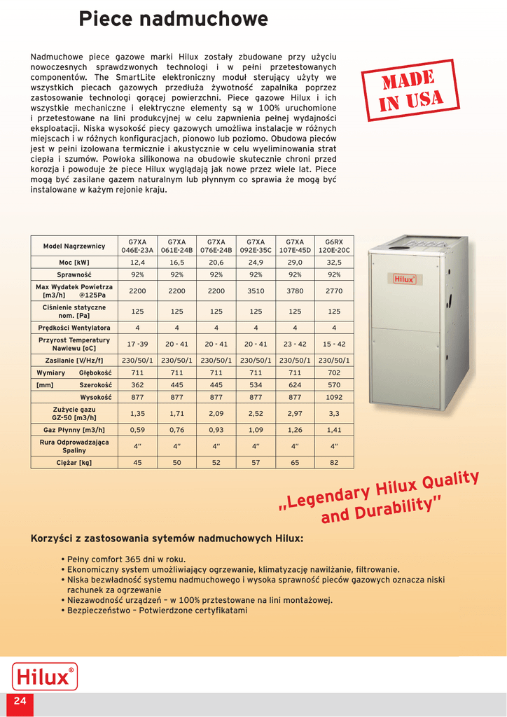 Piece nadmuchowe Nadmuchowe piece gazowe marki Hilux zostay zbudowane przy uƔyciu nowoczesnych sprawdzwonych technologi i w peni przetestowanych componentów. The SmartLite elektroniczny modu sterujģcy uƔyty we wszystkich piecach gazowych przeduƔa ƔywotnoŴĥ zapalnika poprzez zastosowanie technologi gorģcej powierzchni. Piece gazowe Hilux i ich wszystkie mechaniczne i elektryczne elementy sģ w 100% uruchomione i przetestowane na lini produkcyjnej w celu zapwnienia penej wydajnoŴci eksploatacji. Niska wysokoŴĥ piecy gazowych umoƔliwa instalacje w róƔnych miejscach i w róƔnych konÞguracjach, pionowo lub poziomo. Obudowa pieców jest w peni izolowana termicznie i akustycznie w celu wyeliminowania strat ciepa i szumów. Powoka silikonowa na obudowie skutecznie chroni przed korozja i powoduje Ɣe piece Hilux wyglģdajģ jak nowe przez wiele lat. Piece mogģ byĥ zasilane gazem naturalnym lub pynnym co sprawia Ɣe mogģ byĥ instalowane w kaƔym rejonie kraju. Model Nagrzewnicy G7XA 046E-23A G7XA 061E-24B G7XA 076E-24B G7XA 092E-35C G7XA 107E-45D G6RX 120E-20C Moc [kW] 12,4 16,5 20,6 24,9 29,0 32,5 SprawnoųĤ 92% 92% 92% 92% 92% 92% Max Wydatek Powietrza [m3/h] @125Pa 2200 2200 2200 3510 3780 2770 Ciųnienie statyczne nom. [Pa] 125 125 125 125 125 125 PrĶdkoųci Wentylatora 4 4 4 4 4 4 Przyrost Temperatury Nawiewu [oC] 17 -39 20 - 41 20 - 41 20 - 41 23 - 42 15 - 42 Zasilanie [V/Hz/f] 230/50/1 230/50/1 230/50/1 230/50/1 230/50/1 230/50/1 Wymiary GĶbokoųĤ 711 711 711 711 711 702 [mm] SzerokoųĤ 362 445 445 534 624 570 WysokoųĤ 877 877 877 877 877 1092 ZuƓycie gazu GZ-50 [m3/h] 1,35 1,71 2,09 2,52 2,97 3,3 Gaz Pynny [m3/h] 0,59 0,76 0,93 1,09 1,26 1,41 Rura OdprowadzajĢca Spaliny 4” 4” 4” 4” 4” 4” CiĶƓar [kg] 45 50 52 57 65 82 MADE in usa lity a u Q x u l ry Hi a d n e g e „L ility” b a r u D and Korzyųci z zastosowania sytemów nadmuchowych Hilux: • Peny comfort 365 dni w roku. • Ekonomiczny system umoƔliwiajģcy ogrzewanie, klimatyzacjķ nawilƔanie, Þltrowanie. • Niska bezwadnoŴĥ systemu nadmuchowego i wysoka sprawnoŴĥ pieców gazowych oznacza niski rachunek za ogrzewanie • NiezawodnoŴĥ urzģdzeş – w 100% prztestowane na lini montaƔowej. • Bezpieczeşstwo – Potwierdzone certyÞkatami 24