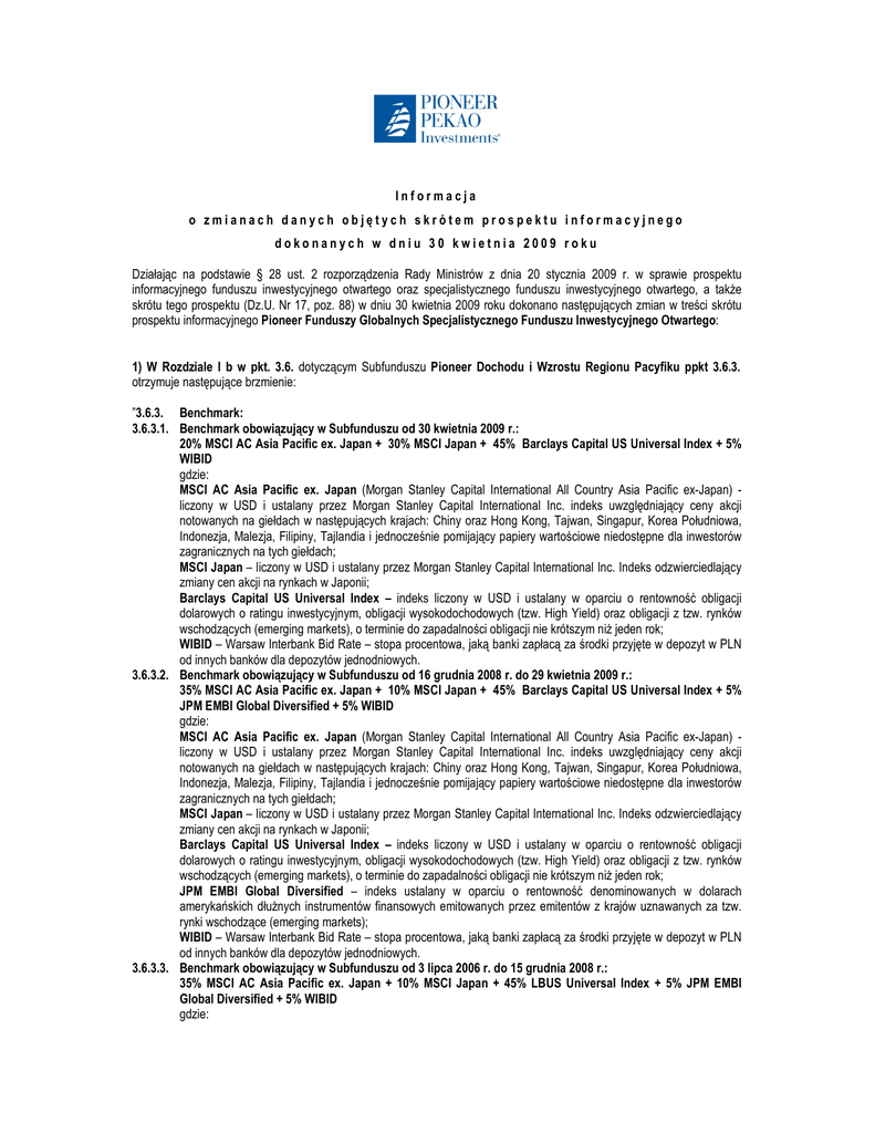 Informacja o zmianach danych objętych skrótem prospektu informacyjnego dokonanych w dniu 30 kwietnia 2009 roku Działając na podstawie § 28 ust. 2 rozporządzenia Rady Ministrów z dnia 20 stycznia 2009 r. w sprawie prospektu informacyjnego funduszu inwestycyjnego otwartego oraz specjalistycznego funduszu inwestycyjnego otwartego, a także skrótu tego prospektu (Dz.U. Nr 17, poz. 88) w dniu 30 kwietnia 2009 roku dokonano następujących zmian w treści skrótu prospektu informacyjnego Pioneer Funduszy Globalnych Specjalistycznego Funduszu Inwestycyjnego Otwartego: 1) W Rozdziale I b w pkt. 3.6. dotyczącym Subfunduszu Pioneer Dochodu i Wzrostu Regionu Pacyfiku ppkt 3.6.3. otrzymuje następujące brzmienie: ”3.6.3. Benchmark: 3.6.3.1. Benchmark obowiązujący w Subfunduszu od 30 kwietnia 2009 r.: 20% MSCI AC Asia Pacific ex. Japan + 30% MSCI Japan + 45% Barclays Capital US Universal Index + 5% WIBID gdzie: MSCI AC Asia Pacific ex. Japan (Morgan Stanley Capital International All Country Asia Pacific ex-Japan) liczony w USD i ustalany przez Morgan Stanley Capital International Inc. indeks uwzględniający ceny akcji notowanych na giełdach w następujących krajach: Chiny oraz Hong Kong, Tajwan, Singapur, Korea Południowa, Indonezja, Malezja, Filipiny, Tajlandia i jednocześnie pomijający papiery wartościowe niedostępne dla inwestorów zagranicznych na tych giełdach; MSCI Japan – liczony w USD i ustalany przez Morgan Stanley Capital International Inc. Indeks odzwierciedlający zmiany cen akcji na rynkach w Japonii; Barclays Capital US Universal Index – indeks liczony w USD i ustalany w oparciu o rentowność obligacji dolarowych o ratingu inwestycyjnym, obligacji wysokodochodowych (tzw. High Yield) oraz obligacji z tzw. rynków wschodzących (emerging markets), o terminie do zapadalności obligacji nie krótszym niż jeden rok; WIBID – Warsaw Interbank Bid Rate – stopa procentowa, jaką banki zapłacą za środki przyjęte w depozyt w PLN od innych banków dla depozytów jednodniowych. 3.6.3.2. Benchmark obowiązujący w Subfunduszu od 16 grudnia 2008 r. do 29 kwietnia 2009 r.: 35% MSCI AC Asia Pacific ex. Japan + 10% MSCI Japan + 45% Barclays Capital US Universal Index + 5% JPM EMBI Global Diversified + 5% WIBID gdzie: MSCI AC Asia Pacific ex. Japan (Morgan Stanley Capital International All Country Asia Pacific ex-Japan) liczony w USD i ustalany przez Morgan Stanley Capital International Inc. indeks uwzględniający ceny akcji notowanych na giełdach w następujących krajach: Chiny oraz Hong Kong, Tajwan, Singapur, Korea Południowa, Indonezja, Malezja, Filipiny, Tajlandia i jednocześnie pomijający papiery wartościowe niedostępne dla inwestorów zagranicznych na tych giełdach; MSCI Japan – liczony w USD i ustalany przez Morgan Stanley Capital International Inc. Indeks odzwierciedlający zmiany cen akcji na rynkach w Japonii; Barclays Capital US Universal Index – indeks liczony w USD i ustalany w oparciu o rentowność obligacji dolarowych o ratingu inwestycyjnym, obligacji wysokodochodowych (tzw. High Yield) oraz obligacji z tzw. rynków wschodzących (emerging markets), o terminie do zapadalności obligacji nie krótszym niż jeden rok; JPM EMBI Global Diversified – indeks ustalany w oparciu o rentowność denominowanych w dolarach amerykańskich dłużnych instrumentów finansowych emitowanych przez emitentów z krajów uznawanych za tzw. rynki wschodzące (emerging markets); WIBID – Warsaw Interbank Bid Rate – stopa procentowa, jaką banki zapłacą za środki przyjęte w depozyt w PLN od innych banków dla depozytów jednodniowych. 3.6.3.3. Benchmark obowiązujący w Subfunduszu od 3 lipca 2006 r. do 15 grudnia 2008 r.: 35% MSCI AC Asia Pacific ex. Japan + 10% MSCI Japan + 45% LBUS Universal Index + 5% JPM EMBI Global Diversified + 5% WIBID gdzie: MSCI AC Asia Pacific ex. Japan (Morgan Stanley Capital International All Country Asia Pacific ex-Japan) liczony w USD i ustalany przez Morgan Stanley Capital International Inc. indeks uwzględniający ceny akcji notowanych na giełdach w następujących krajach: Chiny oraz Hong Kong, Tajwan, Singapur, Korea Południowa, Indonezja, Malezja, Filipiny, Tajlandia i jednocześnie pomijający papiery wartościowe niedostępne dla inwestorów zagranicznych na tych giełdach; MSCI Japan – liczony w USD i ustalany przez Morgan Stanley Capital International Inc. Indeks odzwierciedlający zmiany cen akcji na rynkach w Japonii; Lehman Bros US Universal Index – indeks Lehman Brothers Universal, liczony w USD i ustalany w oparciu o rentowność obligacji dolarowych o ratingu inwestycyjnym, obligacji wysokodochodowych (tzw. High Yield) oraz obligacji z tzw. rynków wschodzących (emerging markets), o terminie do zapadalności obligacji nie krótszym ni: jeden rok; JPM EMBI Global Diversified – indeks ustalany w oparciu o rentowność denominowanych w dolarach amerykańskich dłużnych instrumentów finansowych emitowanych przez emitentów z krajów uznawanych za tzw. rynki wschodzące (emerging markets); WIBID – Warsaw Interbank Bid Rate – stopa procentowa, jaką banki zapłacą za środki przyjęte w depozyt w PLN od innych banków dla depozytów jednodniowych.” 2) W Rozdziale III pkt 8 otrzymuje następujące brzmienie: ”8. Data ostatniej aktualizacji skrótu Prospektu Informacyjnego: 30 kwietnia 2009 r.” Warszawa, 30 kwietnia 2009 r.