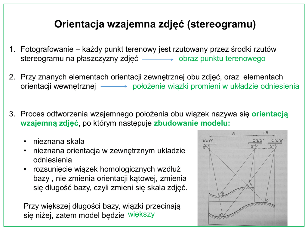 Orientacja wzajemna zdjęć (stereogramu) 1. Fotografowanie – każdy punkt terenowy jest rzutowany przez środki rzutów stereogramu na płaszczyzny zdjęć obraz punktu terenowego 2. Przy znanych elementach orientacji zewnętrznej obu zdjęć, oraz elementach orientacji wewnętrznej położenie wiązki promieni w układzie odniesienia 3. Proces odtworzenia wzajemnego położenia obu wiązek nazywa się orientacją wzajemną zdjęć, po którym następuje zbudowanie modelu: • nieznana skala • nieznana orientacja w zewnętrznym układzie odniesienia • rozsunięcie wiązek homologicznych wzdłuż bazy , nie zmienia orientacji kątowej, zmienia się długość bazy, czyli zmieni się skala zdjęć. Przy większej długości bazy, wiązki przecinają się niżej, zatem model będzie większy Orientacja wewnętrzna zdjęć Xo, Yo, Ck Orientacja wzajemna (zewnętrzna) stereogramu X01, Y01, Z01, φl, ωl, χl X02, Y02, Z02, φp, ωp, χp X01, Y01, Z01, φl, ωl, χl, Bx Δφ, Δω, Δχ, By, Bz Orientacja bezwzględna modelu Współczynnik skali, 3 parametry translacji, trzy obroty kątowe • • • Z punktem terenowym P wiążą się dwa wektory: terenowy P’ i odpowiadający mu wektor obrazowy p’ dla zdjęcia lewego i zdjęcia prawego Znana jest baza B pomiędzy środkami rzutów zdjęć Wektory: P’, p’ dla zdjęcia lewego i prawego, oraz baza B leżą w jednej płaszczyźnie rdzennej przechodzącej przez punkt terenowy P oraz środki rzutów S’, S’’. Wektory te są komplanarne (współpłaszczyznowe) Dwie wiązki promieni (dwa zdjęcia) będą zorientowane względem siebie, jeśli zostanie dla nich narzucony warunek komplanarności odpowiadających sobie (homologicznych) par promieni det Bx X’ X’’ By Y’ Y’’ Bz Z’ Z’’ = det Xo’’-Xo’ Xp-Xo’ Xp-Xo’’ Yo’’-Yo’ Zo’’-Zo’ Yp-Yo’ Zp-Zo’ Yp-Yo’’ Zp-Zo’’ =0 gdzie: Bx, By, Bz – współrzędne wektora bazy X’, Y’, Z’ – współrzędne wektora punktu terenowego dla lewego zdjęcia X’’, Y’’, Z’’ – współrzędne wektora punktu terenowego dla prawego zdjęcia Xp, Yp, Zp – współrzędne terenowe punktu Xo’, Yo’, Zo’ – współrzędne środka rzutów lewego zdjęcia Xo’’, Yo’’, Zo’’ – współrzędne środka rzutów prawego zdjęcia Elementy orientacji zewnętrznej Układ zdefiniowany przez bazę Układ zdefiniowany przez zdjęcie lewe Założenia: Baza jest pozioma: B=Bx; By=Bz=0 Zdjęcie lewe: ϕ, ω=0, χ Zdjęcie prawe: ϕ, ω, χ Założenia: Baza jest pozioma: Bx≠0, By ≠0, Bz ≠0 Zdjęcie lewe jest poziome: ϕ = ω = χ = 0 Zdjęcie prawe: ϕ, ω, χ Niewiadome: ϕ𝑳 , χ 𝑳 , ϕ𝑳 , ω𝑳 , χ 𝑳 Niewiadome: ∆ϕ, ∆ ω, ∆ χ Punkty w rejonach Grubera Kryterium zorientowania wzajemnego xL y L xP y P y P2 q L P x L L x P P ( f ) 0 f f f gdzie q = YL - YP Elementy orientacji wzajemnej można wyznaczyć dokonując pomiaru paralaksy q na punktach standardowych Współrzędne punktów standardowych xL y L xP y P y P2 q L P x L L x P P ( f ) 0 f f f Odejmując lub dodając równania do siebie otrzymamy zależności na elementy orientacji wzajemnej zdjęć: Orientacja bezwzględna Do wykonania orientacji bezwzględnej potrzebne są tzw. fotopunkty, czyli odfotografowane na zdjęciach punkty o znanych współrzędnych w układzie terenowym Transformacja z układu modelu do układu terenowego