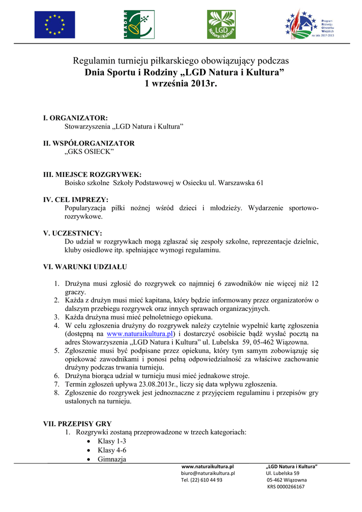 Regulamin turnieju piłkarskiego obowiązujący podczas Dnia Sportu i Rodziny „LGD Natura i Kultura” 1 września 2013r. I. ORGANIZATOR: Stowarzyszenia „LGD Natura i Kultura” II. WSPÓŁORGANIZATOR „GKS OSIECK” III. MIEJSCE ROZGRYWEK: Boisko szkolne Szkoły Podstawowej w Osiecku ul. Warszawska 61 IV. CEL IMPREZY: Popularyzacja piłki nożnej wśród dzieci i młodzieży. Wydarzenie sportoworozrywkowe. V. UCZESTNICY: Do udział w rozgrywkach mogą zgłaszać się zespoły szkolne, reprezentacje dzielnic, kluby osiedlowe itp. spełniające wymogi regulaminu. VI. WARUNKI UDZIAŁU 1. Drużyna musi zgłosić do rozgrywek co najmniej 6 zawodników nie więcej niż 12 graczy. 2. Każda z drużyn musi mieć kapitana, który będzie informowany przez organizatorów o dalszym przebiegu rozgrywek oraz innych sprawach organizacyjnych. 3. Każda drużyna musi mieć pełnoletniego opiekuna. 4. W celu zgłoszenia drużyny do rozgrywek należy czytelnie wypełnić kartę zgłoszenia (dostępną na www.naturaikultura.pl) i dostarczyć osobiście bądź wysłać pocztą na adres Stowarzyszenia „LGD Natura i Kultura” ul. Lubelska 59, 05-462 Wiązowna. 5. Zgłoszenie musi być podpisane przez opiekuna, który tym samym zobowiązuję się opiekować zawodnikami i ponosi pełną odpowiedzialność za właściwe zachowanie drużyny podczas trwania turnieju. 6. Drużyna biorąca udział w turnieju musi mieć jednakowe stroje. 7. Termin zgłoszeń upływa 23.08.2013r., liczy się data wpływu zgłoszenia. 8. Zgłoszenie do rozgrywek jest jednoznaczne z przyjęciem regulaminu i przepisów gry ustalonych na turnieju. VII. PRZEPISY GRY 1. Rozgrywki zostaną przeprowadzone w trzech kategoriach: Klasy 1-3 Klasy 4-6 Gimnazja www.naturaikultura.pl [email protected] Tel. (22) 610 44 93 „LGD Natura i Kultura” Ul. Lubelska 59 05-462 Wiązowna KRS 0000266167 2. Drużyny zgłaszają się na 15 min przed rozpoczęciem meczu. 3. Klucze do szatni pobiera opiekun grupy i oddaje do stolika organizatora najpóźniej 10 min po zakończonym meczu. 4. Dokładny system rozgrywania „Turnieju Piłkarskiego” zostanie podany po upływie terminu zgłoszeń. 5. Terminy spotkań wyznacza organizator. Każda drużyna otrzyma terminarz rozgrywek. 6. Za zwycięstwo drużyna otrzymuje 3 punkty, za remis 1 pkt, przegrana (w tym walkowerem) 0 pkt, wygrana walkowerem 3 pkt. O kolejności w tabeli w fazie eliminacyjnej decyduje: – ilość zdobytych punktów, – wynik bezpośredniego pojedynku między drużynami (w przypadku 3 lub więcej drużyn „mała tabela” uwzględniająca wyniki bezpośrednich pojedynków), – ilość goli dodatnich wynikająca z różnicy goli zdobytych i straconych, – ilość zdobytych goli w turnieju, – dodatkowy mecz. 7. Mecze Rundy Finałowej muszą wyłonić zwycięzcę. W przypadku remisu w regulaminowym czasie, zwycięzców wyłonią serie rzutów karnych (najpierw 5, a jeżeli te nie przyniosą rozstrzygnięcia – seria „ do skutku” – według Przepisów gry w Piłkę Nożną-PZPN) 7a. W meczach o miejsca III i I nastąpi dogrywka, 2 x 5 minut, w której obowiązuje „złota bramka”. 8. Mecz może rozpocząć się tylko wtedy, gdy w każdej drużynie jest minimum 5 zawodników. Jeżeli drużyna jest reprezentowana przez mniejszą liczbę zawodników, uznawana jest za drużynę niekompletną, a wynik meczu zostanie zweryfikowany na jej niekorzyść w stosunku 3:0 i 0 punktów. 9. Turniej odbywa się na boisku sportowym na powierzchni o wymiarach 20x 40 m. 10. Zespoły występują w sześcioosobowych składach (bramkarz + 5 zawodników w polu). 11. Jeżeli w wyniku wykluczeń z boiska w którymkolwiek zespole pozostanie mniej niż 3 zawodników, mecz należy zakończyć. 12. Ilość zmian w locie zawodników z pola podczas trwania rozgrywek jest nieograniczona i nie wymaga przerwy w grze. 13. Zawodnik, który został zmieniony może powtórnie wrócić na boisko podczas kolejnej zmiany. 14. Czas gry - 2 x 15 min. z 5 minutową przerwą + doliczony czas przez sędziego. 15. Rzut karny wykonywany jest z odległości 7 metrów. 16. Rzut od bramki jest rzutem wolnym pośrednim, wykonanym z pola karnego. 17. Sędzia może ukarać zawodnika karą dyscyplinującą w wymiarze czasowym 2 i 5 minut za brutalne faule i niesportowe zachowanie. 18. Nie obowiązuje przepis o spalonym. www.naturaikultura.pl [email protected] Tel. (22) 610 44 93 „LGD Natura i Kultura” Ul. Lubelska 59 05-462 Wiązowna KRS 0000266167 19. Bramka zdobyta bezpośrednio z rozpoczęcia z połowy boiska nie zostanie zaliczona. VIII. NAGRODY 1. Nagrody rzeczowe zostaną przyznane dla zwycięskiej drużyny w każdej z trzech kategorii: klasy 1-3, klasy 4-6, Gimnazja. 2. Ponadto sędziowie wskażą zwycięzców, którzy otrzymają nagrody od Organizatora w następujących kategoriach: Najlepszy zawodnik, Najlepszy bramkarz, Najlepszy strzelec. IX. POSTANOWIENIA KOŃCOWE 1. Sprawy sporne rozstrzyga Organizator turnieju. 2. Termin i godziny rozgrywania meczu ustalone są przez Współorganizatora. 3. W przypadku nie przestrzegania zasad gry i regulaminu turnieju Organizator ma prawo do weryfikacji wyniku turnieju, dyskwalifikacji zawodnika lub drużyny z turnieju. 4. Organizator i Współorganizator nie ponoszą odpowiedzialności prawnej za wypadki wynikające z udziału w turnieju osób chorych oraz skutki wypadków przed, po i czasie gry. 5. Organizator ma prawo do sprawdzenia tożsamości osób biorących udział w rozgrywkach. 6. Organizator zapewnia opiekę medyczną na czas trwania rozgrywek. 7. Organizator zastrzega sobie prawo do nie przyznania nagrody dla najlepszego zawodnika, najlepszego strzelca, najlepszego bramkarza. 8. Ostateczna interpretacja niniejszego regulaminu należy do Organizatora. www.naturaikultura.pl [email protected] Tel. (22) 610 44 93 „LGD Natura i Kultura” Ul. Lubelska 59 05-462 Wiązowna KRS 0000266167