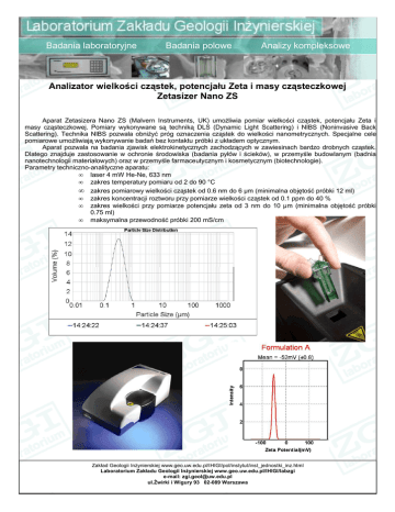 Badania laboratoryjne Badania polowe Analizy kompleksowe Analizator wielkości cząstek, potencjału Zeta i masy cząsteczkowej Zetasizer Nano ZS Aparat Zetasizera Nano ZS (Malvern Instruments, UK) umożliwia pomiar wielkości cząstek, potencjału Zeta i masy cząsteczkowej. Pomiary wykonywane są techniką DLS (Dynamic Light Scattering) i NIBS (Noninvasive Back Scattering). Technika NIBS pozwala obniżyć próg oznaczenia cząstek do wielkości nanometrycznych. Specjalne cele pomiarowe umożliwiają wykonywanie badań bez kontaktu próbki z układem optycznym. Aparat pozwala na badania zjawisk elektrokinetycznych zachodzących w zawiesinach bardzo drobnych cząstek. Dlatego znajduje zastosowanie w ochronie środowiska (badania pyłów i ścieków), w przemyśle budowlanym (badnia nanotechnologii materiałowych) oraz w przemyśle farmaceutycznym i kosmetycznym (biotechnologie). Parametry techniczno-analityczne aparatu: • laser 4 mW He-Ne, 633 nm • zakres temperatury pomiaru od 2 do 90 °C • zakres pomiarowy wielkości cząstek od 0.6 nm do 6 μm (minimalna objętość próbki 12 ml) • zakres koncentracji roztworu przy pomiarze wielkości cząstek od 0.1 ppm do 40 % • zakres wielkości przy pomiarze potencjału zeta od 3 nm do 10 μm (minimalna objętość próbki 0.75 ml) • maksymalna przewodność próbki 200 mS/cm Zakład Geologii Inżynierskiej www.geo.uw.edu.pl/IHIGI/pol/instytut/inst_jednostki_inz.html Laboratorium Zakładu Geologii Inżynierskiej www.geo.uw.edu.pl/IHIGI/labzgi e-mail: [email protected] ul.Żwirki i Wigury 93 02-089 Warszawa