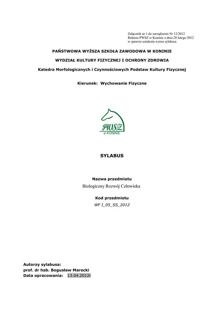 Załącznik nr 1 do zarządzenia Nr 12/2012 Rektora PWSZ w Koninie z dnia 28 lutego 2012 w sprawie ustalenia wzoru sylabusa PAŃSTWOWA WYŻSZA SZKOŁA ZAWODOWA W KONINIE WYDZIAŁ KULTURY FIZYCZNEJ I OCHRONY ZDROWIA Katedra Morfologicznych i Czynnościowych Podstaw Kultury Fizycznej Kierunek: Wychowanie Fizyczne SYLABUS Nazwa przedmiotu Biologiczny Rozwój Człowieka Kod przedmiotu WF I_05_SS_2012 Autorzy sylabusa: prof. dr hab. Bogusław Marecki Data opracowania: 13.04.2012r 1. Podstawowe informacje Poziom kształcenia Profil kształcenia studia pierwszego stopnia praktyczny Forma studiów stacjonarne Rok studiów II, III Semestr IV, V Moduł kształcenia Przygotowanie w zakresie merytorycznym do nauczania pierwszego przedmiotu (prowadzenie zajęć) Forma zajęć wykłady/ćwiczenia Wymiar godzinowy wykład -28g, ćwiczenia 28g Liczba punktów ECTS 5 Język wykładowy polski Forma zaliczenia egzamin Rok akademicki 2012/2013 2. Cele kształcenia C01 Przybliżenie studiującemu biologicznych uwarunkowań przemian morfologicznych i funkcjonalnych zachodzących w organizmie człowieka w procesie ontogenezy. C02 Zapoznanie z wpływem czynników endogennych genetycznych i pozagenetycznych oraz czynników egzogennych, a w tym biogeograficznych i społeczno-kulturowych na rozwój osobniczy i populacyjny. C03 Przedstawienie podstawowych metod kontroli i oceny stanu rozwoju ontogenetycznego dzieci i młodzieży. 3. Wymagania wstępne Student, który rozpoczyna zajęcia z przedmiotu: • Student, który rozpoczyna zajęcia z przedmiotu biologiczny rozwój człowieka powinien posiadać ogólną wiedzę z zakresu budowy anatomicznej oraz funkcjonowania poszczególnych układów człowieka, szczególnie układu ruchu. 4. Efekty kształcenia Objaśnienie oznaczeń: P – przedmiotowe efekty kształcenia W – kategoria wiedzy U – kategoria umiejętności K (po podkreślniku) – kategoria kompetencji społecznych K (przed podkreślnikiem) – kierunkowe efekty kształcenia K_– efekty kształcenia dla kierunku studiów wychowanie fizyczne – efekty kształcenia w obszarze kształcenia w zakresie nauk medycznych i kultury fizycznej dla studiów pierwszego stopnia 01, 02, 03 i kolejne – numer efektu kształcenia 2 Tabela odniesień przedmiotowych efektów kształcenia do efektów kierunkowych i obszarowych Symbol Efekty kształcenia dla przedmiotu Biologiczny Rozwój Człowieka Student, który zaliczył przedmiot: Odniesienie do efektów kształcenia dla kierunku studiów fizjoterapia Odniesienie do efektów kształcenia w obszarze kształcenia w zakresie nauki medyczne, nauki o zdrowiu oraz nauki o kulturze fizycznej P_W01 Umie opisać proces rozwoju osobniczego człowieka w określonym wieku rozwojowym. K_W01 M1_W02 P_U01 Posiada umiejętność wyjaśniania miejsca człowieka w przyrodzie jako istoty biologicznej i społecznej. K_U23 M1_W01 P_K01 Uznaje konieczność stosowania różnorodnych norm rozwojowych do stanu oceny rozwoju fizycznego dzieci i młodzieży. K_K12 M1_K06 P_K02 Stosując wiedzę uzyskaną na zajęciach z biologicznego rozwoju człowieka potrafi rozwiązać problemy zawodowe. K_K12 M1_K05 5. Treści kształcenia WYKŁADY WYK01 WYK02 WYK03 --------WYK04 Definicja i podział przedmiotu. Powiązanie biologicznego rozwoju człowieka z innymi naukami. Cele i zadania biologicznego rozwoju człowieka na studiach wf. Stan biologiczny współczesnej populacji ludzkiej, wynikające z niego zagrożenia, ich ocena oraz rola kultury fizycznej w ich eliminowaniu. -------------------------------------------------------------------------------------odstawowe pojęcia dotyczące rozwoju. WYK05 WYK06 Rozwój ontogenetyczny człowieka i jego periodyzacja. Rozwój wewnątrz – i pozamaciczny. WYK07 WYK08 Rozwój struktury i funkcji w ontogenezie. WYK09 WYK10 Czynniki rozwoju osobniczego. Ogólna charakterystyka i podział czynników rozwoju. liczba godzin 1 1 1 -------------1 2 2 2 WYK11 WYK12 WYK13 Rytmiczność rozwoju ontogenetycznego. Biorytmy w działalności nauczyciela wychowania fizycznego. 3 WYK14 WYK15 WYK16 WYK17 WYK18 WYK19 WYK20 WYK21 WYK22 WYK23 Międzypokoleniowa tendencja przemian w ontogenezie. 2 Typ budowy ciała jako wyraz oddziaływania czynników genetycznych. 2 Aktywność ruchowa modyfikatorem rozwoju. 3 Ogólna charakterystyka normy i „normalności” jako biologicznego układu odniesienia. 3 3 WYK 24 WYK25 WYK26 WYK27 WYK28 ĆW01 ĆW02 ĆW03 ĆW04 ĆW05 ĆW06 ĆW07 ĆW08 ĆW09 ĆW10 ĆW11 ĆW12 ĆW13 Ogólne wiadomości z zakresu kontroli i norm rozwojowych dzieci i młodzieży. 2 Metody oceny stanu rozwoju biologicznego dzieci i młodzieży.. 3 ogółem 28 ĆWICZENIA liczba godzin Podstawowe pojęcia dotyczące rozwoju. 1 Definicja rozwoju fizycznego. Omówienie składowych procesu rozwoju fizycznego. 2 Podział rozwoju osobniczego na okres wewnątrzmaciczny i pozamaciczny. Charakterystyka podokresów rozwojowych wewnątrzmacicznych – jaja płodowego, zarodkowy i płodowy. 2 Charakterystyka kolejnych podokresów rozwojowych okresu pozamacicznego – noworodka, niemowlęcia, wczesnego i starszego dzieciństwa, młodzieńczego, dorosłego, dojrzałego i okresu starości. 4 Wyjaśnienie pojęcia „dymorfizm płciowy”. Omówienie pierwszo -, drugo-, trzecio i czwartorzędowych cech płciowych. 2 Wyjaśnienie pojęcia symetria i asymetria budowy ciała. Omówienie asymetrii morfologicznej, funkcjonalnej, dynamicznej, sensorycznej i psychicznej. 2 ĆW14 ĆW15 Omówienie zagadnień kształtowania się motoryczności człowieka oraz zmian proporcji i postawy ciała zachodzących z wiekiem. ĆW16 Wpływ czynników genetycznych (determinatorów) i paragenetycznych (stymulatorów) na rozwój osobniczy. 1 ĆW17 ĆW18 Wpływ czynników egzogennych biogeograficznych i społeczno - kulturowych (modyfikatorów) na rozwój osobniczy. 2 ĆW19 ĆW20 ĆW21 Charakterystyka rytmów biologicznych – rytm dobowy, tygodniowy, około miesięczny, sezonowy, wieloletni. Anty rytmy. 3 ĆW2