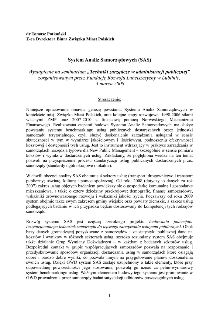 dr Tomasz Potkański Z-ca Dyrektora Biura Związku Miast Polskich System Analiz Samorządowych (SAS) Wystąpienie na seminarium „Techniki zarządcze w administracji publicznej” zorganizowanym przez Fundację Rozwoju Lubelszczyzny w Lublinie, 3 marca 2008 Streszczenie: Niniejsze opracowanie omawia genezę powstania Systemu Analiz Samorządowych w kontekście misji Związku Miast Polskich, oraz kolejne etapy rozwojowe: 1998-2006 siłami własnymi ZMP oraz 2007-2010 z finansową pomocą Norweskiego Mechanizmu Finansowego. Realizowana etapami budowa Systemu Analiz Samorządowych ma służyć powstaniu systemu benchmarkingu usług publicznych dostarczanych przez jednostki samorządu terytorialnego, czyli służyć doskonaleniu zarządzania usługami w sensie skuteczności w tym w wymiarze jakościowym i ilościowym, podnoszeniu efektywności kosztowej i dostępności tych usług. Jest to instrument wdrażający w praktyce zarządzania w samorządach narzędzia typowe dla New Public Management – szczególnie w sensie pomiaru kosztów i wyników dostarczanych usług. Zakładamy, że pogłębiona wiedza na ten temat pozwoli na przyśpieszenie procesu standaryzacji usług publicznych dostarczanych przez samorządy (standardy ogólnokrajowe i lokalne). W chwili obecnej analizy SAS obejmują 4 sektory usług (transport: drogownictwo i transport publiczny; oświatę, kulturę i pomoc społeczną). Od roku 2008 (dotyczy to danych za rok 2007) zakres usług objętych badaniem powiększy się o gospodarkę komunalną i gospodarkę mieszkaniową, a także o cztery dziedziny przekrojowe: demografię, finanse samorządowe, wskaźniki zrównoważonego rozwoju i wskaźniki jakości życia. Począwszy od roku 2009 system obejmie także swym zakresem gminy wiejskie oraz powiaty ziemskie, a zakres usług podlegających badaniu w ich przypadku będzie dostosowany do kompetencji tych rodzajów samorządu. Rozwój systemu SAS jest częścią szerokiego projektu budowania potencjału instytucjonalnego jednostek samorządu do lepszego zarządzania usługami publicznymi. Obok bazy danych gromadzącej pozyskiwane z samorządów i ze statystyki publicznej dane nt. kosztów i wyników w różnych sektorach usług, szeroko rozumiany system SAS obejmuje także działanie Grup Wymiany Doświadczeń – w każdym z badanych sektorów usług. Bezpośredni kontakt w grupie współpracujących samorządów pozwala na rozpoznanie i przedyskutowanie sposobów organizacji dostarczania usług w samorządach które osiągają dobre i bardzo dobre wyniki, co pozwala innym na przygotowanie planów doskonalenia swoich usług. Dzięki GWD system SAS zostaje uzupełniony o takie elementy, które przy odpowiedniej powszechności jego stosowania, pozwolą go uznać za pełno-wymiarowy system benchmarkingu usług. Ważnym elementem budowy tego systemu jest promowanie w GWD prowadzenia przez samorządy badań satysfakcji odbiorców poszczególnych usług. 1 I. Geneza powstania Systemu SAS w kontekście misji Związku Miast Polskich: Wśród statutowych celów Związku Miast Polskich (ZMP) najważniejsze dotyczą reprezentowania na forum krajowym i międzynarodowym interesów miast polskich, w tym, m.in. poprzez uczestnictwo w procesie tworzenia prawa. Ta funkcja jest bardziej znana i oczywista. Jednakże Statut ZMP nakłada na niego także zadanie świadczenia pomocy miastom członkowskim w doskonaleniu form zarządzania w miastach. Niniejszy referat opisuje jedną z głównych form tej działalności. Jednym z podstawowych celów istnienia samorządów, obok wykonywania funkcji regulacyjnych, władczych i organizującej (np. rozwój lokalny) jest dostarczanie usług publicznych członkom wspólnoty samorządowej. Dla celów tego referatu możemy podzielić wszystkie usługi publiczne na 3 ogólne grupy1: – usługi społeczne; – usługi techniczne (zwane też komunalnymi); – usługi administracyjne. Większość środków finansowych jakimi dysponuje jednostka samorządu jest wydatkowanych pośrednio lub bezpośrednio właśnie na dostarczanie usług publicznych. Biorąc pod uwagę skalę środków publicznych jaka jest dostępna samorządom - stanowiącą równowartość ponad 10% PKB - koniecznym jest stworzenie metod oceny efektywności, gospodarności i skuteczności wydatkowania tych środków. System Analiz Samorządowych, którego początki sięgają roku 19972 i ma na celu pomiar kosztów i wyników dostarczanych usług w usługach społecznych i technicznych. Jest także podstawą do stworzenia systemu benchmarkingu w zakresie dostarczania usług publicznych – a więc w zamierzeniach powinien pozwolić na dokonanie czterech kroków z jakich składa się każdy system benchmarkingu: (1) na zmierzenie podstawowych parametrów usług w miastach, które w nim uczestniczą, (2) na porównanie się tych miast w sposób ścisły, (3) na dokonanie analizy sposobu dostarczania usług w miastach które uczestniczą w systemie, oraz powinien pozwolić miastom na (4) udoskonalenie swoje własnych metod dostarczania usług – z korzyścią dla własnych mieszkańców. Nie wszystkie z tych czterech kroków były w pełni możliwe do tej pory w oparciu o SAS. 1 Patrz: Zarządzanie w samorządzie terytorialnym. Najlepsze praktyki, (red) M. Zawicki, St. Mazur, J. Bober, Małopolska Szkoła Administracji Publicznej AE, Kraków 2004, s. 30. 2 Metodologię pomiaru podstawowych parametrów usług w ramach SAS rozpoczęto przygotowywać w roku 1997, korzystając z grantu USAID w ramach projektu Democratic Governance and Public Administration. Pierwsze badania wykonano w roku 1999 na próbie 10 miast, w oparciu o autorską metodologię przygotowaną przez ekspertów Związku. Od roku 2000 system jest rozwijany i finansowany ze środków własnych ZMP i bierze w nim udział corocznie 60-70 miast na zasadzie wolontariatu. W roku 2007 badania SAS włączone zostały w realizację projektu „Budowanie potencjału instytucjonalnego samorząd