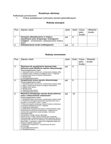 Kosztorys ofertowy Kalkulacja uproszczona I. Prace podstawowe rozliczane cenami jednostkowymi Roboty awaryjne Poz. Zakres robót 1 2 Awaryjne zabezpieczenie w miejscu zapadnięcia pasa drogowego, brakujących urządzeń – oznakowanie i zabezpieczenie miejsca awarii Zabezpieczenie studni antiklapperem Jedn. Ilość Cena jedn. brutto szt. 5 szt. Wartość brutto 2 Roboty remontowe Poz. Zakres robót 3 Wymiana lub uzupełnienie typowej kraty żeliwnej (ruszt 60x40cm) wpustu deszczowego Wyszczególnienie robót: Jedn. Ilość Cena Wartość jedn. brutto brutto szt 5 1. Ustawienie barier ochronnych, oznakowanie miejsca robót.. 2. Pobranie kraty z odzysku z magazynu przy ul. Ceglanej. 3. Dostarczenie kraty na miejsce wbudowania. 4. Montaż kraty. 5. Uporządkowanie terenu. 4 Uzupełnienie kosza wpustu deszczowego Wyszczególnienie robót: szt 5 szt 10 1. Ustawienie barier ochronnych, oznakowanie miejsca robót.. 2. Zakup i dostarczenie kosza na miejsce wbudowania. 3. Zdjęcie kraty wpustu. 4. Montaż kosza. 5. Założenie kraty wpustu. 6. Uporządkowanie terenu. 5 Wymiana istniejącego wpustu (krata żeliwna) wraz z odtworzeniem nawierzchni Wyszczególnienie robót: 1. Ustawienie barier ochronnych, oznakowanie miejsca robót. 2. Rozebranie istniejącej nawierzchni (powierzchnia wraz z wpustem o wymiarach 1,20m x 1,00m) 3. Demontaż wpustu żeliwnego. Element żeliwny odwieziony na miejsce składowania przy ul. Ceglanej. 4. Rozebranie podbudowy. 5. Nadbudowa studzienki pod wpust z zastosowaniem cegły klinkierowej lub pierścienia betonowego , regulacja przy zastosowaniu pierścienia dystansowego z tworzywa sztucznego D400. 6.Osadzenie nowego wpustu żeliwnego. Wpust uliczny z kratą z żeliwa szarego typu uchylnego zatrzaskowego z zabezpieczeniem przed kradzieżą, wpust o wymiarach 40 x 60 cm z ¾ kołnierza, lub pełnym kołnierzem, klasy D400, z zawiasem i ryglem firmy Stąporków Meier lub Koneckie Zakłady Odlewnicze 7.Odtworzenie nawierzchni – przywrócenie do stanu pierwotnego 8. Uporządkowanie terenu. 9. Wywiezienie gruzu. 6 Regulacja pionowa istniejącego wpustu wraz z odtworzeniem nawierzchni Wyszczególnienie robót: szt 5 szt. 10 m 5 szt. 5 1. Ustawienie barier ochronnych, oznakowanie miejsca robót. 2. Rozebranie istniejącej nawierzchni (powierzchnia w rzucie wraz z wpustem o wymiarach 1,20m x 1,00m). 3. Demontaż wpustu żeliwnego. 4. Rozebranie podbudowy. 5. Nadbudowa studzienki pod wpust z zastosowaniem cegły klinkierowej lub pierścienia betonowego, regulacja przy zastosowaniu pierścienia dystansowego z tworzywa sztucznego D400. 6.Osadzenie istniejącego wpustu żeliwnego. 7.Odtworzenie nawierzchni – przywrócenie do stanu pierwotnego. 7 Wymiana całego wpustu deszczowego Wyszczególnienie robót: 1. Ustawienie barier ochronnych, oznakowanie miejsca robót. 2. Rozebranie istniejącej nawierzchni (powierzchnia w rzucie wraz z wpustem o wymiarach 1,20m x 1,00m). 3. Demontaż kraty żeliwnej. Element żeliwny odwieziony na miejsce składowania przy ul. Ceglanej. 4. Demontaż studzienki ściekowej, wyjęcie nadstawy, osadnika 5. Montaż studzienki ściekowej o średnicy 500mm z gotowych elementów betonowych z osadnikiem min. 0,5m. Wykonanie szczelnego włączenia istniejącego przykanalika do studzienki ściekowej. 6. Nadbudowa studzienki pod wpust z zastosowaniem cegły klinkierowej lub pierścienia betonowego , regulacja przy zastosowaniu pierścienia dystansowego z tworzywa sztucznego D400. 7.Osadzenie nowego wpustu żeliwnego z koszem. Wpust uliczny z kratą z żeliwa szarego typu uchylnego zatrzaskowego z zabezpieczeniem przed kradzieżą, wpust o wymiarach 40 x 60 cm z ¾ kołnierza lub pełnym kołnierzem, klasy D400, z zawiasem i ryglem firmy Stąporków Meier lub Koneckie Zakłady Odlewnicze 8.Odtworzenie nawierzchni – przywrócenie do stanu istniejącego. Uporządkowanie terenu. 10. Wywiezienie gruzu. 8 Wykonanie przykanalika ( lub wymniana) o średnicy 160 mm PCV , długości 1,0m i na głębokości 1,5m Wyszczególnienie robót: 1. Ustawienie barier ochronnych, oznakowanie miejsca robót. 2. Rozebranie istniejącej nawierzchni . 3. Rozebranie podbudowy. 4. Wykonanie wykopu na głębokość ok. 1,5 m. 5. Wykonanie podłoża z materiałów sypkich. 6. Montaż przykanalika i połączenie z istniejącą kanalizacja. 7. Zasypanie wykopu wraz zagęszczeniem. 8.Odtworzenie nawierzchni - przywrócenie do stanu pierwotnego 9. Uporządkowanie terenu. 10. Wywiezienie gruzu. 9 Regulacja istniejącego włazu studni wraz z odtworzeniem nawierzchni Wyszczególnienie robót: 1. Ustawienie barier ochronnych, oznakowanie miejsca robót. 2. Rozebranie istniejącej nawierzchni (powierzchnia w rzucie wraz z włazem o wymiarach 1,30m x 1,30m). 3. Rozebranie podbudowy. 4. Demontaż włazu żeliwnego. 5. Nadbudowa studzienki pod właz z zastosowaniem cegły klinkierowej lub pierścienia betonowego , regulacja przy zastosowaniu pierścienia dystansowego z tworzywa sztucznego D400. 6.Osadzenie istniejącego włazu żeliwnego. 7.Odtworzenie nawierzchni – przywrócenie do stanu pierwotnego. 8. Uporządkowanie terenu. 9. Wywiezienie gruzu 10 Wymiana istniejącego włazu studni wraz z odtworzeniem nawierzchni Wyszczególnienie robót: szt. 5 szt. 5 m2 20 m2 20 1. Ustawienie barier ochronnych, oznakowanie miejsca robót. 2. Rozebranie istniejącej nawierzchni (powierzchnia w rzucie wraz z włazem o wymiarach 1,30m x 1,30m). 3. Rozebranie podbudowy . 4. Demontaż włazu żeliwnego. Element żeliwny odwieziony na miejsce składowania przy ul. Ceglanej. 5. Nadbudowa studzienki pod właz z zastosowaniem cegły klinkierowej lub pierścienia betonowego , regulacja przy zastosowaniu pierścienia dystansowego z tworzywa sztucznego D400. 6. Montaż włazu kanalizacyjnego z/bez wentylacją z 2 ryglami z pokrywą typu BEGU o średnicy 600mm, klasy D400, produkcji firmy Stąporków Meier lub Koneckie Zakłady Odlewnicze. W nawierzchniach asfaltowych zastosowanie włazów samopoziomujących jak w