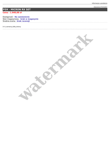 Informacje o produkcie Utworzono 07-03-2017 FOX - MICRON RX SET Cena : 1.940,00 zł Dostępność : Na zamówienie Stan magazynowy : brak w magazynie Średnia ocena : brak recenzji w at er m ar k 3+1,czerwony,żółty,zielony