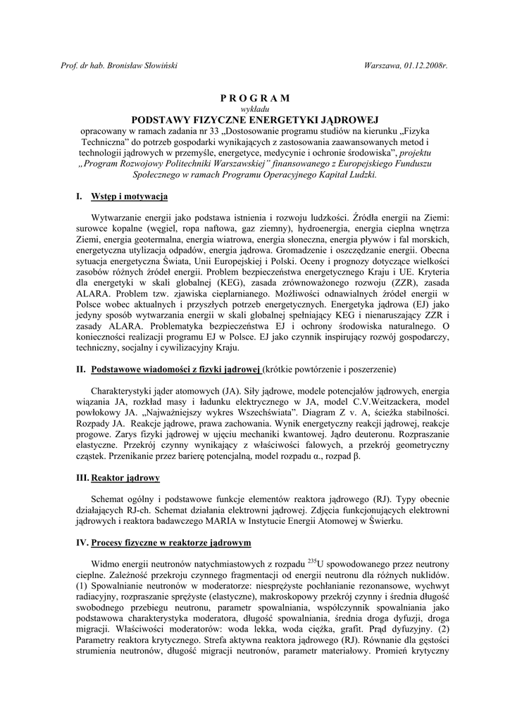 Prof. dr hab. Bronisław Słowiński Warszawa, 01.12.2008r. PROGRAM wykładu PODSTAWY FIZYCZNE ENERGETYKI JĄDROWEJ opracowany w ramach zadania nr 33 „Dostosowanie programu studiów na kierunku „Fizyka Techniczna” do potrzeb gospodarki wynikających z zastosowania zaawansowanych metod i technologii jądrowych w przemyśle, energetyce, medycynie i ochronie środowiska”, projektu „Program Rozwojowy Politechniki Warszawskiej” finansowanego z Europejskiego Funduszu Społecznego w ramach Programu Operacyjnego Kapitał Ludzki. I. Wstęp i motywacja Wytwarzanie energii jako podstawa istnienia i rozwoju ludzkości. Źródła energii na Ziemi: surowce kopalne (węgiel, ropa naftowa, gaz ziemny), hydroenergia, energia cieplna wnętrza Ziemi, energia geotermalna, energia wiatrowa, energia słoneczna, energia pływów i fal morskich, energetyczna utylizacja odpadów, energia jądrowa. Gromadzenie i oszczędzanie energii. Obecna sytuacja energetyczna Świata, Unii Europejskiej i Polski. Oceny i prognozy dotyczące wielkości zasobów różnych źródeł energii. Problem bezpieczeństwa energetycznego Kraju i UE. Kryteria dla energetyki w skali globalnej (KEG), zasada zrównoważonego rozwoju (ZZR), zasada ALARA. Problem tzw. zjawiska cieplarnianego. Możliwości odnawialnych źródeł energii w Polsce wobec aktualnych i przyszłych potrzeb energetycznych. Energetyka jądrowa (EJ) jako jedyny sposób wytwarzania energii w skali globalnej spełniający KEG i nienaruszający ZZR i zasady ALARA. Problematyka bezpieczeństwa EJ i ochrony środowiska naturalnego. O konieczności realizacji programu EJ w Polsce. EJ jako czynnik inspirujący rozwój gospodarczy, techniczny, socjalny i cywilizacyjny Kraju. II. Podstawowe wiadomości z fizyki jądrowej (krótkie powtórzenie i poszerzenie) Charakterystyki jąder atomowych (JA). Siły jądrowe, modele potencjałów jądrowych, energia wiązania JA, rozkład masy i ładunku elektrycznego w JA, model C.V.Weitzackera, model powłokowy JA. „Najważniejszy wykres Wszechświata”. Diagram Z v. A, ścieżka stabilności. Rozpady JA. Reakcje jądrowe, prawa zachowania. Wynik energetyczny reakcji jądrowej, reakcje progowe. Zarys fizyki jądrowej w ujęciu mechaniki kwantowej. Jądro deuteronu. Rozpraszanie elastyczne. Przekrój czynny wynikający z właściwości falowych, a przekrój geometryczny cząstek. Przenikanie przez barierę potencjalną, model rozpadu α., rozpad β. III. Reaktor jądrowy Schemat ogólny i podstawowe funkcje elementów reaktora jądrowego (RJ). Typy obecnie działających RJ-ch. Schemat działania elektrowni jądrowej. Zdjęcia funkcjonujących elektrowni jądrowych i reaktora badawczego MARIA w Instytucie Energii Atomowej w Świerku. IV. Procesy fizyczne w reaktorze jądrowym Widmo energii neutronów natychmiastowych z rozpadu 235U spowodowanego przez neutrony cieplne. Zależność przekroju czynnego fragmentacji od energii neutronu dla różnych nuklidów. (1) Spowalnianie neutronów w moderatorze: niesprężyste pochłanianie rezonansowe, wychwyt radiacyjny, rozpraszanie sprężyste (elastyczne), makroskopowy przekrój czynny i średnia długość swobodnego przebiegu neutronu, parametr spowalniania, współczynnik spowalniania jako podstawowa charakterystyka moderatora, długość spowalniania, średnia droga dyfuzji, droga migracji. Właściwości moderatorów: woda lekka, woda ciężka, grafit. Prąd dyfuzyjny. (2) Parametry reaktora krytycznego. Strefa aktywna reaktora jądrowego (RJ). Równanie dla gęstości strumienia neutronów, długość migracji neutronów, parametr materiałowy. Promień krytyczny sferycznej strefy aktywnej. Minimalne wymiary krytyczne i masy krytyczne dla 233U, 235U i 239Pu. Zasada działania reflektora. (3) Reaktywność RJ: reaktor krytyczny, nadkrytyczny, podkrytyczny. Zjawiska temperaturowe, temperaturowy współczynnik reaktywności. Zmiana składu paliwa jądrowego, gromadzenie się paliwa wtórnego. Zatrucie i zaszlakowanie reaktora. (4) Równanie kinetyki reaktora. Rola neutronów opóźnionych. Układy podkrytyczne sterowane akceleratorami. (5) Głębokość wypalania. Wydzielanie ciepła w reaktorze. V. Metody produkcji paliwa jądrowego Informacje ogólne o produkcji uranu i zasobach rud uranowych na Świecie. Największe kopalnie rud uranowych. Produkt handlowy U3O8 i produkt wyjściowy do wzbogacania uranu UF6. Metody wzbogacania uranu: metoda separacji magnetycznej, metoda dyfuzyjna, ultrawirówka, separacja laserowa. VI. Postępowanie z odpadami promieniotwórczymi Przerób wypalonego paliwa (recykling), paliwo MOX, składowanie, transmutacja. Stan obecny, badania naukowe i możliwe perspektywy. VII. Perspektywy i koncepcje rozwoju obecnej energetyki jądrowej Wysokotemperaturowe reaktory prędkie oraz reaktory działające w cyklu zamkniętym (spalające powyżej 50% uranu naturalnego). Układy ADS działające w reżymie dopalania i transmutacji oraz sterujące reaktorami podkrytycznymi. Tandemy reaktorów cieplnych i prędkich. Koncepcje synergii węglowo-jądrowej. Reaktory działające na torze jako surowcu paliwowym. Również: reaktory średniej (300-700 MW) i małej (do 300 MW) mocy (dla małych i rozwijających się krajów). VIII. Reakcja fuzji jądrowej Podstawowe reakcje syntezy jądrowej i sposoby ich realizacji. Układy toroidalne: tokamak i stelarator. Warunki stabilnego działania. Międzynarodowy program ITER. IX. Problem bezpieczeństwa jądrowego Krótka analiza dotychczasowych awarii jądrowych i ich skutków. Źródła możliwego zagrożenia. Kontrola krajowa i międzynarodowa obiektów energii jądrowej. X. Podstawowe pojęcia dozymetryczne Podstawy fizyczne rejestracji promieniowania jonizującego. Jednostki dawki promieniowania, aktywność źródła, dawka pochłonięta, moc dawki. Biologiczny okres połowicznego zaniku. Dawka równoważna, dawka efektywna, czynniki wagowe, śmiertelne dawki promieniowania, roczne dawki efektywne. Porównanie ryzyka we wsz