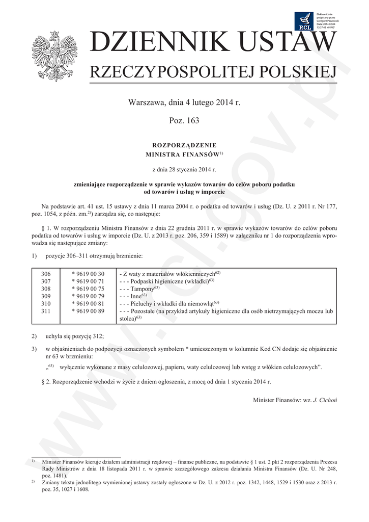 Elektronicznie podpisany przez Grzegorz Paczowski Data: 2014.02.04 13:37:45 +01'00' DZIENNIK USTAW v.p l RZECZYPOSPOLITEJ POLSKIEJ Warszawa, dnia 4 lutego 2014 r. Poz. 163 ROZPORZĄDZENIE MINISTRA FINANSÓW 1) .go z dnia 28 stycznia 2014 r. zmieniające rozporządzenie w sprawie wykazów towarów do celów poboru podatku od towarów i usług w imporcie Na podstawie art. 41 ust. 15 ustawy z dnia 11 marca 2004 r. o podatku od towarów i usług (Dz. U. z 2011 r. Nr 177, poz. 1054, z późn. zm.2)) zarządza się, co następuje: § 1. W rozporządzeniu Ministra Finansów z dnia 22 grudnia 2011 r. w sprawie wykazów towarów do celów poboru podatku od towarów i usług w imporcie (Dz. U. z 2013 r. poz. 206, 359 i 1589) w załączniku nr 1 do rozporządzenia wprowadza się następujące zmiany: pozycje 306–311 otrzymują brzmienie: w. rcl 1) 306 307 308 309 310 311 2) 3) * 9619 00 30 * 9619 00 71 * 9619 00 75 * 9619 00 79 * 9619 00 81 * 9619 00 89 - Z waty z materiałów włókienniczych62) - - - Podpaski higieniczne (wkładki)63) - - - Tampony63) - - - Inne63) - - - Pieluchy i wkładki dla niemowląt63) - - - Pozostałe (na przykład artykuły higieniczne dla osób nietrzymających moczu lub stolca)63) uchyla się pozycję 312; w objaśnieniach do podpozycji oznaczonych symbolem * umieszczonym w kolumnie Kod CN dodaje się objaśnienie nr 63 w brzmieniu: „63) wyłącznie wykonane z masy celulozowej, papieru, waty celulozowej lub wstęg z włókien celulozowych”. ww § 2. Rozporządzenie wchodzi w życie z dniem ogłoszenia, z mocą od dnia 1 stycznia 2014 r. 1) 2) Minister Finansów: wz. J. Cichoń Minister Finansów kieruje działem administracji rządowej – finanse publiczne, na podstawie § 1 ust. 2 pkt 2 rozporządzenia Prezesa Rady Ministrów z dnia 18 listopada 2011 r. w sprawie szczegółowego zakresu działania Ministra Finansów (Dz. U. Nr 248, poz. 1481). Zmiany tekstu jednolitego wymienionej ustawy zostały ogłoszone w Dz. U. z 2012 r. poz. 1342, 1448, 1529 i 1530 oraz z 2013 r. poz. 35, 1027 i 1608.