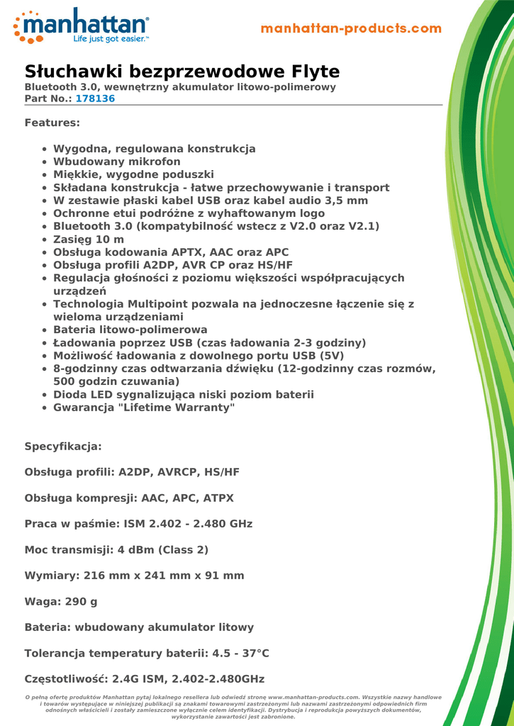 Słuchawki bezprzewodowe Flyte Bluetooth 3.0, wewnętrzny akumulator litowo-polimerowy Part No.: 178136 Features: Wygodna, regulowana konstrukcja Wbudowany mikrofon Miękkie, wygodne poduszki Składana konstrukcja - łatwe przechowywanie i transport W zestawie płaski kabel USB oraz kabel audio 3,5 mm Ochronne etui podróżne z wyhaftowanym logo Bluetooth 3.0 (kompatybilność wstecz z V2.0 oraz V2.1) Zasięg 10 m Obsługa kodowania APTX, AAC oraz APC Obsługa profili A2DP, AVR CP oraz HS/HF Regulacja głośności z poziomu większości współpracujących urządzeń Technologia Multipoint pozwala na jednoczesne łączenie się z wieloma urządzeniami Bateria litowo-polimerowa Ładowania poprzez USB (czas ładowania 2-3 godziny) Możliwość ładowania z dowolnego portu USB (5V) 8-godzinny czas odtwarzania dźwięku (12-godzinny czas rozmów, 500 godzin czuwania) Dioda LED sygnalizująca niski poziom baterii Gwarancja "Lifetime Warranty" Specyfikacja: Obsługa profili: A2DP, AVRCP, HS/HF Obsługa kompresji: AAC, APC, ATPX Praca w paśmie: ISM 2.402 - 2.480 GHz Moc transmisji: 4 dBm (Class 2) Wymiary: 216 mm x 241 mm x 91 mm Waga: 290 g Bateria: wbudowany akumulator litowy Tolerancja temperatury baterii: 4.5 - 37°C Częstotliwość: 2.4G ISM, 2.402-2.480GHz O pełną ofertę produktów Manhattan pytaj lokalnego resellera lub odwiedź stronę www.manhattan-products.com. Wszystkie nazwy handlowe i towarów występujące w niniejszej publikacji są znakami towarowymi zastrzeżonymi lub nazwami zastrzeżonymi odpowiednich firm odnośnych właścicieli i zostały zamieszczone wyłącznie celem identyfikacji. Dystrybucja i reprodukcja powyższych dokumentów, wykorzystanie zawartości jest zabronione. Impedancja: 50R Czułość: -88dbm (typical) Certyfikaty: Bluetooth FCC CE RoHS O pełną ofertę produktów Manhattan pytaj lokalnego resellera lub odwiedź stronę www.manhattan-products.com. Wszystkie nazwy handlowe i towarów występujące w niniejszej publikacji są znakami towarowymi zastrzeżonymi lub nazwami zastrzeżonymi odpowiednich firm odnośnych właścicieli i zostały zamieszczone wyłącznie celem identyfikacji. Dystrybucja i reprodukcja powyższych dokumentów, wykorzystanie zawartości jest zabronione. O pełną ofertę produktów Manhattan pytaj lokalnego resellera lub odwiedź stronę www.manhattan-products.com. Wszystkie nazwy handlowe i towarów występujące w niniejszej publikacji są znakami towarowymi zastrzeżonymi lub nazwami zastrzeżonymi odpowiednich firm odnośnych właścicieli i zostały zamieszczone wyłącznie celem identyfikacji. Dystrybucja i reprodukcja powyższych dokumentów, wykorzystanie zawartości jest zabronione.