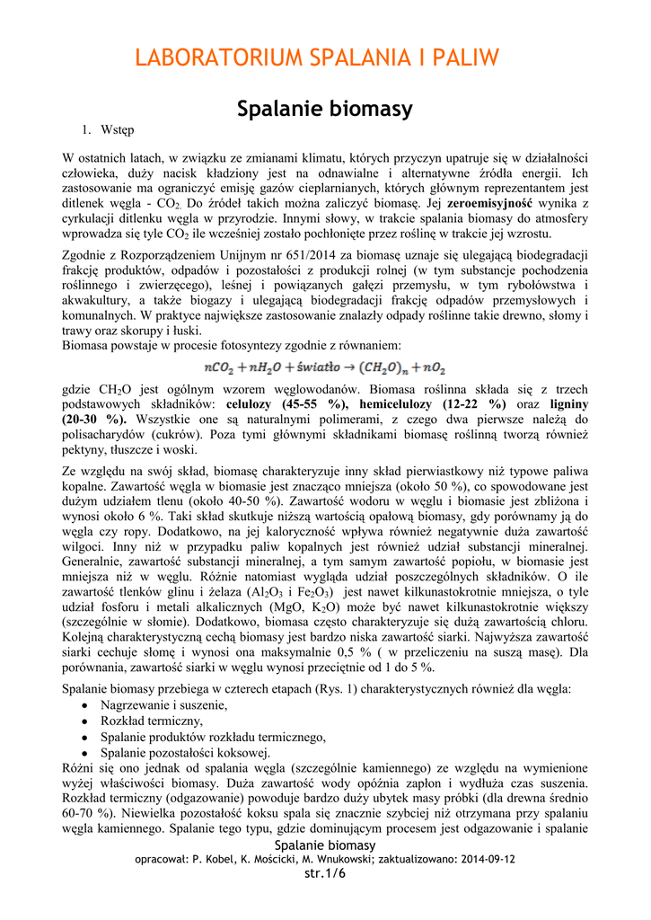 LABORATORIUM SPALANIA I PALIW Spalanie biomasy 1. Wstęp W ostatnich latach, w związku ze zmianami klimatu, których przyczyn upatruje się w działalności człowieka, duży nacisk kładziony jest na odnawialne i alternatywne źródła energii. Ich zastosowanie ma ograniczyć emisję gazów cieplarnianych, których głównym reprezentantem jest ditlenek węgla - CO2. Do źródeł takich można zaliczyć biomasę. Jej zeroemisyjność wynika z cyrkulacji ditlenku węgla w przyrodzie. Innymi słowy, w trakcie spalania biomasy do atmosfery wprowadza się tyle CO2 ile wcześniej zostało pochłonięte przez roślinę w trakcie jej wzrostu. Zgodnie z Rozporządzeniem Unijnym nr 651/2014 za biomasę uznaje się ulegającą biodegradacji frakcję produktów, odpadów i pozostałości z produkcji rolnej (w tym substancje pochodzenia roślinnego i zwierzęcego), leśnej i powiązanych gałęzi przemysłu, w tym rybołówstwa i akwakultury, a także biogazy i ulegającą biodegradacji frakcję odpadów przemysłowych i komunalnych. W praktyce największe zastosowanie znalazły odpady roślinne takie drewno, słomy i trawy oraz skorupy i łuski. Biomasa powstaje w procesie fotosyntezy zgodnie z równaniem: gdzie CH2O jest ogólnym wzorem węglowodanów. Biomasa roślinna składa się z trzech podstawowych składników: celulozy (45-55 %), hemicelulozy (12-22 %) oraz ligniny (20-30 %). Wszystkie one są naturalnymi polimerami, z czego dwa pierwsze należą do polisacharydów (cukrów). Poza tymi głównymi składnikami biomasę roślinną tworzą również pektyny, tłuszcze i woski. Ze względu na swój skład, biomasę charakteryzuje inny skład pierwiastkowy niż typowe paliwa kopalne. Zawartość węgla w biomasie jest znacząco mniejsza (około 50 %), co spowodowane jest dużym udziałem tlenu (około 40-50 %). Zawartość wodoru w węglu i biomasie jest zbliżona i wynosi około 6 %. Taki skład skutkuje niższą wartością opałową biomasy, gdy porównamy ją do węgla czy ropy. Dodatkowo, na jej kaloryczność wpływa również negatywnie duża zawartość wilgoci. Inny niż w przypadku paliw kopalnych jest również udział substancji mineralnej. Generalnie, zawartość substancji mineralnej, a tym samym zawartość popiołu, w biomasie jest mniejsza niż w węglu. Różnie natomiast wygląda udział poszczególnych składników. O ile zawartość tlenków glinu i żelaza (Al2O3 i Fe2O3) jest nawet kilkunastokrotnie mniejsza, o tyle udział fosforu i metali alkalicznych (MgO, K2O) może być nawet kilkunastokrotnie większy (szczególnie w słomie). Dodatkowo, biomasa często charakteryzuje się dużą zawartością chloru. Kolejną charakterystyczną cechą biomasy jest bardzo niska zawartość siarki. Najwyższa zawartość siarki cechuje słomę i wynosi ona maksymalnie 0,5 % ( w przeliczeniu na suszą masę). Dla porównania, zawartość siarki w węglu wynosi przeciętnie od 1 do 5 %. Spalanie biomasy przebiega w czterech etapach (Rys. 1) charakterystycznych również dla węgla: Nagrzewanie i suszenie, Rozkład termiczny, Spalanie produktów rozkładu termicznego, Spalanie pozostałości koksowej. Różni się ono jednak od spalania węgla (szczególnie kamiennego) ze względu na wymienione wyżej właściwości biomasy. Duża zawartość wody opóźnia zapłon i wydłuża czas suszenia. Rozkład termiczny (odgazowanie) powoduje bardzo duży ubytek masy próbki (dla drewna średnio 60-70 %). Niewielka pozostałość koksu spala się znacznie szybciej niż otrzymana przy spalaniu węgla kamiennego. Spalanie tego typu, gdzie dominującym procesem jest odgazowanie i spalanie Spalanie biomasy opracował: P. Kobel, K. Mościcki, M. Wnukowski; zaktualizowano: 2014-09-12 str.1/6 LABORATORIUM SPALANIA I PALIW jego produktów, jest charakterystyczne dla paliw od dużej zawartości części lotnych, np. młodych węgli takich jak węgiel brunatny. Części lotne otrzymywane są w wyniku rozkładu termicznego hemicelulozy, celulozy i ligniny. Składniki te ulegają rozkładowi w różnym zakresie temperatur: Hemiceluloza 220÷320 °C, Celuloza 320÷370 °C, Lignina 320÷500 °C. Rysunek 1. Etapy spalania biomasy. Poza wymienionymi różnicami w procesie spalania, użytkowanie biomasy jako paliwa nastręcza dodatkowych problemów: ze względu na swoją włóknistą strukturę biomasa nie nadaje się do mielanie w młynach kulowych. Jej rozdrobnienie jest znacznie bardziej energochłonne niż ma to miejsce w przypadku węgla, niska gęstość nasypowa powoduje, że transport biomasy jest kosztowny, duża zawartość chloru oraz metali alkalicznych powoduje szlakowanie kotła, korozję i defluidyzację złoża (w paleniskach fluidalnych). Paleniska na biomasę powinny uwzględniać specyfikę jej spalania: dłuższą fazę suszenia, dłuższy płomień (wynikający ze spalania części lotnych) czy niższą temperaturę mięknienia popiołu. Z względu na organizację procesu spalania wyróżnia się cztery podstawowe typy palenisk stosowanych również przy spalaniu węgla: Paleniska rusztowe (warstwowe) Fluidalne Retortowe Cyklonowe Dość powszechnym, zwłaszcza w Polsce, procesem wykorzystanie biomasy na dużą skalę jest współspalanie z węglem, które może odbywać się również w kotłach pyłowych. Ze względu na swoje niekorzystne właściwości, biomasę na cele energetyczne poddaje się wstępnej obróbce. Do podstawowych procesów obróbki należy suszenie, rozdrabnianie i zagęszczania. Do tego ostatniego zalicza się peletyzację czy brykietowanie. W ich wyniku, poprzez zastosowanie pras mechanicznych (peletyzarek i brykieciarek) i często dodatku lepiszcza, otrzymuje się bardziej zwarty, łatwiejszy w transporcie i operowaniu produkt. Innym, bardziej zaawansowanym procesem mającym na celu uszlachetnienie biomasy jako paliwa jest toryfikacja. Proces ten polega na termicznym traktowaniu biomasy bez dostępu powietrza w średnim zakresie temperatur (250÷300 °C). W efekcie t