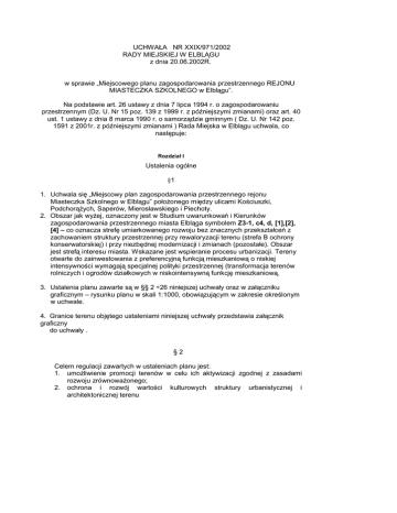 UCHWAŁA NR XXIX/971/2002 RADY MIEJSKIEJ W ELBLĄGU z dnia 20.06.2002R. w sprawie „Miejscowego planu zagospodarowania przestrzennego REJONU MIASTECZKA SZKOLNEGO w Elblągu”. Na podstawie art. 26 ustawy z dnia 7 lipca 1994 r. o zagospodarowaniu przestrzennym (Dz. U. Nr 15 poz. 139 z 1999 r. z późniejszymi zmianami) oraz art. 40 ust. 1 ustawy z dnia 8 marca 1990 r. o samorządzie gminnym ( Dz. U. Nr 142 poz. 1591 z 2001r. z późniejszymi zmianami ) Rada Miejska w Elblągu uchwala, co następuje: Rozdział I Ustalenia ogólne §1 1. Uchwala się „Miejscowy plan zagospodarowania przestrzennego rejonu Miasteczka Szkolnego w Elblągu” połoŜonego między ulicami Kościuszki, PodchorąŜych, Saperów, Mierosławskiego i Piechoty. 2. Obszar jak wyŜej, oznaczony jest w Studium uwarunkowań i Kierunków zagospodarowania przestrzennego miasta Elbląga symbolem Z3-1, c4, d, [1],[2], [4] – co oznacza strefę umiarkowanego rozwoju bez znacznych przekształceń z zachowaniem struktury przestrzennej przy rewaloryzacji terenu (strefa B ochrony konserwatorskiej) i przy niezbędnej modernizacji i zmianach (pozostałe). Obszar jest strefą interesu miasta. Wskazane jest wspieranie procesu urbanizacji. Tereny otwarte do zainwestowania z preferencyjną funkcją mieszkaniową o niskiej intensywności wymagają specjalnej polityki przestrzennej (transformacja terenów rolniczych i ogrodów działkowych w niskointensywną funkcję mieszkaniową. 3. Ustalenia planu zawarte są w §§ 2 ÷26 niniejszej uchwały oraz w załączniku graficznym – rysunku planu w skali 1:1000, obowiązującym w zakresie określonym w uchwale. 4. Granice terenu objętego ustaleniami niniejszej uchwały przedstawia załącznik graficzny do uchwały . §2 Celem regulacji zawartych w ustaleniach planu jest: 1. umoŜliwienie promocji terenów w celu ich aktywizacji zgodnej z zasadami rozwoju zrównowaŜonego; 2. ochrona i rozwój wartości kulturowych struktury urbanistycznej i architektonicznej terenu 2 3. 1. 2. 3. 4. ustalenie zasad podziału i zbywania przez miasto nieruchomości oraz warunków zabudowy i zagospodarowania; 4. ustalenie organizacji ruchu kołowego i pieszego oraz zasad uzbrojenia podziemnego. §3 Integralną częścią planu jest rysunek w skali 1:1000 , stanowiący załącznik do niniejszej uchwały. Następujące oznaczenia graficzne na rysunku planu są obowiązującymi ustaleniami planu: a) linie rozgraniczające tereny publiczne i niepubliczne oraz o róŜnych zasadach zabudowy i zagospodarowania; b) obowiązujące oraz nieprzekraczalne linie zabudowy. Pozostałe oznaczenia graficzne mają charakter informacyjny bądź stanowią zalecenia planu UŜyte w niniejszej uchwale wyraŜenie „uchwała” i „załącznik” bez dodatkowych określeń oznaczają odpowiednio niniejszą uchwałę i załącznik graficzny do uchwały §4 Ilekroć w dalszych przepisach niniejszej uchwały jest mowa o: 1. pierzei zabudowy – naleŜy przez to rozumieć ciąg budynków ustawionych frontem do ulicy, 2. linii rozgraniczającej tereny publiczne od niepublicznych - naleŜy przez to rozumieć granice między ogólnodostępnym, niezabudowanym terenem komunalnym (ulica, plac, ciąg pieszy, parking itp.) , a terenami stanowiącymi własność osób prawnych lub fizycznych, 3. linii rozgraniczającej tereny o róŜnym sposobie zagospodarowania - naleŜy przez to rozumieć teoretyczne granice terenów o odmiennych funkcjach i wynikających z nich zróŜnicowanych sposobach zagospodarowania - połoŜonych na obszarze publicznym, stanowiącym własność komunalną, bądź stanowiących własność odrębnych podmiotów, 4. nieprzekraczalnej linii zabudowy – rozumie się przez to linię która wraz z najbliŜej przebiegającą linią rozgraniczającą ogranicza teren , na którym nie mogą być wznoszone obiekty budowlane , na które wymagane jest uzyskanie pozwolenia na budowę , z wyłączeniem ogrodzeń , dróg i dojazdów oraz urządzeń miejskiej infrastruktury technicznej. 5. ustalonej linii zabudowy – rozumie się przez to linię jednoznacznie określającą połoŜenie ścian zewnętrznych co najmniej pierwszej kondygnacji naziemnej obiektów kubaturowych. 6. wysokości zabudowy - naleŜy przez to rozumieć wysokość zewnętrznej ściany budynku, liczoną od poziomu terenu do poziomu dolnej krawędzi dachu, 7. dachach stromych - naleŜy przez to rozumieć dachy co najmniej dwuspadowe, których połacie są nachylone do poziomu pod kątem co najmniej 30° - 45°, 8. gęstości zabudowy - naleŜy przez to rozumieć wskaźnik, określający udział powierzchni zabudowanej w ogólnej powierzchni działki budowlanej bądź terenu kwartału zabudowy w %, 3 9. funkcji nieuciąŜliwej - naleŜy przez to rozumieć funkcję (lub obiekt), których normalne funkcjonowanie: a) nie powoduje przekroczenia Ŝadnego z parametrów dopuszczalnego poziomu szkodliwych lub uciąŜliwych oddziaływań na środowisko poza zajmowanym obiektem, b) nie jest źródłem uciąŜliwych oddziaływań na środowisko poza zajmowanym obiektem, c) nie powoduje nieodwracalnych zmian środowiska przyrodniczego w obrębie zajmowanej działki, §5 Zasady kształtowania i funkcjonowania układu komunikacyjnego na obszarze rejonu Miasteczka Szkolnego ustala się w sposób następujący: Podstawową ulicą projektowanego obszaru jest ul. Saperów w funkcji ulicy zbórczej 1Z(1/2) (jednojezdniowa, dwupasowa). Stanowi ona jednocześnie granicę wschodnią obszaru doprowadzając ruch do ulic Bema (G) na południu i Kościuszki (Z) na północy. Główną ulicą na kierunku wschód-zachód jest ul. Piechoty wraz z nowoprojektowanym odcinkiem. Ulica ta w funkcji ulicy lokalnej 2L(1/2) łączy ulicę Saperów z ulicą Kościuszki i dalej poprzez ulicę Orzeszkowej z ulicą Sienkiewicza w funkcji G. Kolejną istotną ulicą rejonu Miasteczka Szkolnego jest istniejący fragment ul. PodchorąŜych 3KL1/2, wraz z nowoprojektowanym odcinkiem obsługującym wnętrze 