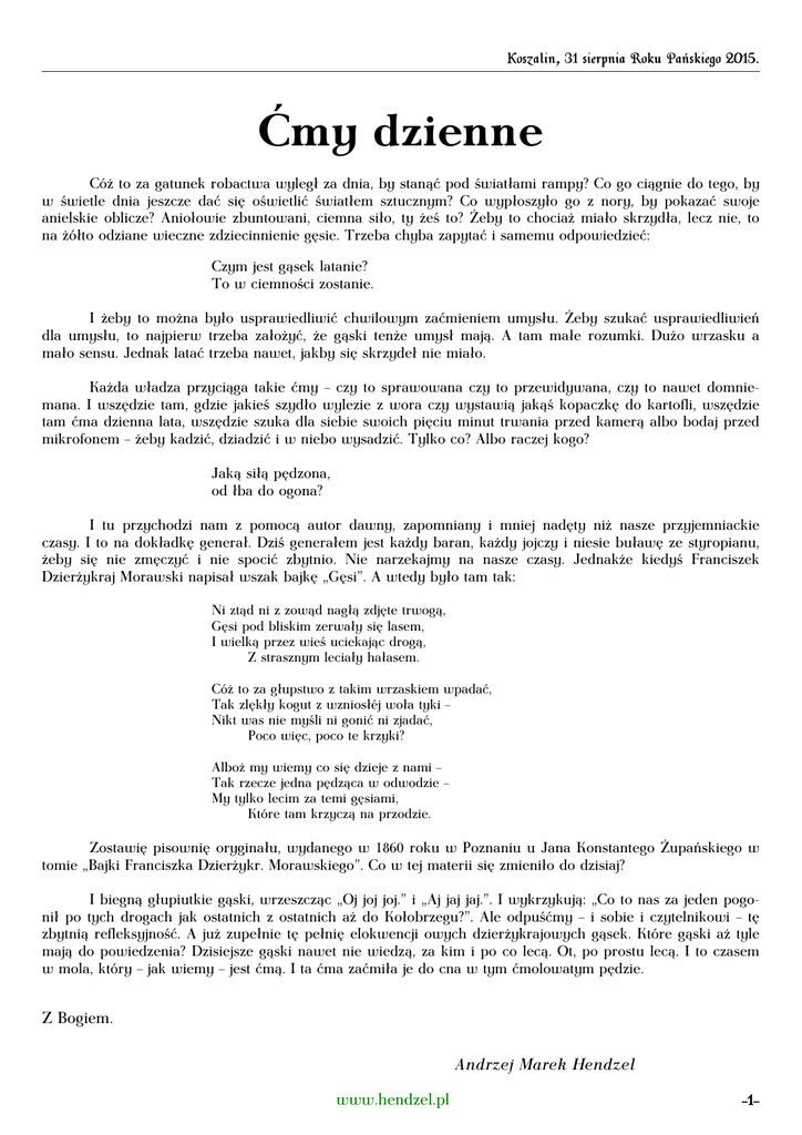 Koszalin, 31 sierpnia Roku Pańskiego 2015. Ćmy dzienne Cóż to za gatunek robactwa wyległ za dnia, by stanąć pod światłami rampy? Co go ciągnie do tego, by w świetle dnia jeszcze dać się oświetlić światłem sztucznym? Co wypłoszyło go z nory, by pokazać swoje anielskie oblicze? Aniołowie zbuntowani, ciemna siło, ty żeś to? Żeby to chociaż miało skrzydła, lecz nie, to na żółto odziane wieczne zdziecinnienie gęsie. Trzeba chyba zapytać i samemu odpowiedzieć: Czym jest gąsek latanie? To w ciemności zostanie. I żeby to można było usprawiedliwić chwilowym zaćmieniem umysłu. Żeby szukać usprawiedliwień dla umysłu, to najpierw trzeba założyć, że gąski tenże umysł mają. A tam małe rozumki. Dużo wrzasku a mało sensu. Jednak latać trzeba nawet, jakby się skrzydeł nie miało. Każda władza przyciąga takie ćmy – czy to sprawowana czy to przewidywana, czy to nawet domniemana. I wszędzie tam, gdzie jakieś szydło wylezie z wora czy wystawią jakąś kopaczkę do kartofli, wszędzie tam ćma dzienna lata, wszędzie szuka dla siebie swoich pięciu minut trwania przed kamerą albo bodaj przed mikrofonem – żeby kadzić, dziadzić i w niebo wysadzić. Tylko co? Albo raczej kogo? Jaką siłą pędzona, od łba do ogona? I tu przychodzi nam z pomocą autor dawny, zapomniany i mniej nadęty niż nasze przyjemniackie czasy. I to na dokładkę generał. Dziś generałem jest każdy baran, każdy jojczy i niesie buławę ze styropianu, żeby się nie zmęczyć i nie spocić zbytnio. Nie narzekajmy na nasze czasy. Jednakże kiedyś Franciszek Dzierżykraj Morawski napisał wszak bajkę „Gęsi”. A wtedy było tam tak: Ni ztąd ni z zowąd nagłą zdjęte trwogą, Gęsi pod bliskim zerwały się lasem, I wielką przez wieś uciekając drogą, Z strasznym leciały hałasem. Cóż to za głupstwo z takim wrzaskiem wpadać, Tak zlękły kogut z wzniosłéj woła tyki – Nikt was nie myśli ni gonić ni zjadać, Poco więc, poco te krzyki? Alboż my wiemy co się dzieje z nami – Tak rzecze jedna pędząca w odwodzie – My tylko lecim za temi gęsiami, Które tam krzyczą na przodzie. Zostawię pisownię oryginału, wydanego w 1860 roku w Poznaniu u Jana Konstantego Żupańskiego w tomie „Bajki Franciszka Dzierżykr. Morawskiego”. Co w tej materii się zmieniło do dzisiaj? I biegną głupiutkie gąski, wrzeszcząc „Oj joj joj.” i „Aj jaj jaj.”. I wykrzykują: „Co to nas za jeden pogonił po tych drogach jak ostatnich z ostatnich aż do Kołobrzegu?”. Ale odpuśćmy – i sobie i czytelnikowi – tę zbytnią refleksyjność. A już zupełnie tę pełnię elokwencji owych dzierżykrajowych gąsek. Które gąski aż tyle mają do powiedzenia? Dzisiejsze gąski nawet nie wiedzą, za kim i po co lecą. Ot, po prostu lecą. I to czasem w mola, który – jak wiemy – jest ćmą. I ta ćma zaćmiła je do cna w tym ćmolowatym pędzie. Z Bogiem. Andrzej Marek Hendzel www.hendzel.pl -1-