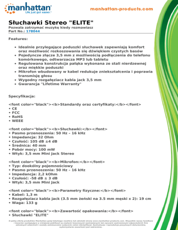 Słuchawki Stereo "ELITE" Pozwala zatrzymać muzykę kiedy rozmawiasz Part No.: 178044 Features: Idealnie przylegające poduszki słuchawek zapewniają komfort oraz możliwość rozkoszowania się dźwiękiem czystych basów Pojedyncze złącze 3,5 mm z możliwością podłączenia do telefonu komórkowego, odtwarzacza MP3 lub tabletu Regulowana konstrukcja pałąka wykonana ze stali nierdzewnej oraz miękkie poduszki Mikrofon wbudowany w kabel redukuje zniekształcenia i poprawia transmisję głosu Wygodny rozgałęziacz kabla jack 3,5 mm Gwarancja "Lifetime Warranty" Specyfikacja: <font color="black"><b>Standardy oraz certyfikaty:</b></font> • CE • FCC • RoHS • WEEE <font color="black"><b>Słuchawki:</b></font> • Pasmo przenoszenia: 50 Hz – 16 kHz • Impedancja: 32 Ohm • Czułość: 105 dB ±4 dB • Średnica: 40 mm • Pobór mocy: 100 mW • Wtyk: 3,5 mm Mini Jack Stereo <font color="black"><b>Mikrofon:</b></font> • Typ: dookólny pojemnościowy • Pasmo przenoszenia: 50 Hz – 16 kHz • Impedancja: 2,2 kOhm • Czułość: -58 dB ± 3 dB • Wtyk: 3,5 mm Mini Jack <font color="black"><b>Parametry fizyczne:</b></font> • Kabel: 1,3 m • Rozgałęziacz kabla jack (3.5 mm żeński na 3.5 mm męski x 2): 19 cm • Waga: 133 g <font color="black"><b>Zawartość opakowania:</b></font> • Słuchawki "ELITE" O pełną ofertę produktów Manhattan pytaj lokalnego resellera lub odwiedź stronę www.manhattan-products.com. Wszystkie nazwy handlowe i towarów występujące w niniejszej publikacji są znakami towarowymi zastrzeżonymi lub nazwami zastrzeżonymi odpowiednich firm odnośnych właścicieli i zostały zamieszczone wyłącznie celem identyfikacji. Dystrybucja i reprodukcja powyższych dokumentów, wykorzystanie zawartości jest zabronione. • Rozgałęziacz kabla • Instrukcja użytkownika O pełną ofertę produktów Manhattan pytaj lokalnego resellera lub odwiedź stronę www.manhattan-products.com. Wszystkie nazwy handlowe i towarów występujące w niniejszej publikacji są znakami towarowymi zastrzeżonymi lub nazwami zastrzeżonymi odpowiednich firm odnośnych właścicieli i zostały zamieszczone wyłącznie celem identyfikacji. Dystrybucja i reprodukcja powyższych dokumentów, wykorzystanie zawartości jest zabronione. O pełną ofertę produktów Manhattan pytaj lokalnego resellera lub odwiedź stronę www.manhattan-products.com. Wszystkie nazwy handlowe i towarów występujące w niniejszej publikacji są znakami towarowymi zastrzeżonymi lub nazwami zastrzeżonymi odpowiednich firm odnośnych właścicieli i zostały zamieszczone wyłącznie celem identyfikacji. Dystrybucja i reprodukcja powyższych dokumentów, wykorzystanie zawartości jest zabronione.