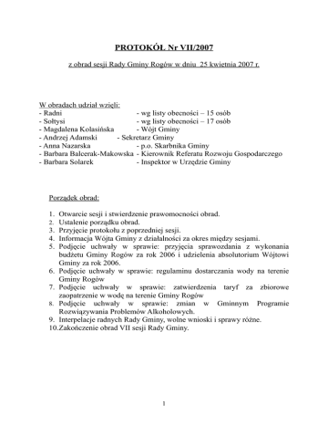 PROTOKÓŁ Nr VII/2007 z obrad sesji Rady Gminy Rogów w dniu 25 kwietnia 2007 r. W obradach udział wzięli: - Radni - wg listy obecności – 15 osób - Sołtysi - wg listy obecności – 17 osób - Magdalena Kolasińska - Wójt Gminy - Andrzej Adamski - Sekretarz Gminy - Anna Nazarska - p.o. Skarbnika Gminy - Barbara Balcerak-Makowska - Kierownik Referatu Rozwoju Gospodarczego - Barbara Solarek - Inspektor w Urzędzie Gminy Porządek obrad: 1. Otwarcie sesji i stwierdzenie prawomocności obrad. 2. Ustalenie porządku obrad. 3. Przyjęcie protokołu z poprzedniej sesji. 4. Informacja Wójta Gminy z działalności za okres między sesjami. 5. Podjęcie uchwały w sprawie: przyjęcia sprawozdania z wykonania budżetu Gminy Rogów za rok 2006 i udzielenia absolutorium Wójtowi Gminy za rok 2006. 6. Podjęcie uchwały w sprawie: regulaminu dostarczania wody na terenie Gminy Rogów 7. Podjęcie uchwały w sprawie: zatwierdzenia taryf za zbiorowe zaopatrzenie w wodę na terenie Gminy Rogów 8. Podjęcie uchwały w sprawie: zmian w Gminnym Programie Rozwiązywania Problemów Alkoholowych. 9. Interpelacje radnych Rady Gminy, wolne wnioski i sprawy różne. 10.Zakończenie obrad VII sesji Rady Gminy. 1 Ad 1. Otwarcia sesji dokonał Przewodniczący Rady Gminy – Pan Wojciech Dziąg. Powitał przybyłych na obrady i stwierdził quorum. Ad 2. Przewodniczący poinformował, że wszyscy radni otrzymali proponowany porządek obrad, a następnie zapytał, czy radni mają jakieś propozycje w sprawie porządku obrad. Nikt nie zgłosił żadnej propozycji. Następnie zaproponował, aby po punkcie 8 dodać punkty 8a w brzmieniu: Podjęcie uchwały w sprawie: zmian w budżecie Gminy Rogów na rok 2007, 8b w brzmieniu: Podjęcie uchwały w sprawie: zmiany uchwały Nr 19/VI/2007 Rady Gminy Rogów z dnia 21 marca 2007 roku w sprawie uchwalenia budżetu Gminy Rogów na rok 2007, 8c w brzmieniu: Podjęcie uchwały w sprawie: powołania Skarbnika Gminy Rogów, 8d w brzmieniu: Podjęcie uchwały w sprawie: wyrażenia zgody na sprzedaż nieruchomości położonej w Józefowie w drodze bezprzetargowej, 8e w brzmieniu: Podjęcie uchwały w sprawie: przystąpienia do opracowania Wieloletniego Planu Inwestycyjnego Gminy Rogów na lata 2007 – 2013. Głos zabrała Pani Eliasiewicz i zapytała, dlaczego radni materiały na sesję otrzymują tuż przed sesją, dodała, że następuje to za późno. Pan Przewodniczący odpowiedział, że materiały zostały wysłane razem z zawiadomieniami o sesji, natomiast proponowane zmiany wynikły w ostatniej chwili. Następnie Pan Przewodniczący poddał propozycję porządku obrad pod głosowanie. Za jego przyjęciem głosowało 14 radnych, jedna osoba była przeciwko, nikt nie wstrzymał się od głosu. Ostatecznie, więc Rada obradowała zgodnie z poniższym porządkiem obrad: 1. 2. 3. 4. 5. Otwarcie sesji i stwierdzenie prawomocności obrad. Ustalenie porządku obrad. Przyjęcie protokołu z poprzedniej sesji. Informacja Wójta Gminy z działalności za okres między sesjami. Podjęcie uchwały w sprawie: przyjęcia sprawozdania z wykonania budżetu Gminy Rogów za rok 2006 i udzielenia absolutorium Wójtowi Gminy za rok 2006. 6. Podjęcie uchwały w sprawie: regulaminu dostarczania wody na terenie Gminy Rogów 7. Podjęcie uchwały w sprawie: zatwierdzenia taryf za zbiorowe zaopatrzenie w wodę na terenie Gminy Rogów 8. Podjęcie uchwały w sprawie: zmian w Gminnym Programie Rozwiązywania Problemów Alkoholowych. 8a.Podjęcie uchwały w sprawie: zmian w budżecie Gminy Rogów na rok 2007. 8b. Podjęcie uchwały w sprawie: zmiany uchwały Nr 19/VI/2007 Rady Gminy Rogów z dnia 21 marca 2007 roku w sprawie uchwalenia budżetu Gminy Rogów na rok 2007. 2 8c. Podjęcie uchwały w sprawie: powołania Skarbnika Gminy Rogów. 8d. Podjęcie uchwały w sprawie: wyrażenia zgody na sprzedaż nieruchomości położonej w Józefowie w drodze bezprzetargowej. 8e. Podjęcie uchwały w sprawie: przystąpienia do opracowania Wieloletniego Planu Inwestycyjnego Gminy Rogów na lata 2007 – 2013. 9. Interpelacje radnych Rady Gminy, wolne wnioski i sprawy różne. 10.Zakończenie obrad VII sesji Rady Gminy. Ad 4. Głos zabrała Pani Wójt, która powiedziała, że poprzednia sesja odbyła się 21 marca i w tym czasie miało miejsce kilka ważnych wydarzeń. 22 marca odbyło się zebranie wiejskie w Zacywilkach, tego samego dnia miało miejsce spotkanie w Zespole Szkół w sprawie bezpiecznej drogi do szkoły. 27 marca odbyło się spotkanie z rodzicami, przedstawicielami władz kolejowych i inwestorów, na którym znów omawiano ten problem. Wynikiem spotkania jest ustalenie, że dzieci ze wschodniej strony Rogowa są dowożone do szkoły zgodnie z planem opracowanym przez dyrektora Zespołu Szkół. Zgodnie z zawartym porozumieniem dowóz finansuje Lider Konsorcjum. Porozumienie obowiązuje do końca roku. 31 marca Starosta Brzeziński zorganizował spotkanie przy stole wielkanocnym, który przygotowały kobiety zrzeszone w kołach gospodyń wiejskich z terenu Gminy Rogów. 12 kwietnia odbył się przetarg na wykonanie dokumentacji kosztorysowej stacji wodociągowej w Przyłęku Dużym. Został on unieważniony, ponieważ przewidziane środki nie pokrywały wysokości najniższej złożonej oferty. Gmina złożyła wniosek do Urzędu Marszałkowskiego o dofinansowanie remontu dróg dojazdowych do pól. Nie ma jeszcze zawartego porozumienia w tej sprawie a termin realizacji upływa z końcem sierpnia. To zadanie również wymaga zwiększenia środków. Kilka obrębów Gminy Rogów zostało zakwalifikowanych do ONW. Informacja ta dotarła bardzo późno, ale nawet te osoby, które złożyły wniosek o płatności, mogą go uzupełnić. 12 kwietnia Starosta zorganizował konferencję na temat planów rozwoju Powiatu Brzezińskiego na lata 2007 – 2013. Nie wszystkie wydziały starostwa dokonały prezentacji. Pozostałe miały to zrobić 20 kwietnia. Do gmin dotarła ankieta z powiatu, skierow