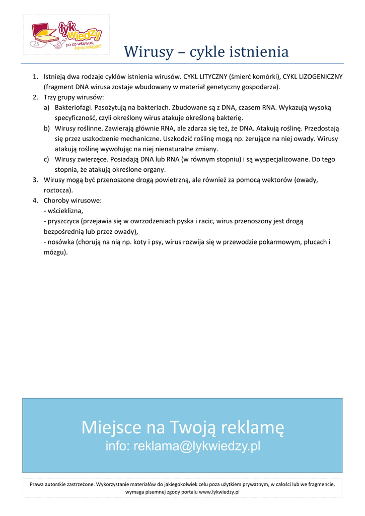 Wirusy – cykle istnienia 1. Istnieją dwa rodzaje cyklów istnienia wirusów. CYKL LITYCZNY (śmierd komórki), CYKL LIZOGENICZNY (fragment DNA wirusa zostaje wbudowany w materiał genetyczny gospodarza). 2. Trzy grupy wirusów: a) Bakteriofagi. Pasożytują na bakteriach. Zbudowane są z DNA, czasem RNA. Wykazują wysoką specyficznośd, czyli określony wirus atakuje określoną bakterię. b) Wirusy roślinne. Zawierają głównie RNA, ale zdarza się też, że DNA. Atakują roślinę. Przedostają się przez uszkodzenie mechaniczne. Uszkodzid roślinę mogą np. żerujące na niej owady. Wirusy atakują roślinę wywołując na niej nienaturalne zmiany. c) Wirusy zwierzęce. Posiadają DNA lub RNA (w równym stopniu) i są wyspecjalizowane. Do tego stopnia, że atakują określone organy. 3. Wirusy mogą byd przenoszone drogą powietrzną, ale również za pomocą wektorów (owady, roztocza). 4. Choroby wirusowe: - wścieklizna, - pryszczyca (przejawia się w owrzodzeniach pyska i racic, wirus przenoszony jest drogą bezpośrednią lub przez owady), - nosówka (chorują na nią np. koty i psy, wirus rozwija się w przewodzie pokarmowym, płucach i mózgu). Prawa autorskie zastrzeżone. Wykorzystanie materiałów do jakiegokolwiek celu poza użytkiem prywatnym, w całości lub we fragmencie, wymaga pisemnej zgody portalu www.lykwiedzy.pl