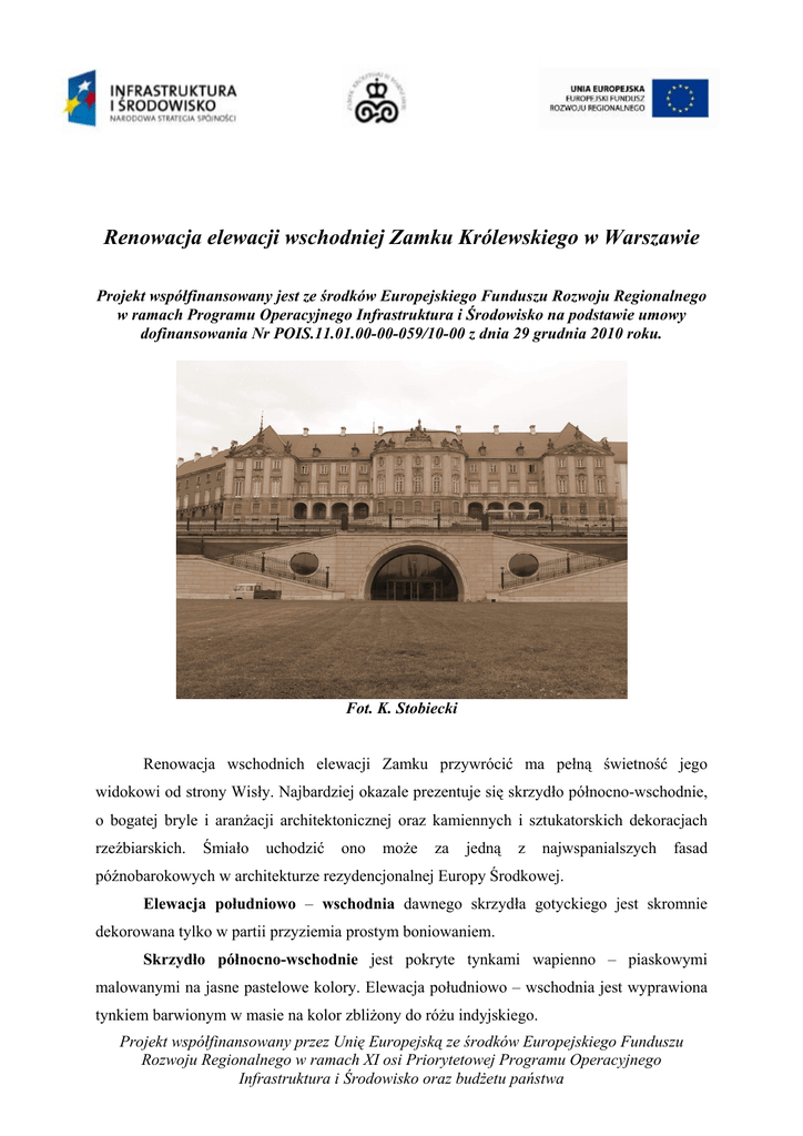Renowacja elewacji wschodniej Zamku Królewskiego w Warszawie Projekt współfinansowany jest ze środków Europejskiego Funduszu Rozwoju Regionalnego w ramach Programu Operacyjnego Infrastruktura i Środowisko na podstawie umowy dofinansowania Nr POIS.11.01.00-00-059/10-00 z dnia 29 grudnia 2010 roku. Fot. K. Stobiecki Renowacja wschodnich elewacji Zamku przywrócić ma pełną świetność jego widokowi od strony Wisły. Najbardziej okazale prezentuje się skrzydło północno-wschodnie, o bogatej bryle i aranżacji architektonicznej oraz kamiennych i sztukatorskich dekoracjach rzeźbiarskich. Śmiało uchodzić ono może za jedną z najwspanialszych fasad późnobarokowych w architekturze rezydencjonalnej Europy Środkowej. Elewacja południowo – wschodnia dawnego skrzydła gotyckiego jest skromnie dekorowana tylko w partii przyziemia prostym boniowaniem. Skrzydło północno-wschodnie jest pokryte tynkami wapienno – piaskowymi malowanymi na jasne pastelowe kolory. Elewacja południowo – wschodnia jest wyprawiona tynkiem barwionym w masie na kolor zbliżony do różu indyjskiego. Projekt współfinansowany przez Unię Europejską ze środków Europejskiego Funduszu Rozwoju Regionalnego w ramach XI osi Priorytetowej Programu Operacyjnego Infrastruktura i Środowisko oraz budżetu państwa Jedyny oryginalny fragment murów Zamku Królewskiego został wyraźnie odznaczony bruzdą w tynku ryzalitu południowego korpusu głównego. Dawne dokumentacje konserwatorskie są nieprecyzyjne. Nieznany jest dokładny skład powłok tynkarskich i malarskich, którymi pokryto elewacje. Nie były dobrej jakości, gdyż w wielu miejscach złuszczyły się lub odspoiły od podłoża. Fot. K. Stobiecki Powierzchnia wszystkich elementów elewacji jest silnie zabrudzona. Zaprawy tynkarskie i narzutowe są spękane. Silnie zanieczyszczone są powierzchnie rzeźb kamiennych. Na powierzchni kamienia i narzutu rozwinęły się kolonie mikroorganizmów. Rozległość destrukcji spowodowanej skutkami działania wody i czynników mikrobiologicznych spowodowane jest złym stanem obróbek blacharskich oraz całkowitym brakiem zabezpieczenia hydrofobowego. Wykonania prac renowacyjnych wymagają także elementy żelazne. Skorodowana jest balustrada balkonu ciągnącego się wzdłuż elewacji południowo – wschodniej oraz odciągi kamiennych kompozycji rzeźbiarskich wieńczących ryzality korpusu głównego. Projekt współfinansowany przez Unię Europejską ze środków Europejskiego Funduszu Rozwoju Regionalnego w ramach XI osi Priorytetowej Programu Operacyjnego Infrastruktura i Środowisko oraz budżetu państwa Fot. K. Stobiecki Renowacja elewacji Zamku od strony Wisły polegać będzie na wykonaniu izolacji, osuszaniu murów, konserwacji elementów kamieniarskich, narzutowych i metalowych, renowacji balkonów oraz tynków, rynien, zamontowaniu ochrony przed gołębiami, wprowadzeniu elementów przyszłego systemu oświetleniowego, instalacji systemu bezpieczeństwa. Zakres prac został podzielony na 4 części: - naprawa i renowacja ścian zewnętrznych, - obróbki blacharskie, - roboty malarskie, - konserwacja kamienia. Projekt współfinansowany przez Unię Europejską ze środków Europejskiego Funduszu Rozwoju Regionalnego w ramach XI osi Priorytetowej Programu Operacyjnego Infrastruktura i Środowisko oraz budżetu państwa Fot. K. Stobiecki W skład tych robót wchodzą: - osuszenie dezynfekcja i izolacja zawilgoconych fragmentów, - oczyszczenie nawarstwień całej powierzchni elewacji, - usunięcie odspojonych i zdezintegrowanych tynków, - reperacja spękanych tynków, - konserwacja i wzmocnienie struktur tynków, - konserwacja kamiennych pełnowymiarowych rzeźb i detalu architektonicznego, - konserwacja detalu architektonicznego wykonanego w narzucie i tynkach, - malowanie całości elewacji technikami imitującymi historyczne, - pełna wymiana obróbek malarskich, - zamontowanie systemu antyptak, - zamontowanie systemu bezpieczeństwa, - zamontowanie elementów systemu oświetleniowego. Realizacja założonego projektu przyczyni się do eliminacji: - złego stanu technicznego budynków wschodniego skrzydła Zamku, - niezadowalającej estetyki obiektu. Projekt współfinansowany przez Unię Europejską ze środków Europejskiego Funduszu Rozwoju Regionalnego w ramach XI osi Priorytetowej Programu Operacyjnego Infrastruktura i Środowisko oraz budżetu państwa W ramach projektu zostanie poprawiony stan infrastruktury obiektu, podniesie się efektywność wykorzystania istniejącej infrastruktury, obniżą się koszty związane z bieżącymi naprawami. Renowacja radykalnie poprawi estetykę, co wpłynie na atrakcyjność Zamku Królewskiego. Rzeczową realizację projektu zaplanowano na lata 2011 - 2013 r. Wartość całkowita projektu wynosi 15 020 993,22 PLN. Wysokość dofinansowania ze środków EFRR w ramach POIiŚ wynosi 10 142 721,62 PLN∗ Ministerstwo Kultury i Dziedzictwa Narodowego www.mkidn.gov.pl Władza Wdrażająca Programy Europejskie www.wwpe.gov.pl Ministerstwo Rozwoju Regionalnego www.mrr.gov.pl Portal Unii Europejskiej www.europa.eu.int Portal funduszy strukturalnych Unii Europejskiej www.funduszestrukturalne.gov.pl Program Operacyjny Infrastruktura i Środowisko www.poiis.mkidn.gov.pl ∗Zgodnie z podpisanym aneksem nr 2 z 22 kwietnia 2013 roku, całkowity koszt realizacji projektu przewidziany został na 6 366 629,01 zł, w tym dofinansowanie – na 4 706 636,30 zł, a środki własne – 1 659 992,71 zł Projekt współfinansowany przez Unię Europejską ze środków Europejskiego Funduszu Rozwoju Regionalnego w ramach XI osi Priorytetowej Programu Operacyjnego Infrastruktura i Środowisko oraz budżetu państwa