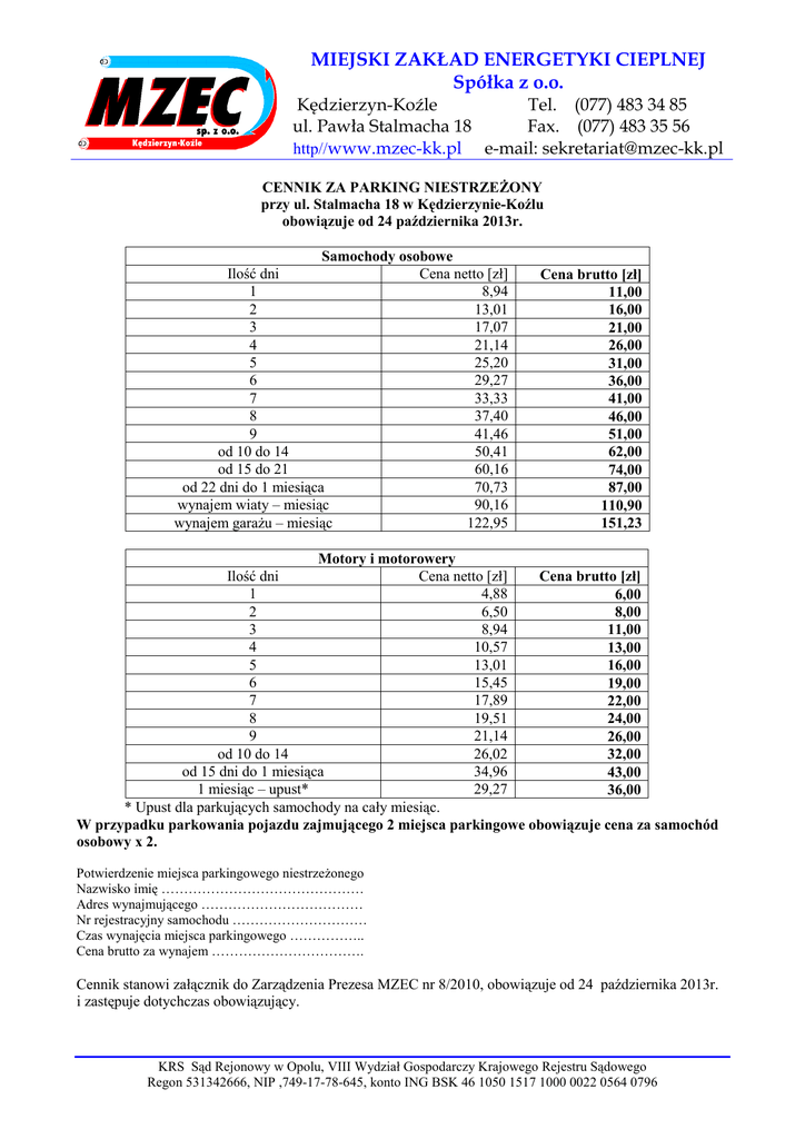 MIEJSKI ZAKŁAD ENERGETYKI CIEPLNEJ Spółka z o.o. Kędzierzyn-Koźle Tel. (077) 483 34 85 Fax. (077) 483 35 56 ul. Pawła Stalmacha 18 http//www.mzec-kk.pl e-mail: [email protected] CENNIK ZA PARKING NIESTRZEŻONY przy ul. Stalmacha 18 w Kędzierzynie-Koźlu obowiązuje od 24 października 2013r. Samochody osobowe Ilość dni Cena netto [zł] 1 8,94 2 13,01 3 17,07 4 21,14 5 25,20 6 29,27 7 33,33 8 37,40 9 41,46 od 10 do 14 50,41 od 15 do 21 60,16 od 22 dni do 1 miesiąca 70,73 wynajem wiaty – miesiąc 90,16 wynajem garażu – miesiąc 122,95 Cena brutto [zł] 11,00 16,00 21,00 26,00 31,00 36,00 41,00 46,00 51,00 62,00 74,00 87,00 110,90 151,23 Motory i motorowery Ilość dni Cena netto [zł] Cena brutto [zł] 1 4,88 6,00 2 6,50 8,00 3 8,94 11,00 4 10,57 13,00 5 13,01 16,00 6 15,45 19,00 7 17,89 22,00 8 19,51 24,00 9 21,14 26,00 od 10 do 14 26,02 32,00 od 15 dni do 1 miesiąca 34,96 43,00 1 miesiąc – upust* 29,27 36,00 * Upust dla parkujących samochody na cały miesiąc. W przypadku parkowania pojazdu zajmującego 2 miejsca parkingowe obowiązuje cena za samochód osobowy x 2. Potwierdzenie miejsca parkingowego niestrzeżonego Nazwisko imię ……………………………………… Adres wynajmującego ……………………………… Nr rejestracyjny samochodu ………………………… Czas wynajęcia miejsca parkingowego …………….. Cena brutto za wynajem ……………………………. Cennik stanowi załącznik do Zarządzenia Prezesa MZEC nr 8/2010, obowiązuje od 24 października 2013r. i zastępuje dotychczas obowiązujący. KRS Sąd Rejonowy w Opolu, VIII Wydział Gospodarczy Krajowego Rejestru Sądowego Regon 531342666, NIP ,749-17-78-645, konto ING BSK 46 1050 1517 1000 0022 0564 0796