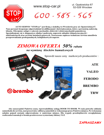 Awww.stop-car.pl ul. Opatowicka 67 52-028 Wroc³aw AUTO SERWIS "STOPcar" jest firm¹ z siedzib¹ we Wroc³awiu przy ul. Opatowickiej 67. Nasz personel dysponuje odpowiednimi kwalifikacjami i doœwiadczeniem, które z pewnoœci¹ zadowol¹ klienta. Oferujemy us³ugi w zakresie mechaniki, elektryki i elektromechaniki pojazdowej. Specjalizujemy siê w diagnostyce silnika i podwozia, naprawie uk³adów klimatyzacyjnych i elektronicznych oraz serwisie instalacji gazowych. Nowoczesne zaplecze techniczne serwisu umo¿liwia przeprowadzanie profesjonalnych, kompleksowych napraw. ZIMOWA OFERTA 50% rabatu na wymianê klocków hamulcowych SprawdŸ nasze ceny markowych producentów : ATE VALEO FERODO BREMBO TRW Aby zaoszczêdziæ Pañstwu czasu, wprowadziliœmy us³ugê DOOR TO DOOR. W razie potrzeby oddania samochodu do serwisu, nasi pracownicy odbior¹ samochód ze wskazanego przez Pañstwa miejsca. Po wykonanej us³udze pojazd zostanie odprowadzony w umówione miejsce. Dla wygody przedsiêbiorców uwzglêdniamy rozliczenia transakcji w formie przelewu oraz wystawiamy faktury VAT. ZAPRASZAMY