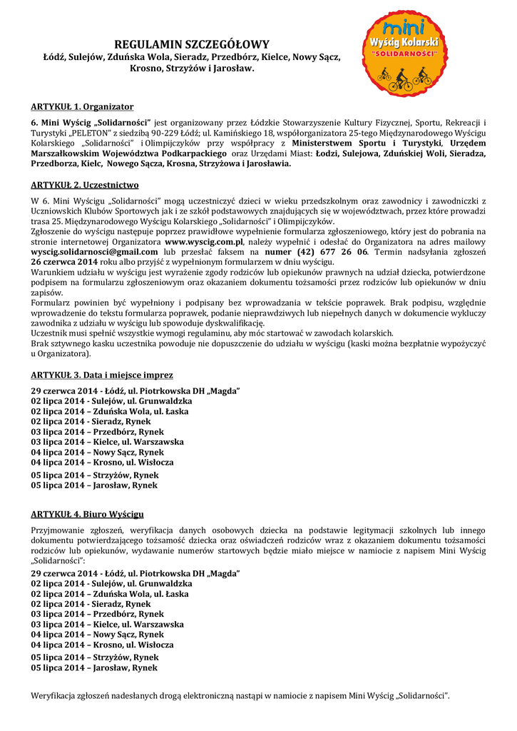 REGULAMIN SZCZEGÓŁOWY Łódź, Sulejów, Zduńska Wola, Sieradz, Przedbórz, Kielce, Nowy Sącz, Krosno, Strzyżów i Jarosław. ARTYKUŁ 1. Organizator 6. Mini Wyścig „Solidarności” jest organizowany przez Łódzkie Stowarzyszenie Kultury Fizycznej, Sportu, Rekreacji i Turystyki „PELETON” z siedzibą 90-229 Łódź; ul. Kamińskiego 18, współorganizatora 25-tego Międzynarodowego Wyścigu Kolarskiego „Solidarności” i Olimpijczyków przy współpracy z Ministerstwem Sportu i Turystyki, Urzędem Marszałkowskim Województwa Podkarpackiego oraz Urzędami Miast: Łodzi, Sulejowa, Zduńskiej Woli, Sieradza, Przedborza, Kielc, Nowego Sącza, Krosna, Strzyżowa i Jarosławia. ARTYKUŁ 2. Uczestnictwo W 6. Mini Wyścigu „Solidarności” mogą uczestniczyć dzieci w wieku przedszkolnym oraz zawodnicy i zawodniczki z Uczniowskich Klubów Sportowych jak i ze szkół podstawowych znajdujących się w województwach, przez które prowadzi trasa 25. Międzynarodowego Wyścigu Kolarskiego „Solidarności” i Olimpijczyków. Zgłoszenie do wyścigu następuje poprzez prawidłowe wypełnienie formularza zgłoszeniowego, który jest do pobrania na stronie internetowej Organizatora www.wyscig.com.pl, należy wypełnić i odesłać do Organizatora na adres mailowy [email protected] lub przesłać faksem na numer (42) 677 26 06. Termin nadsyłania zgłoszeń 26 czerwca 2014 roku albo przyjść z wypełnionym formularzem w dniu wyścigu. Warunkiem udziału w wyścigu jest wyrażenie zgody rodziców lub opiekunów prawnych na udział dziecka, potwierdzone podpisem na formularzu zgłoszeniowym oraz okazaniem dokumentu tożsamości przez rodziców lub opiekunów w dniu zapisów. Formularz powinien być wypełniony i podpisany bez wprowadzania w tekście poprawek. Brak podpisu, względnie wprowadzenie do tekstu formularza poprawek, podanie nieprawdziwych lub niepełnych danych w dokumencie wykluczy zawodnika z udziału w wyścigu lub spowoduje dyskwalifikację. Uczestnik musi spełnić wszystkie wymogi regulaminu, aby móc startować w zawodach kolarskich. Brak sztywnego kasku uczestnika powoduje nie dopuszczenie do udziału w wyścigu (kaski można bezpłatnie wypożyczyć u Organizatora). ARTYKUŁ 3. Data i miejsce imprez 29 czerwca 2014 - Łódź, ul. Piotrkowska DH „Magda” 02 lipca 2014 - Sulejów, ul. Grunwaldzka 02 lipca 2014 – Zduńska Wola, ul. Łaska 02 lipca 2014 - Sieradz, Rynek 03 lipca 2014 – Przedbórz, Rynek 03 lipca 2014 – Kielce, ul. Warszawska 04 lipca 2014 – Nowy Sącz, Rynek 04 lipca 2014 – Krosno, ul. Wisłocza 05 lipca 2014 – Strzyżów, Rynek 05 lipca 2014 – Jarosław, Rynek ARTYKUŁ 4. Biuro Wyścigu Przyjmowanie zgłoszeń, weryfikacja danych osobowych dziecka na podstawie legitymacji szkolnych lub innego dokumentu potwierdzającego tożsamość dziecka oraz oświadczeń rodziców wraz z okazaniem dokumentu tożsamości rodziców lub opiekunów, wydawanie numerów startowych będzie miało miejsce w namiocie z napisem Mini Wyścig „Solidarności”: 29 czerwca 2014 - Łódź, ul. Piotrkowska DH „Magda” 02 lipca 2014 - Sulejów, ul. Grunwaldzka 02 lipca 2014 – Zduńska Wola, ul. Łaska 02 lipca 2014 - Sieradz, Rynek 03 lipca 2014 – Przedbórz, Rynek 03 lipca 2014 – Kielce, ul. Warszawska 04 lipca 2014 – Nowy Sącz, Rynek 04 lipca 2014 – Krosno, ul. Wisłocza 05 lipca 2014 – Strzyżów, Rynek 05 lipca 2014 – Jarosław, Rynek Weryfikacja zgłoszeń nadesłanych drogą elektroniczną nastąpi w namiocie z napisem Mini Wyścig „Solidarności”. ARTYKUŁ 5. Zasady rozgrywania wyścigów Wyścigi i ocena ich wyników będzie dokonana według Przepisów Sportowych Polskiego Związku Kolarskiego. Wyścigi będą rozgrywane ze startu wspólnego. W zawodach kolarskich prowadzone będą cztery klasyfikacje indywidualne. Dodatkowo w klasyfikacji indywidualnej kategorii A, B, C, D będą prowadzone oddzielne klasyfikacje dla dziewcząt i chłopców. Zwycięzcą indywidualnym danego wyścigu będzie zawodnik, który minie metę jako pierwszy. Uczestnicy wyścigu są zobowiązani do przestrzegania zasad określonych w regulaminie zawodów kolarskich. Każdy z uczestników jest zobowiązany podporządkować się poleceniom Komisji Sędziowskiej, Funkcjonariuszy Policji oraz Organizatora. ARTYKUŁ 6. Kategorie wiekowe Wyścigi będą rozegrane w następujących kategoriach wiekowych: 1) kategoria A (Chochliki) (do 5 lat) (do 2009) 2) kategoria B (Krasnale) (6 – 8 lat) (2008 – 2006) 3) kategoria C (Skrzaty) (9 – 10 lat) (2005 – 2004) 4) kategoria D (Elfy) (11 – 12 lat) (2003 – 2002) ARTYKUŁ 7. Dystanse wyścigów 1) kat. A (Chochliki) dystans ok. 150 m 2) kat. B (Krasnale) dystans ok. 400 m 3) kat. C (Skrzaty) dystans ok. 800 m 4) kat. D (Elfy) dystans od 1200 m Dystanse wyścigów uzależnione są od możliwości w danych miastach. ARTYKUŁ 8. Program wyścigów Zawody zostaną rozegrane wg następującego programu: 29 czerwca Łódź, ul. Piotrkowska DH „Magda” – 11.30 – 13.00 zapisy i przyjmowanie zgłoszeń zawodników w Namiocie Mini Wyścig „Solidarności” - 13.10 start pierwszej grupy wiekowej, kolejne grupy startują według kolejności kategorii. - 14.30 rozpoczęcie ceremonii dekoracji. 02 lipca 2014 - Sulejów, ul. Grunwaldzka - 9.50-11.10 zapisy i przyjmowanie zgłoszeń zawodników w Namiocie Mini Wyścig „Solidarności” - 11.20 start pierwszej grupy wiekowej, kolejne grupy startują według kolejności kategorii. - 12.50 rozpoczęcie ceremonii dekoracji. 02 lipca 2014 – Zduńska Wola, ul. Łaska - 14.00-15.00 zapisy i przyjmowanie zgłoszeń zawodników w Namiocie Mini Wyścig „Solidarności” - 15.10 start pierwszej grupy wiekowej, kolejne grupy startują według kolejności kategorii. - 16.30 rozpoczęcie ceremonii dekoracji 02 lipca 2014 - Sieradz, Rynek - 17.00-18.00 zapisy i przyjmowanie zgłoszeń zawodników w Namiocie Mini Wyścig „Solidarności” - 18.10 start pierwszej grupy wiekowe