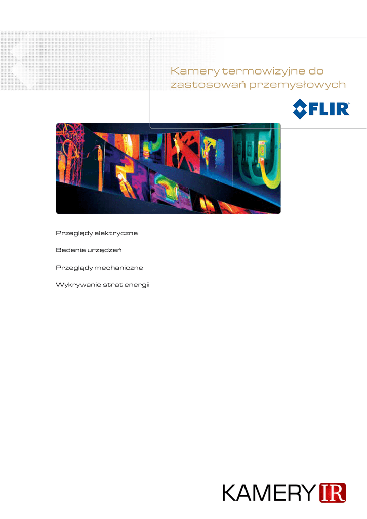 Kamery termowizyjne do zastosowań przemysłowych Przeglądy elektryczne Badania urządzeń Przeglądy mechaniczne Wykrywanie strat energii Kamery termowizyjne do zastosowań przemysłowych 2 Zobacz www.kameryir.com.pl FLIR systems: światowy lider w kamerach termowizyjnych FLIR Systems jest światowym liderem w projektowaniu, wytwarzaniu i sprzedaży kamer termowizyjnych do szerokich zastosowań w sektorach: komercyjnym, przemysłowym i bezpieczeństwa. W systemach termowizyjnych produkcji FLIR Systems wykorzystywana jest najnowocześniejsza technologia zobrazowania cieplnego, wykrywająca promieniowanie podczerwone, czyli ciepło. W oparciu o wykryte różnice temperatur kamery termowizyjne tworzą wyraźny obraz. Skomplikowane algorytmy umożliwiają odczytanie z tych obrazów poprawnych wartości temperatury. Sami projektujemy i wytwarzamy wszystkie najważniejsze podzespoły naszych produktów, włączywszy detektory, elektronikę i specjalne obiektywy. Nowe rynki i organizacja W ostatnich latach poważnie wzrosło zainteresowanie termowizją na wielu rynkach. Aby sprostać zwiększonemu zainteresowaniu, FLIR Systems znacznie rozszerzył swą organizację. Dziś, zatrudniamy ponad 3200 specjalistów od podczerwieni, którzy realizują roczny obrót wartości ponad 1 miliarda dolarów. Oznacza to, że FLIR Systems jest największym producentem komercyjnych kamer termowizyjnych na świecie. Możliwości wytwórcze FLIR Systems posiada obecnie sześć zakładów produkcyjnych: trzy w USA (w Portland, w Bostonie i w Santa Barbara, w stanie Kalifornia) jeden w Sztokholmie, w Szwecji, jeden w Estonii i jeden w Paryżu, we Francji. Termowizja: więcej, niż produkcja kamer W dziedzinie termowizji w podczerwieni nie ograniczamy się do wytwarzania kamer. FLIR Systems nie tylko oferuje najlepsze kamery, lecz zapewnia także najlepsze oprogramowanie, serwis i szkolenia, zaspokajające Twoje potrzeby w dziedzinie termografii. FLIR Systems, Sztokholm FLIR Systems, Portland FLIR Systems, Boston FLIR Systems, Santa Barbara 3 PODCZERWIEŃ: nie tylko to, co widać gołym okiem Podczerwień – część widma elektromagnetycznego Nasze oczy są detektorami przeznaczonymi do odbioru światła widzialnego (czyli promieniowania widzialnego). Istnieją jednak inne rodzaje światła (promieniowania), których nie widzimy. Ludzkie oko umie dostrzec jedynie niewielką część widma elektromagnetycznego. Na jednym krańcu pasma pozostaje niewidzialne dla nas światło ultrafioletowe, zaś na drugim końcu, nasze oczy nie widzą światła podczerwonego. Promieniowanie podczerwone leży między widzialną a mikrofalową częścią widma elektromagnetycznego. Podstawowym źródłem promieniowania podczerwonego jest ciepło. Każde ciało mające temperaturę powyżej bezwzględnego zera (-273,15 stopni Celsjusza lub 0 stopni Kelvina) emituje promieniowanie w zakresie podczerwieni. Nawet ciała, które wydają się nam bardzo zimne, emitują promieniowanie cieplne. Nieustannie stykamy się z promieniowaniem podczerwonym. By je zarejestrować i zamienić na obraz widzialny potrzebna jest kamera termowizyjna. Taka kamera musi tworzyć wyraźne obrazy w podczerwieni, błyskawicznie mierzyć niewielkie różnice temperatur oraz przetwarzać te obrazy na standardowy format elektroniczny, tak by można było poddać je dalszej obróbce. Z promieniowaniem podczerwonym stykamy się nieustannie. Ciepło, jakie czujemy od słońca, ognia, czy od kaloryfera to wszystko podczerwień. Choć nasze oczy go nie widzą, nerwy skóry odczuwają je jako ciepło. Im cieplejszy obiekt, tym więcej promieniowania podczerwonego emituje. Mikrofale Światło widzialne Promie Promienio niowanie wanie rent gamma genowskie Ultra fiolet Fale radiowe Podczerwień UHF Światło widzialne VHF Podczerwień Fale krótkie 2 Kamera termowizyjna Energia podczerwieni (A) pochodząca od obiektu jest skupiana przez elementy optyczne (B) na detektorze podczerwieni (C). Detektor przesyła informacje do elektroniki czujnika (D) w celu przetwarzania obrazu. Elektronika przekłada dane pochodzące z detektora na obraz (E), który można oglądać w wizjerze lub na standardowym monitorze wideo bądź ekranie LCD. Fale długie 5 8 12 mikrometrów Termografia podczerwieni to sztuka przekształcania obrazu termowizyjnego na obraz pomiarowy, pozwalający na odczyt wartości temperatury z obrazu. Aby to osiągnąć, w kamerze termowizyjnej stosowane są złożone algorytmy. E A B C 4 Zobacz www.kameryir.com.pl E D Dlaczego używać kamer termowizyjnych? Dlaczego powinieneś wybrać kamerę termowizyjną firmy FLIR? Istnieją inne technologie, umożliwiające bezkontaktowy pomiar temperatury. Na przykład termometry na podczerwień (pirometry). Termometry na podczerwień a kamery termowizyjne Termometry na podczerwień (pirometry) są niezawodne i bardzo przydatne do punktowego odczytu temperatury, lecz przy skanowaniu dużych obszarów lub obiektów łatwo jest pominąć kluczowe elementy, które mogą być bliskie uszkodzenia i wymagać naprawy. Kamera termowizyjna FLIR może jednocześnie skanować całe silniki, podzespoły lub panele. Nigdy nie pominie przegrzanych miejsc, choćby nawet najmniejszych. Używaj tysięcy termometrów na podczerwień na raz Termometrem na podczerwień możesz mierzyć temperaturę w jednym punkcie. Kamery na podczerwień FLIR mogą mierzyć temperaturę w całym obrazie. Kamera i3 ma rozdzielczość obrazu 60x60 pikseli. Oznacza to, że jej użycie odpowiada jednoczesnemu zastosowaniu 6400 pirometrów. Jeśli spojrzymy na najwyższy model naszej kamery - FLIR T640, - o rozdzielczości obrazu 640 x 480, czyli 307 200 pikseli, jej praca odpowiada jednoczesnemu użyciu 307 200 pirometrów. Pirometr – mierzy temperaturę w jednym punkcie FLIR i3 - temperatura w 3600 punktach Szybsze i łatwiejsze wykrywanie problemów. Wysoka dokładność. Wykorzystując pirometr można bardzo łatwo przeoczyć nawet poważne problemy. Kamera t