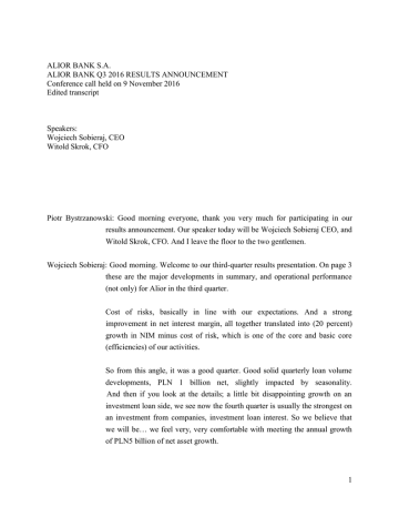 ALIOR BANK S.A. ALIOR BANK Q3 2016 RESULTS ANNOUNCEMENT Conference call held on 9 November 2016 Edited transcript Speakers: Wojciech Sobieraj, CEO Witold Skrok, CFO Piotr Bystrzanowski: Good morning everyone, thank you very much for participating in our results announcement. Our speaker today will be Wojciech Sobieraj CEO, and Witold Skrok, CFO. And I leave the floor to the two gentlemen. Wojciech Sobieraj: Good morning. Welcome to our third-quarter results presentation. On page 3 these are the major developments in summary, and operational performance (not only) for Alior in the third quarter. Cost of risks, basically in line with our expectations. And a strong improvement in net interest margin, all together translated into (20 percent) growth in NIM minus cost of risk, which is one of the core and basic core (efficiencies) of our activities. So from this angle, it was a good quarter. Good solid quarterly loan volume developments, PLN 1 billion net, slightly impacted by seasonality. And then if you look at the details; a little bit disappointing growth on an investment loan side, we see now the fourth quarter is usually the strongest on an investment from companies, investment loan interest. So we believe that we will be… we feel very, very comfortable with meeting the annual growth of PLN5 billion of net asset growth. 1 Third thing that I will comment on in the next few slides is the Alior and BPH Core merger, which is on track and not even… I think in a number of factors, we exceed our expectations. And I will follow on this on the next few pages. And last but not least, we are not stopping on our innovation growth, and with our artificial intelligence/robotic solution we were able to gain the reputation and recognition on, I would say, a global scale. We won both the innovation from America BAI and from EFMA in Europe. And this is on page 4, what is our Dronn, the virtual adviser. Basically this is the self-learning artificial intelligence tool that combines the learning with a speech engine. So we use this machine, basically, to call for the collection of the small amounts that calling by person is not efficient. As you know, all Polish banks and all European banks we are about to comply with the new FATCA regulations, basically, who is asking all the clients in Alior do you have a Green Card or not. So I think it was a perfect, basically, activity for machine learning and we will be using this together with biometrics that we will implement next year to service the clients in our daily activities with them. Now coming back to the more down to earth action. BPH Core merger on page 5. I must say the financial part of the transaction is over, now we are in a phase of basically reviewing the closing accounts and finalizing the transaction with GE. Last weekend was a very significant milestone in our transaction. First of all the BPH Bank was successfully demerged into the two parts, and we took control of the BPH Core. So now we are acting - we are operating still on two IT systems, two brands, but we are one Bank from the legal perspective. 2 We don't want to change at this stage our synergies which were calculated at PLN460 million annual synergies by the 2019. We will do that as soon as we have a full review and control of 2017 combined budget for us and BPH. We do see some potential for improvement here, but we need to look more carefully on both the number, PLN 460 million, and the timing to make it faster. We do feel comfortable, even now, to announce that we will bear less costs of integration - on integration side. It will be not PLN 650 million but PLN 500 million. And we do the integration and all these costs, and, potentially, the synergies - we achieve the synergies from the merger faster than we expected. Our operational merger took place one month ahead of schedule which gives us one more month to better prepare for March 25/March 31, 2017. On that date, we are planning to run the operational merger of Alior and BPH and thus, from this date, we will be running on the same IT system with all consequences for our clients, our employees, and branch networks and so on. So far, the BPH Core is on track. The next steps on page 7, as I described earlier is from November, well, the last week, and conversion to the full rebranding. We have plenty to do. And, well, this is my personal 28th banking merger in my life, and I think that I will make sure that this one will be the fastest and the most efficient one. I know that it sounds very ambitious to have a Bank fully merged in five months' time, but we have -- today we have 94 days between -- working days, between now and the merger, and I can assure you that we are working very hard to make it happen. Also, I think, quietly, we are creating probably the largest financially-related IT workforce in Poland. We have now more than 700 IT experts in combined BPH and Alior, and we're trying to make sure that these resources will be used 3 appropriately, i.e., we'll finish the operational merger as soon as possible and then they can move into the areas of growth. I've mentioned the biometrics. We have API and PSD2 projects running in 2017. We'll have to finish the new mobile/Internet platform and a number of other IT-related projects that we already launched or we will launch in 2017. If you go to page 8, this is, as you might recall, oh this is yours. I'm sorry. So Witold will go with the numbers, I'm sorry. Witold Skrok: Wojciech just mentioned that when we reached the agreement with GE, one of the conditions was that BPH management team would perform; we call it, a restructuring program. And we had two main components of that. Reduction of FTEs and reduction of branches. In two ways: conversion and closing. So if, and those targets we expect to be achieved by the end of 2016. But if you look at where we are, we are well ahead of all of them and we have still two months to do. So the figures, which you find on the slide 8, prove th