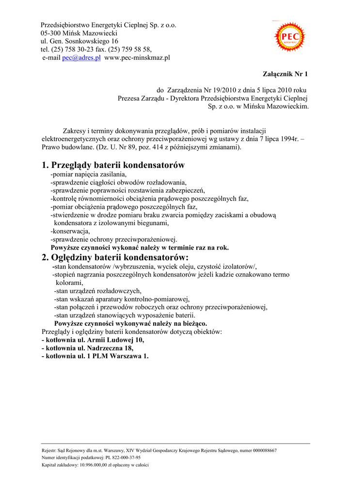 Przedsiębiorstwo Energetyki Cieplnej Sp. z o.o. 05-300 Mińsk Mazowiecki ul. Gen. Sosnkowskiego 16 tel. (25) 758 30-23 fax. (25) 759 58 58, e-mail [email protected] www.pec-minskmaz.pl Załącznik Nr 1 do Zarządzenia Nr 19/2010 z dnia 5 lipca 2010 roku Prezesa Zarządu - Dyrektora Przedsiębiorstwa Energetyki Cieplnej Sp. z o.o. w Mińsku Mazowieckim. Zakresy i terminy dokonywania przeglądów, prób i pomiarów instalacji elektroenergetycznych oraz ochrony przeciwporaŜeniowej wg ustawy z dnia 7 lipca 1994r. – Prawo budowlane. (Dz. U. Nr 89, poz. 414 z późniejszymi zmianami). 1. Przeglądy baterii kondensatorów -pomiar napięcia zasilania, -sprawdzenie ciągłości obwodów rozładowania, -sprawdzenie poprawności rozstawienia zabezpieczeń, -kontrolę równomierności obciąŜenia prądowego poszczególnych faz, -pomiar obciąŜenia prądowego poszczególnych faz, -stwierdzenie w drodze pomiaru braku zwarcia pomiędzy zaciskami a obudową kondensatora z izolowanymi biegunami, -konserwacja, -sprawdzenie ochrony przeciwporaŜeniowej. PowyŜsze czynności wykonać naleŜy w terminie raz na rok. 2. Oględziny baterii kondensatorów: -stan kondensatorów /wybrzuszenia, wyciek oleju, czystość izolatorów/, -stopień nagrzania poszczególnych kondensatorów jeŜeli kadzie oznakowano termo kolorami, -stan urządzeń rozładowczych, -stan wskazań aparatury kontrolno-pomiarowej, -stan połączeń i przewodów roboczych oraz ochrony przeciwporaŜeniowej, -stan urządzeń stanowiących wyposaŜenie baterii. PowyŜsze czynności wykonywać naleŜy na bieŜąco. Przeglądy i oględziny baterii kondensatorów dotyczą obiektów: - kotłownia ul. Armii Ludowej 10, - kotłownia ul. Nadrzeczna 18, - kotłownia ul. 1 PLM Warszawa 1. Rejestr: Sąd Rejonowy dla m.st. Warszawy, XIV Wydział Gospodarczy Krajowego Rejestru Sądowego, numer 0000088667 Numer identyfikacji podatkowej: PL 822-000-37-95 Kapitał zakładowy: 10.996.000,00 zł opłacony w całości Przedsiębiorstwo Energetyki Cieplnej Sp. z o.o. 05-300 Mińsk Mazowiecki ul. Gen. Sosnkowskiego 16 tel. (25) 758 30-23 fax. (25) 759 58 58, e-mail [email protected] www.pec-minskmaz.pl Rejestr: Sąd Rejonowy dla m.st. Warszawy, XIV Wydział Gospodarczy Krajowego Rejestru Sądowego, numer 0000088667 Numer identyfikacji podatkowej: PL 822-000-37-95 Kapitał zakładowy: 10.996.000,00 zł opłacony w całości