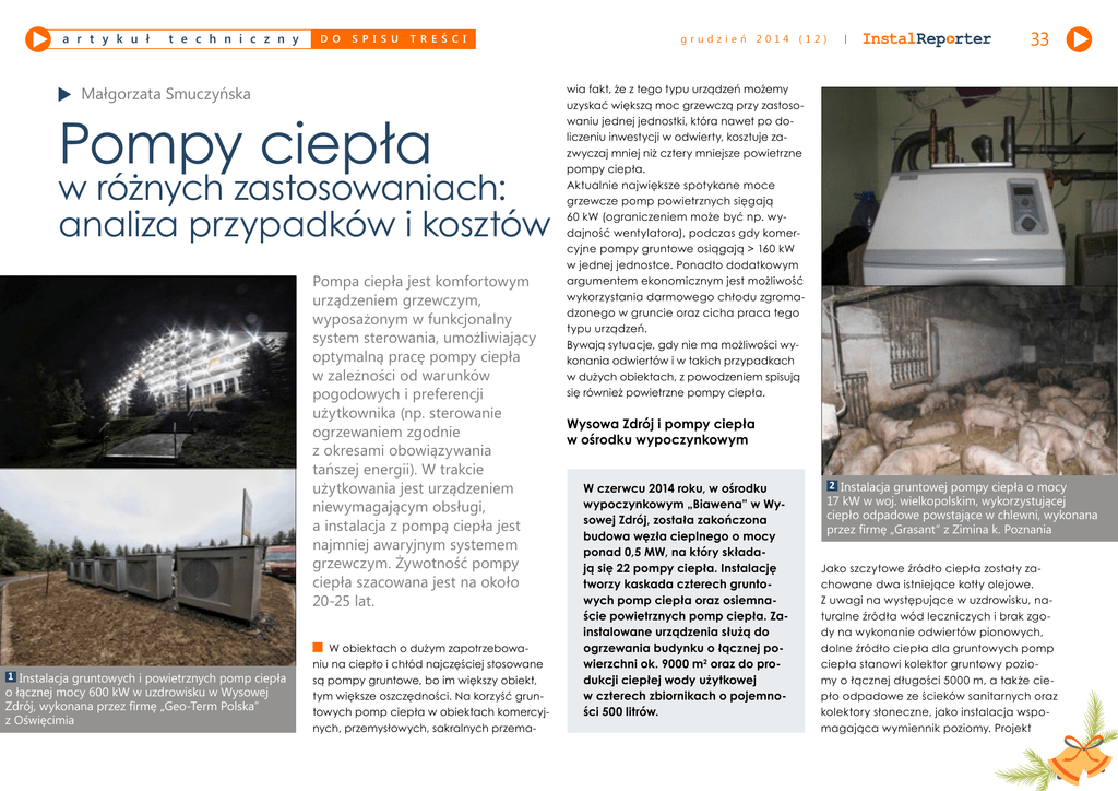 a r t y k u ł t e c h n i c z n y d o s p i s u t r e ś c i Małgorzata Smuczyńska Pompy ciepła w różnych zastosowaniach: analiza przypadków i kosztów Pompa ciepła jest komfortowym urządzeniem grzewczym, wyposażonym w funkcjonalny system sterowania, umożliwiający optymalną pracę pompy ciepła w zależności od warunków pogodowych i preferencji użytkownika (np. sterowanie ogrzewaniem zgodnie z okresami obowiązywania tańszej energii). W trakcie użytkowania jest urządzeniem niewymagającym obsługi, a instalacja z pompą ciepła jest najmniej awaryjnym systemem grzewczym. Żywotność pompy ciepła szacowana jest na około 20-25 lat. 1 Instalacja gruntowych i powietrznych pomp ciepła o łącznej mocy 600 kW w uzdrowisku w Wysowej Zdrój, wykonana przez firmę „Geo-Term Polska” z Oświęcimia W obiektach o dużym zapotrzebowaniu na ciepło i chłód najczęściej stosowane są pompy gruntowe, bo im większy obiekt, tym większe oszczędności. Na korzyść gruntowych pomp ciepła w obiektach komercyjnych, przemysłowych, sakralnych przema- grudzień 2014 (12) 33 wia fakt, że z tego typu urządzeń możemy uzyskać większą moc grzewczą przy zastosowaniu jednej jednostki, która nawet po doliczeniu inwestycji w odwierty, kosztuje zazwyczaj mniej niż cztery mniejsze powietrzne pompy ciepła. Aktualnie największe spotykane moce grzewcze pomp powietrznych sięgają 60 kW (ograniczeniem może być np. wydajność wentylatora), podczas gdy komercyjne pompy gruntowe osiągają > 160 kW w jednej jednostce. Ponadto dodatkowym argumentem ekonomicznym jest możliwość wykorzystania darmowego chłodu zgromadzonego w gruncie oraz cicha praca tego typu urządzeń. Bywają sytuacje, gdy nie ma możliwości wykonania odwiertów i w takich przypadkach w dużych obiektach, z powodzeniem spisują się również powietrzne pompy ciepła. Wysowa Zdrój i pompy ciepła w ośrodku wypoczynkowym W czerwcu 2014 roku, w ośrodku wypoczynkowym „Biawena” w Wysowej Zdrój, została zakończona budowa węzła cieplnego o mocy ponad 0,5 MW, na który składają się 22 pompy ciepła. Instalację tworzy kaskada czterech gruntowych pomp ciepła oraz osiemnaście powietrznych pomp ciepła. Zainstalowane urządzenia służą do ogrzewania budynku o łącznej powierzchni ok. 9000 m2 oraz do produkcji ciepłej wody użytkowej w czterech zbiornikach o pojemności 500 litrów. 2 Instalacja gruntowej pompy ciepła o mocy 17 kW w woj. wielkopolskim, wykorzystującej ciepło odpadowe powstające w chlewni, wykonana przez firmę „Grasant” z Zimina k. Poznania Jako szczytowe źródło ciepła zostały zachowane dwa istniejące kotły olejowe. Z uwagi na występujące w uzdrowisku, naturalne źródła wód leczniczych i brak zgody na wykonanie odwiertów pionowych, dolne źródło ciepła dla gruntowych pomp ciepła stanowi kolektor gruntowy poziomy o łącznej długości 5000 m, a także ciepło odpadowe ze ścieków sanitarnych oraz kolektory słoneczne, jako instalacja wspomagająca wymiennik poziomy. Projekt a r t y k u ł t e c h n i c z n y d o s p i s u Gruntowa pompy ciepła w oczyszczalni ścieków w Czorsztynie 3 Instalacja gruntowej pompy ciepła o mocy 17 kW w oczyszczalni ścieków w Czorsztynie, wykorzystującej ciepło ścieków, wykonana przez firmę „Leski” z Nowego Targu związany z termomodernizacją budynku sanatoryjno-leczniczego „Biawena”, z zastosowaniem gruntowych i powietrznych pomp ciepła wraz z kolektorem gruntowym poziomym wspomaganym instalacjami solarnymi oraz odzysku ciepła ze ścieków, uzyskał dofinansowanie ze środków UE. Wysokość dotacji wyniosła 60% kosztów kwalifikowalnych inwestycji. Wykorzystanie ciepła technologicznego Hodując świnie czy krowy, można uzyskać wiele ciepła odpadowego. Coraz większa liczba hodowców inwestuje w instalacje pozyskujące ciepło z obornika. Pętle kolekto- ra umieszcza się w kanałach odprowadzających nieczystości z np. chlewni. Kolektor odbiera ciepło z odchodów, które następnie przekazywane jest do pompy ciepła. W Polsce istnieją gospodarstwa rolne, w których inwestycja w pompę ciepła wykorzystującą ciepło z obornika przyniosła ogromne oszczędności w ciągu kilku lat. Oczyszczalnia ścieków może być ogrzewana wyłącznie przy wykorzystaniu ciepła oczyszczanych w niej ścieków. Ścieki znajdujące się na oczyszczalni mają temperaturę od kilku do dwudziestu kilku °C, w zależności od pory roku oraz od tego, na jakim etapie procesu oczyszczania się znajdują w danej chwili. Taki zakres temperatury stanowi wręcz doskonałe i niewyczerpalne dolne źródło pomp ciepła, które oprócz potrzeb cieplnych oczyszczalni mogą zapewniać chłodzenie, produkcję ciepłej wody użytkowej, podgrzew osadów ściekowych. Energia elektryczna do zasilania pomp może pochodzić z elektrociepłowni biogazowej lub z sieci elektrycznej. 34 grudzień 2014 (12) t r e ś c i W czerwcu 2014 roku w miejscowości Czorsztyn została oddana do użytku nowo wybudowana oczyszczalnia ścieków Podhalańskiego Przedsiębiorstwa Kanalizacyjnego z Nowego Targu. Modernizacja i rozbudowa oczyszczalni ścieków skutkuje nie tylko poprawą jakości ścieków odprowadzanych do Jeziora Czorsztyńskiego, lecz także redukcją kosztów utrzymania i eksploatacji obiektu, przy jak najmniejszej ingerencji w środowisko naturalne. Najtańszym i najbardziej ekologicznym źródłem ciepła okazała się gruntowa pompa ciepła, która ogrzewa budynek oczyszczalni wyłącznie przy wykorzystaniu ciepła oczyszczanych w niej ścieków. Obejrzyj Film z oczyszczalni ścieków w Czorsztynie Wymiennik ciepła w postaci rur polietylenowych wypełnionych niezamarzającym czynnikiem, został ułożony na ścianach zbiornika wody oczyszczonej. Budynek jednorodzinny koło Ozorkowa W domu mieszkalnym jednorodzinnym o powierzchni użytkowej 120 m2 położonym w okolicach Ozorkowa, w listopadzie 2010 r. została zamontowana powietrzna pomp