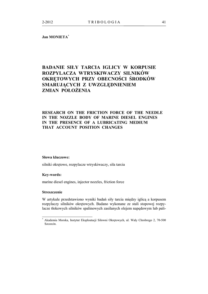 2-2012 TRIBOLOGIA 41 Jan MONIETA* BADANIE SIŁY TARCIA IGLICY W KORPUSIE ROZPYLACZA WTRYSKIWACZY SILNIKÓW OKRĘTOWYCH PRZY OBECNOŚCI ŚRODKÓW SMARUJĄCYCH Z UWZGLĘDNIENIEM ZMIAN POŁOŻENIA RESEARCH ON THE FRICTION FORCE OF THE NEEDLE IN THE NOZZLE BODY OF MARINE DIESEL ENGINES IN THE PRESENCE OF A LUBRICATING MEDIUM THAT ACCOUNT POSITION CHANGES Słowa kluczowe: silniki okrętowe, rozpylacze wtryskiwaczy, siła tarcia Key-words: marine diesel engines, injector nozzles, friction force Streszczenie W artykule przedstawiono wyniki badań siły tarcia między iglicą a korpusem rozpylaczy silników okrętowych. Badano wykonane ze stali stopowej rozpylacze tłokowych silników spalinowych zasilanych olejem napędowym lub pali* Akademia Morska, Instytut Eksploatacji Siłowni Okrętowych, ul. Wały Chrobrego 2, 70-500 Szczecin. 42 TRIBOLOGIA 2-2012 wem pozostałościowym. Do badań wybrano rozpylacze spośród eksploatowanych w naturalnych warunkach, w których stwierdzono stan niezdatności lub wymieniono je profilaktycznie. Badano rozpylacze przy obecności paliwa lub oleju o zbliżonych własnościach, jak również wykonano pomiary czasów wysuwania się iglic z korpusów rozpylaczy dla stopniowanych ich położeń w płaszczyznach względem osi podłużnej w korpusie rozpylacza. Wykonano pomiary geometryczne par precyzyjnych i badano wpływ wymiarów oraz błędów kształtu i położenia części prowadzących na wartości sił tarcia. Badano wpływ położenia kątowego iglicy względem korpusu rozpylacza i mierzono również luz średnicowy między korpusem a iglicą rozpylacza oraz badano jego wpływ na wartość maksymalnej siły tarcia. Badania siły tarcia przeprowadzono na dwóch stanowiskach, w zależności od jej wartości. Pierwsze z nich wykonane było we własnym zakresie do wyznaczania maksymalnej siły tarcia z wykorzystaniem obciążania siłami ciężkości, a drugie stanowisko przeznaczone było do badań wytrzymałości próbek na rozciąganie. Na wartość maksymalnej siły tarcia między korpusem i iglicą rozpylacza ma wpływ stan współpracujących powierzchni oraz ich wzajemne usytuowanie, zanieczyszczenia itp. Przeprowadzone badania miały na celu wyznaczenie składowej siły tarcia i/lub czasu wysuwania się iglicy w zależności od kąta obrotu iglicy w korpusie rozpylacza, od luzu, rodzaju zastosowanych środków smarowych oraz masy iglicy. WSTĘP Rozpylacze wtryskiwaczy okrętowych silników spalinowych są eksploatowane w bardzo niesprzyjających warunkach przy oddziaływaniach wysokich ciśnień paliwa oraz poddane są obciążeniom cieplnym, mechanicznym i chemicznym [L. 3, 5, 6]. W wyniku tych wymuszeń, przy oddziaływaniu różnych czynników zewnętrznych, dochodzi do intensywnego tarcia, zużycia i uszkodzeń, zmian parametrów konstrukcyjnych rozpylaczy oraz przejścia ze stanu zdatności do stanu dopuszczalnego lub stanu niezdatności [L. 2, 11]. Stan techniczny rozpylaczy zdeterminowany jest wartościami cech, takich jak [L. 1–4, 9, 17]: wymiary geometryczne, wzajemne luzy elementów współpracujących, stan powierzchni w węzłach tribologicznych itd. Badania tribologiczne, teoretyczne i eksperymentalne mogą dotyczyć procesów i zjawisk występujących podczas tarcia, zużycia i smarowania. W rozpylaczach wtryskiwaczy występuje również tarcie mieszane, a na wartość siły tarcia ma wpływ stan współpracujących powierzchni oraz rodzaj i jakość sto- 2-2012 TRIBOLOGIA 43 sowanych paliw. Czynniki te mają istotny wpływ na trwałość i niezawodność rozpylaczy. Utrata stanu zdatności węzła tarcia może nastąpić na skutek zmian własności fizycznych warstwy wierzchniej spowodowanych tarciem i prowadzących do wzrostu oporów ruchu w stopniu przekraczającym poziom dopuszczalny [L. 2, 5, 8]. W parze iglica korpus − rozpylacza obciążenie działa głównie wzdłuż osi iglicy. Naciski boczne mogą wystąpić wskutek błędów kształtu i położenia, sprężystych odkształceń oraz obciążeń działaniem ciśnienia paliwa na powierzchnie w szczelinach między korpusem a iglica rozpylacza [L. 7, 14, 16]. W parze iglica–korpus rozpylacza obciążenie działa głównie wzdłuż osi iglicy. Naciski boczne mogą wystąpić wskutek błędów kształtu i położenia, obciążenia montażowego i odkształceń oraz sił powstałych w wyniku przebiegu ciśnienia paliwa w szczelinie między korpusem i iglicą rozpylacza [L. 7, 14, 16]. Powierzchnie tarcia smarowane są paliwem zasadniczo wskutek przecieków. Występuje tam siła tarcia uzależniona od własności paliwa, prędkości poślizgu, a przy tarciu mieszanym od nacisków i współczynnika tarcia [L. 17]: T = f(P, u, Xch) (1) gdzie: P − obciążenie, u − prędkość ślizgania, Xch − właściwości tribologiczne czynnika. Jeżeli elementy rozpylacza nie zmieniają względem siebie położenia, to występuje między nimi tarcie spoczynkowe, a tarcie ruchowe, gdy znajdują w ruchu względnym [L. 13]. W przypadku unieruchomienia iglicy rozpylacze tracą szczelność i do cylindra przedostaje się dodatkowa ilość paliwa, którego spalanie następuje bez dostatecznej ilości tlenu. Wówczas na powierzchniach rozpylacza powstają osady. Zawieszaniu iglic sprzyja obecność niektórych składników w paliwie (np. wody, zanieczyszczeń, siarki) i osadów wewnątrz rozpylacza. Jeżeli iglica ulegnie częściowemu zakleszczeniu, to jej wznios następuje przy wyższym ciśnieniu paliwa i z inną prędkością. Zmniejszenie szczelności przylegania stożków uszczelniających iglicy i korpusu rozpylacza powoduje przedostawanie się gorących gazów z komory spalania do wewnątrz rozpylacza. W wyniku tego powierzchnie rozpylacza nagrzewają się i następuje zacieranie się iglicy, będące skutkiem utraty smarowania, wzrostu temperatury, odkształceń i występowania osadów. Zatarcie jest definiowane jako zahamowanie ruchu względnego elementów pary trącej [L. 15]. Zatarcie j